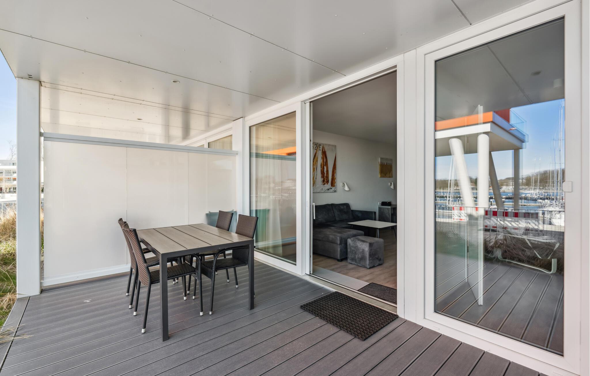 Tillbringa din semester på Östersjöstranden och njut av komforten, utsikten över segelhamnen och Traves mynning. Du kan njuta av sommaren på den stora terrassen och få en glimt av de skandinaviska färjorna som passerar förbi. Njut av en vacker utsikt över Trave och marinan, njut av de imponerande färjorna som passerar och Travemündes gavelhus i bakgrunden.