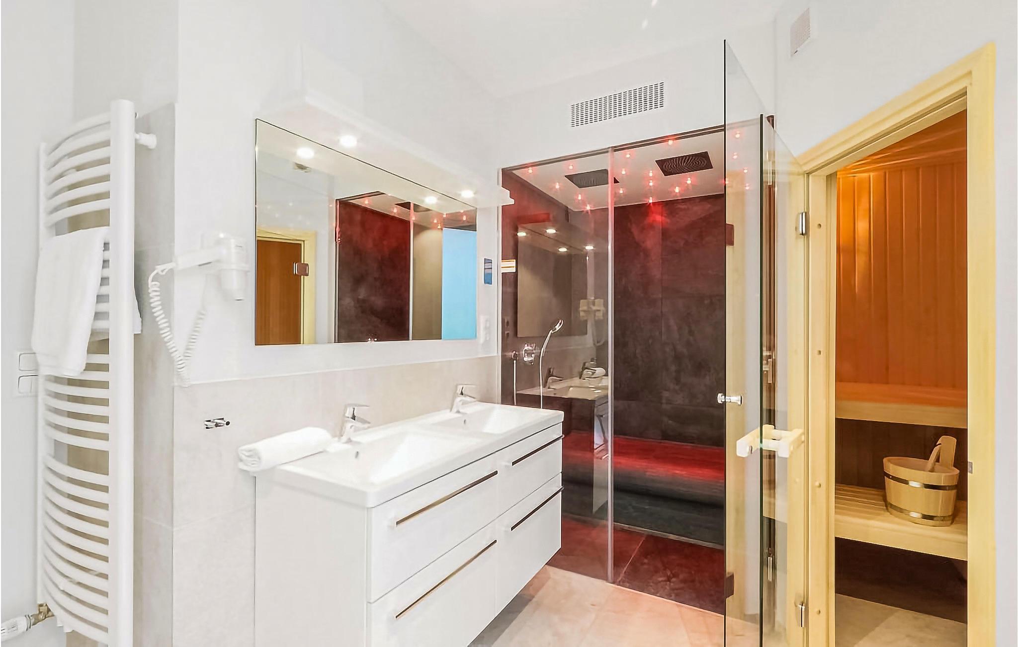 Lägenheten är elegant, möblerad med hög standard och modern. En speciell höjdpunkt är badrummet, din personliga lilla wellnessavdelning med bastu, bubbelpool och ångbad med integrerad dubbel regndusch. Feelgood-programmet fortsätter i vardagsrummet, där de fladdrande lågorna från bioetanolspisen badar rummet i ett särskilt mysigt ljus. Soffan kan omvandlas till två bekväma sovplatser med bara några enkla handgrepp.
