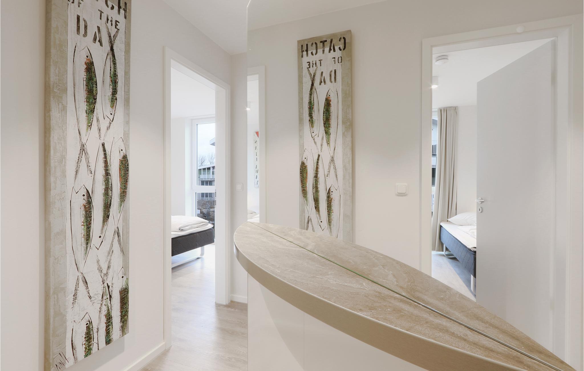 Det finns två sovrum, vart och ett med en rymlig dubbelsäng. Det tredje sovrummet är möblerat med två enkelsängar. I badrummet väntar en privat wellness-oas med golvvärme, ångbad och regndusch. Avsluta en stormig dag vid havet här. Bioetanolspisen, vars ljus ger vardagsrummet en mysig atmosfär, är också lämplig för detta.
