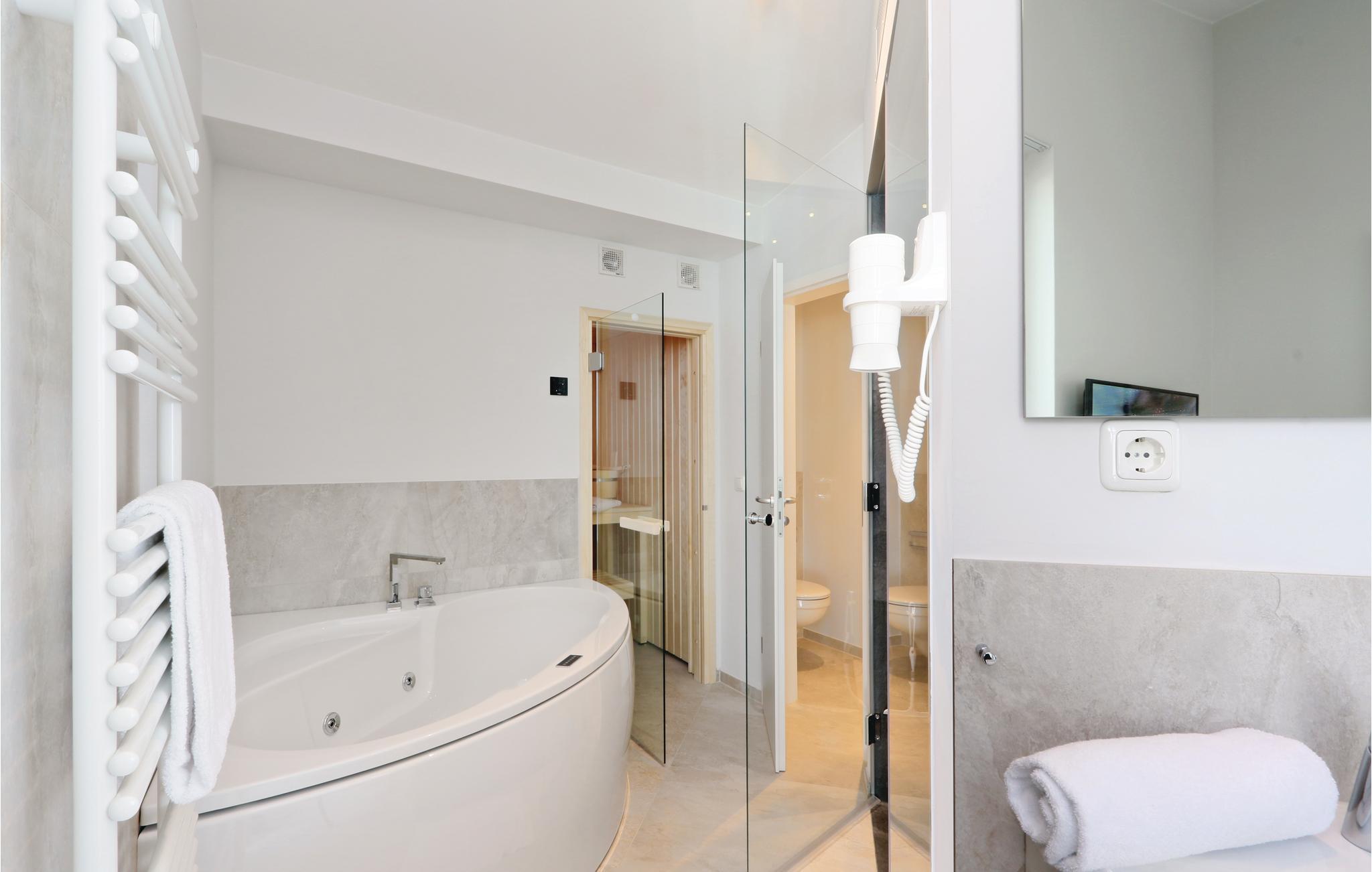 Badrummet med öppen planlösning är en privat wellnessavdelning med ångbad och dubbel regndusch och nås via sovrummet. Du kan också koppla av i bastun eller bubbelpoolen. Semesterlägenheten har också ett modernt underhållningssystem med Blu-Ray-spelare, två platt-TV-apparater och en musikanläggning med MP3-anslutning.