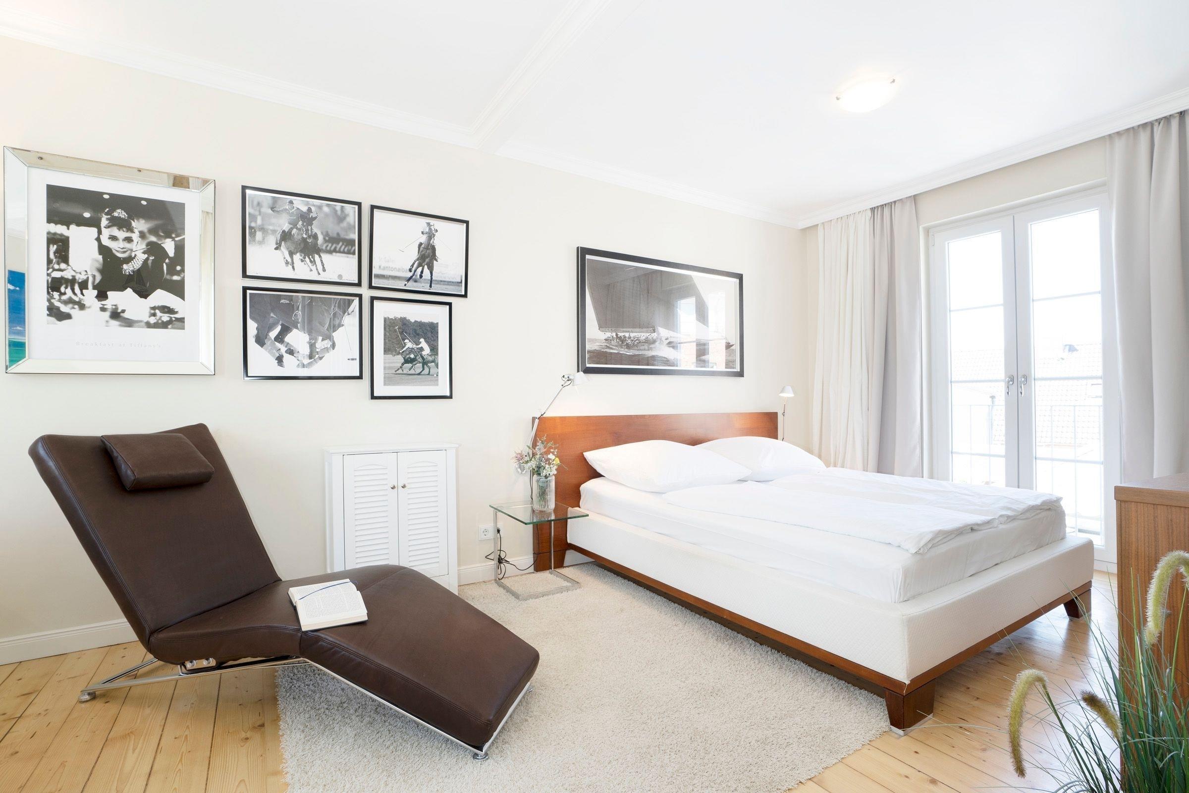 Schlafzimmer 2 (1.OG): 1 Doppelbett (160x200 cm), Verdunkelung (Gardinen), Kleiderschrank, Platz für Kinderreisebett, außerdem: Schreibtisch, Sideboard, elektr. Relaxliege, TV