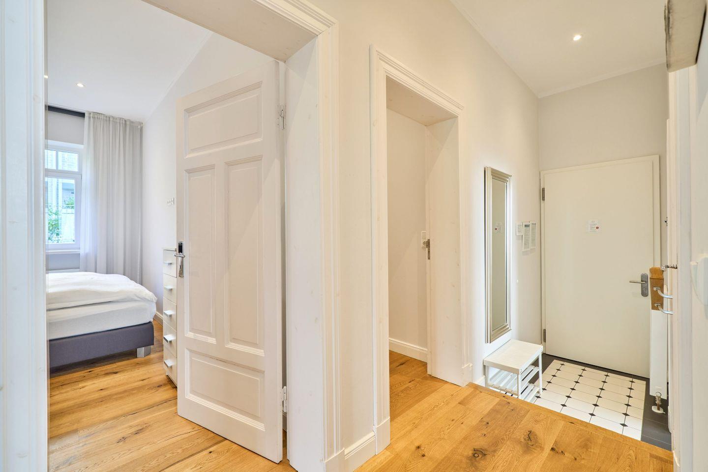 Villa Daheim Travemünde – Luxus pur in der Kaiserallee. Auf 105 m² bietet die Ferienwohnung Villa Daheim alles, was man sich für einen entspannten Urlaub an der Ostsee wünscht. Die luxuriöse Ferienwohnung liegt in der ruhigen zweiten Reihe an der Kaiserallee, nur 50 m vom Ostseestrand entfernt. Das Zentrum von Travemünde ist in etwa 15 Gehminuten über die Promenade erreichbar. Die Wohnung befindet sich in einer stilvollen Bäderstil-Villa, die kürzlich kernsaniert und modern eingerichtet wurde. Mit drei Zimmern, zwei Schlafzimmern, einer großzügigen Veranda und einer voll ausgestatteten Küche bietet die Wohnung Platz für bis zu vier Gäste. Große bodentiefe Fenster im Wohnzimmer sorgen für eine helle Atmosphäre und der Zugang zur sonnigen, südlich ausgerichteten Veranda mit Blick ins Grüne lädt zum Entspannen ein. Ein privater Strandkorb auf der Veranda sowie der Zugang zum Gemeinschaftsgarten sorgen für zusätzliche Erholung. In beiden Schlafzimmern stehen komfortable Boxspring-Doppelbetten und ausreichend Stauraum in den Kleiderschränken zur Verfügung. Das Badezimmer bietet eine Badewanne, Dusche und WC. Eine Waschmaschine zur freien Nutzung befindet sich im Waschkeller. Für Unterhaltung sorgen ein großer LED-TV mit Kabelanschluss im Wohnzimmer, ein weiterer TV im Schlafzimmer sowie eine Stereoanlage mit Radio und CD-Funktion. Die geschmackvolle und moderne Einrichtung auf 105 m² lässt keine Wünsche offen. Für Ihren Komfort ist ein privater Stellplatz direkt vor dem Haus vorhanden, und Ihre Fahrräder können sicher und trocken im eigenen Fahrradschuppen untergebracht werden. Villa Daheim in Travemünde bietet Luxus, modernes Ambiente und Altbaucharme in strandnaher Lage an der Kaiserallee und ist die perfekte Unterkunft für einen unvergesslichen Ostseeurlaub.