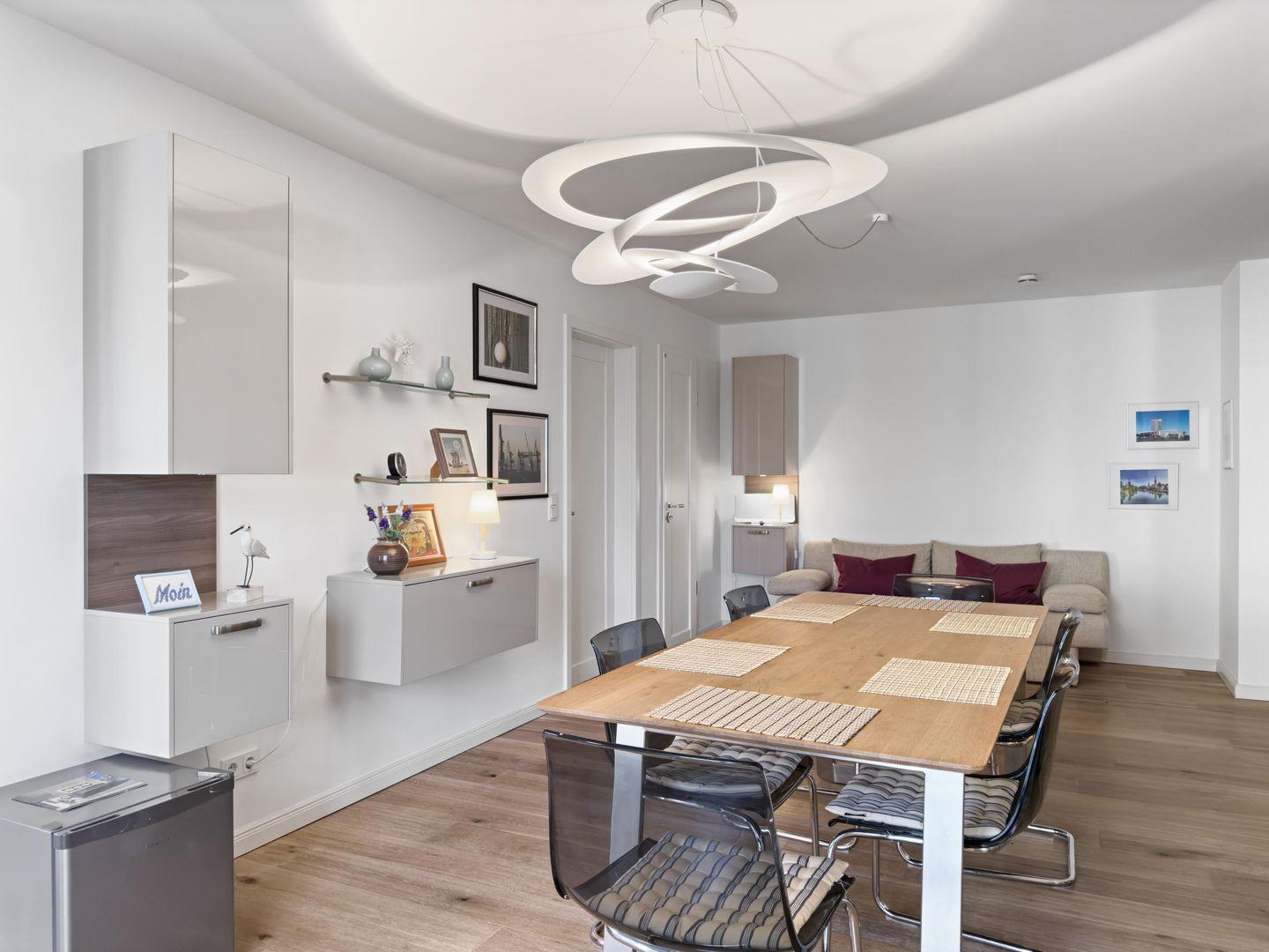 Dieses barrierefreie 3-Zimmer-Apartment im 2. OG bietet auf ca. 130 m² modernen Komfort und großzügigen Platz für Ihren Aufenthalt. Die Wohnung verfügt über ein Vollbad mit Dusche und Sauna sowie ein zusätzliches barrierefreies Duschbad und ein Gäste-WC. Zwei Schlafzimmer mit Doppelbetten und TV bieten eine erholsame Nachtruhe. Die gut ausgestattete Einbauküche mit separatem Essplatz lädt zum Kochen und Genießen ein. Der Wohnbereich mit Wintergarten lässt sich bei schönem Wetter öffnen und bietet zusätzlich Platz zum Entspannen. Für Unterhaltung sorgen TV, Musikanlage und WLAN. Ein Waschtrockner sowie ein Kinderbett und Hochstuhl sind ebenfalls vorhanden. Ein Tiefgaragenstellplatz rundet das Angebot ab. Direkt im Zentrum gelegen, genießen Sie hier die Nähe zu allen Bäckern, Geschäften und Restaurants.