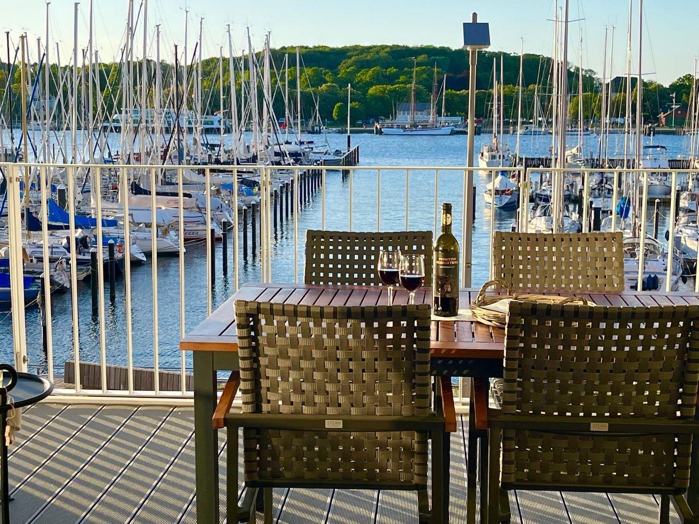 Der große überdachte Balkon mit Gartenmöbeln ist der perfekte Ort, um die Sonne zu genießen oder abends bei einem Glas Wein den Blick auf die Trave, den Yachthafen und die vorbeiziehenden Skandinavien-Fähren zu erleben.