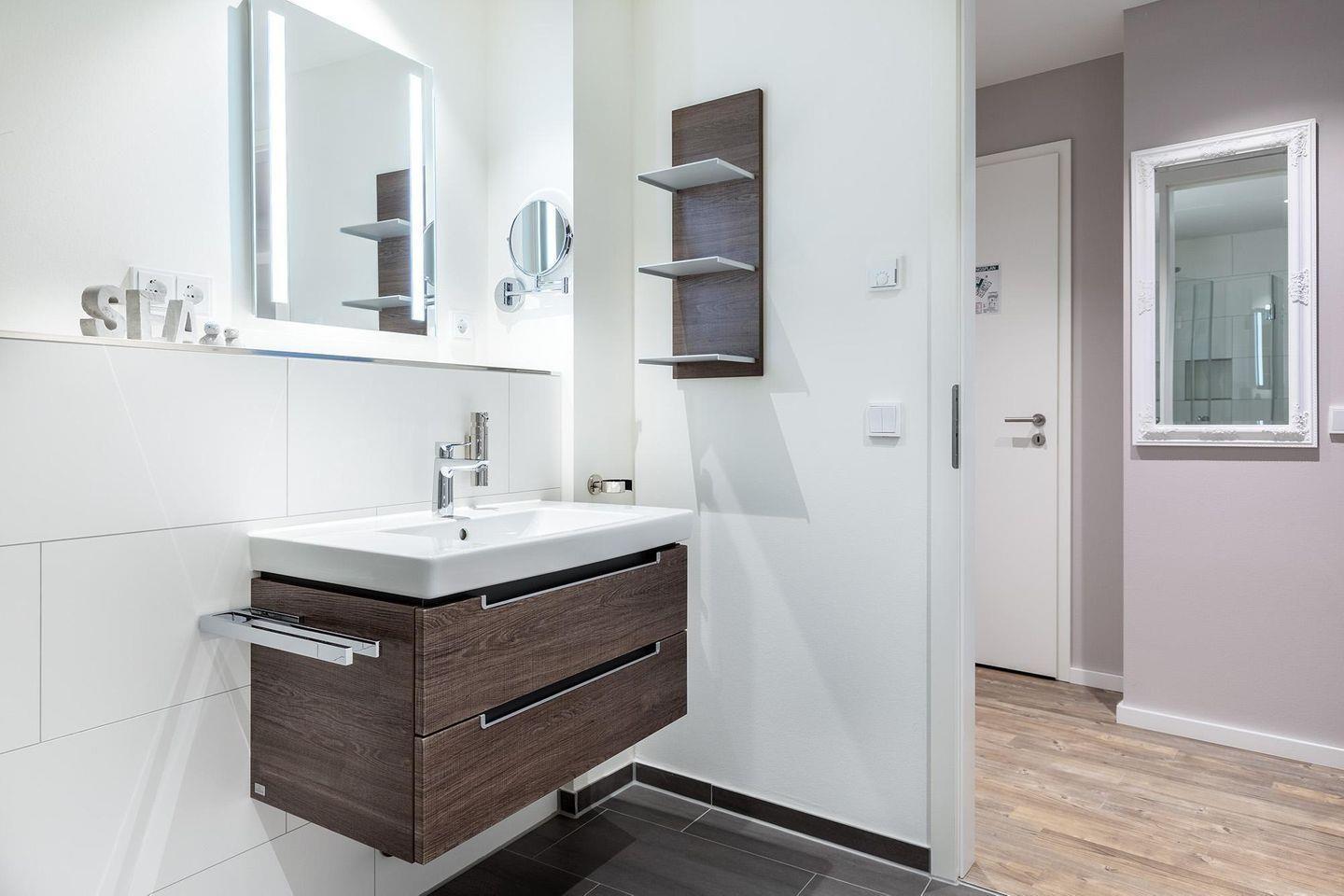 Das stilvolle Badezimmer ist mit einer ebenerdigen Dusche, WC, Waschtisch, Föhn, Kosmetikspiegel, Handtuchheizkörper und Fußbodenheizung ausgestattet – hier starten Sie angenehm frisch in den Tag.