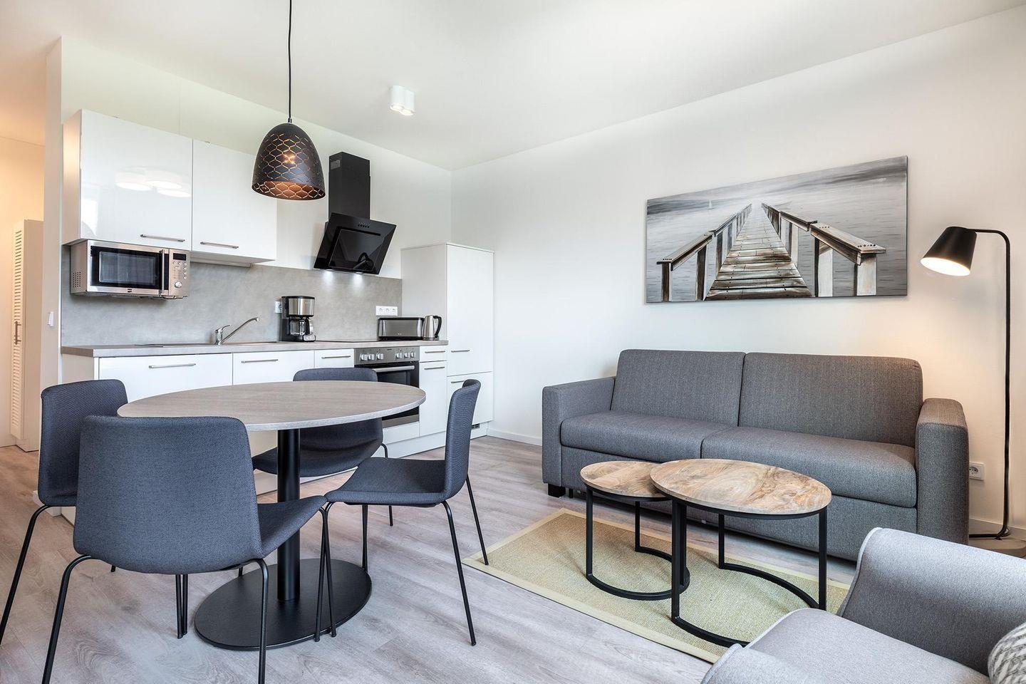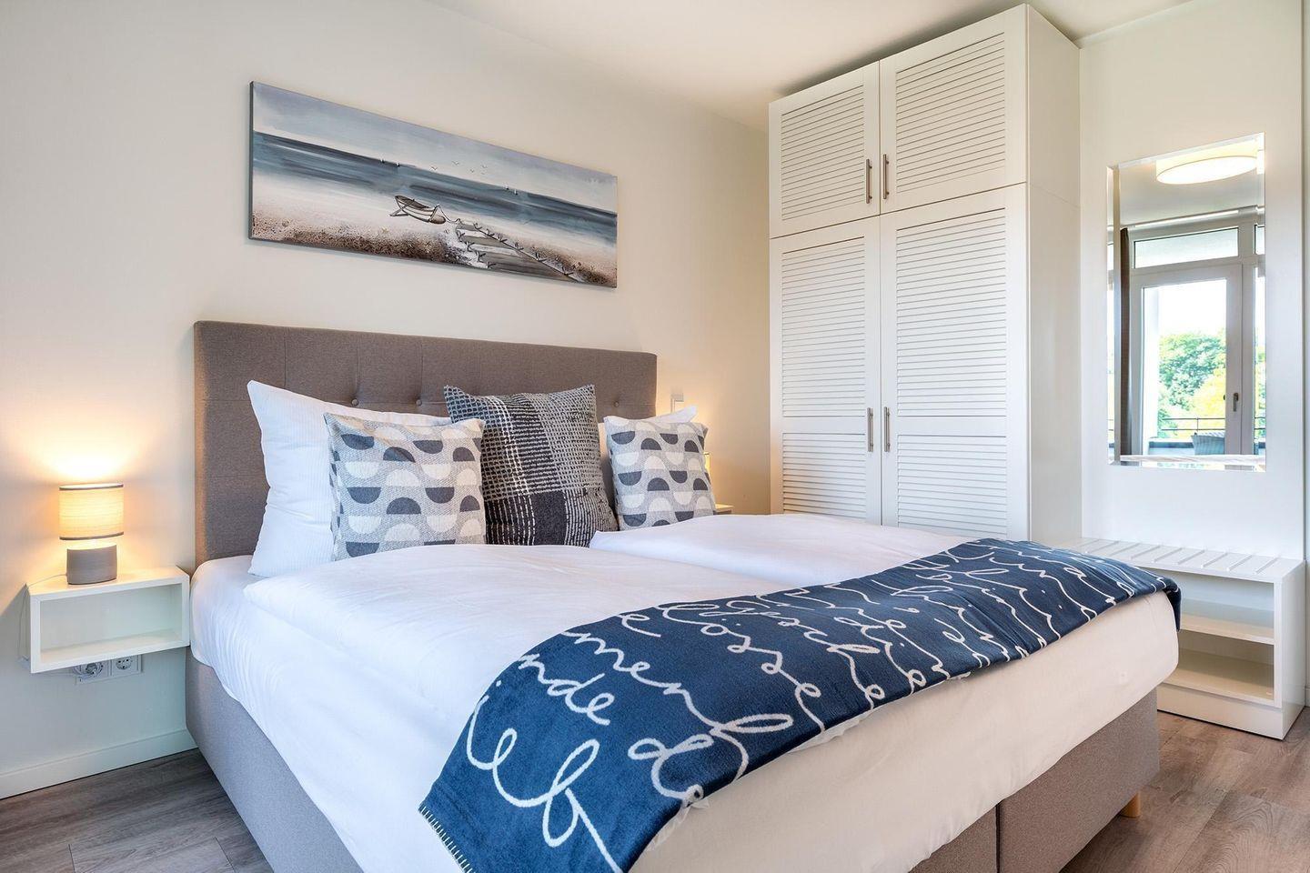 Das Apartment überzeugt durch elegante Gestaltung und hochwertige Materialien. Fußbodenheizung, bodentiefe Fenster mit Sonnenschutzverglasung und kostenfreies WLAN sorgen für hohen Wohnkomfort. Der Wohnbereich mit Doppelschlafcouch (1,40 × 2,00?m) und großem Flatscreen-TV sowie das separate Schlafzimmer mit Boxspringbett (1,80 × 2,00?m) und Flatscreen-TV schaffen ein behagliches Ambiente.