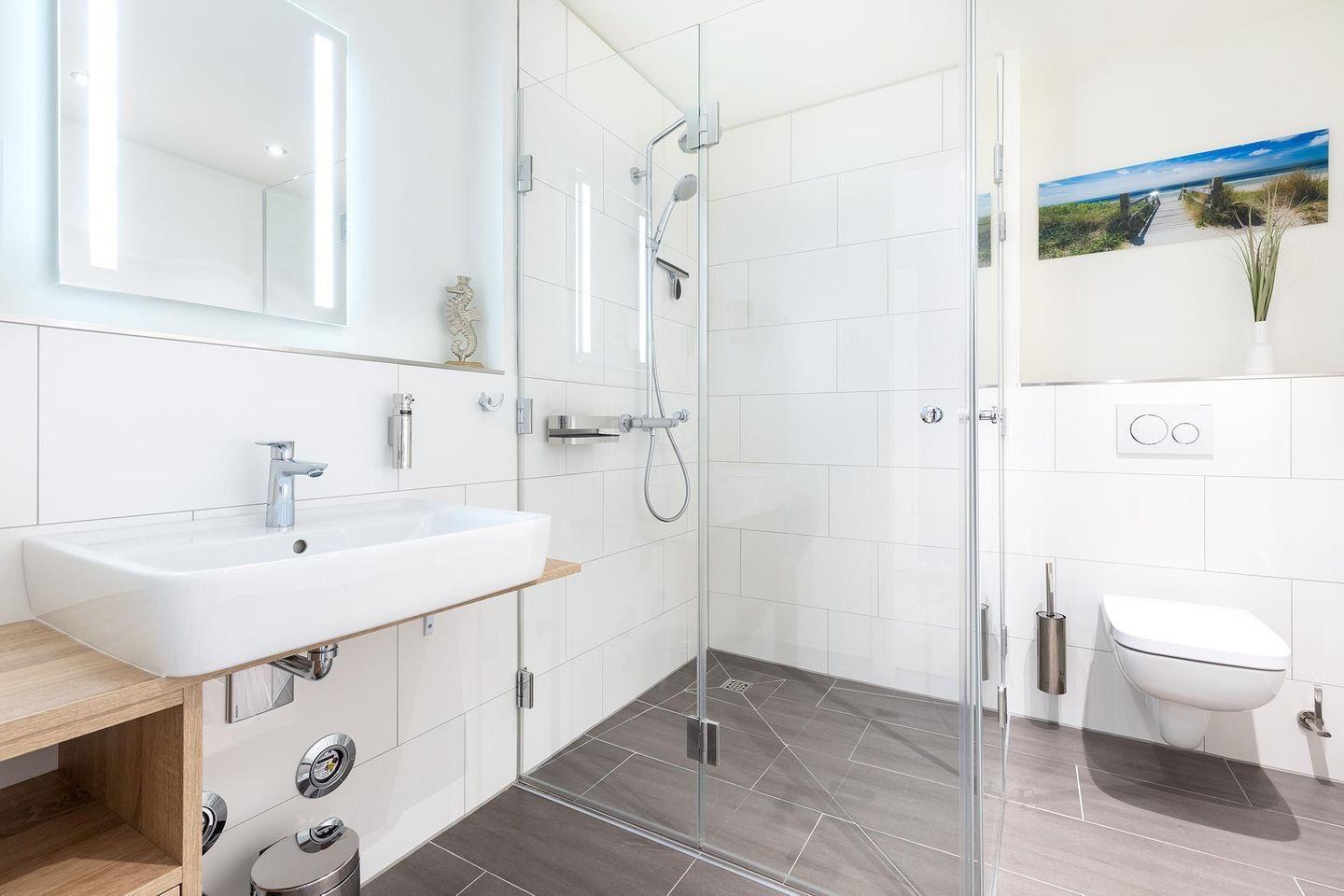 Ein echtes Plus sind die zwei eleganten Badezimmer, die Ihnen morgens wie abends ein Maximum an Komfort bieten. Eines ist mit einer ebenerdigen Dusche, das andere mit einer Badewanne ausgestattet. Beide verfügen über WC, Waschtisch, Föhn, Kosmetikspiegel, Handtuchheizkörper und selbstverständlich Fußbodenheizung.