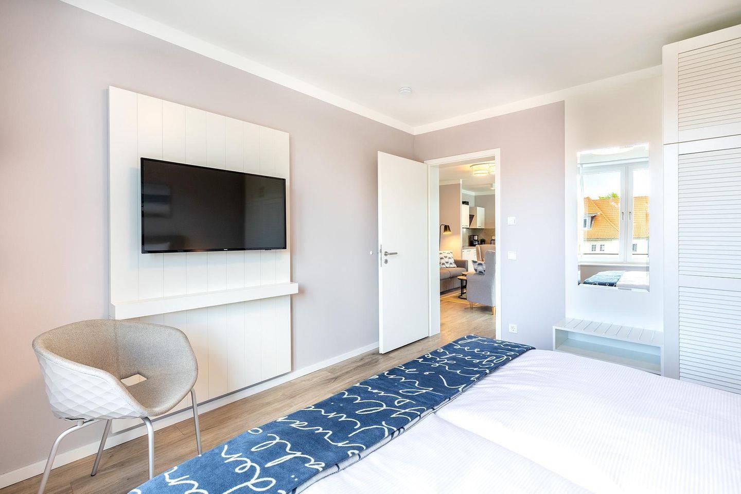 In den zwei separaten Schlafzimmern, die nach Norden ausgerichtet und somit angenehm ruhig gelegen sind, erwarten Sie hochwertige Boxspringbetten für besten Schlafkomfort. Jedes Schlafzimmer ist zusätzlich mit einem eigenen Flatscreen-TV ausgestattet – ideal für ungestörte Rückzugsmomente.