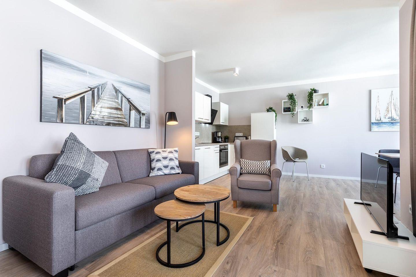 Der offene Wohn-Essbereich lädt zum Verweilen ein: Hier erwartet Sie eine bequeme Doppelschlafcouch und ein großer Flatscreen-TV, sodass auch entspannte Abende im Apartment zum Genuss werden.