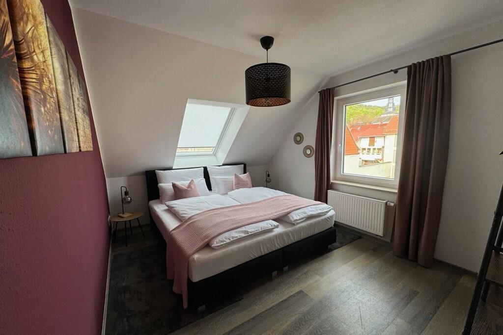 Welcome to MARKINA & this luxurious penthouse apartment in the heart of Treffurt at the foot of the "Normanstein Castle" that offers you everything for a stay in Treffurt: # Two-sided terrace with seating/dining area and awning # Elevator to the apartment # super central within walking distance to the city center and the Werra # free parking in front of the house # E-charging station # large Smart TV with Netflix # 3 bedrooms with box spring beds # bathroom and guest toilet # fully equipped kitchen # locked bicycle room