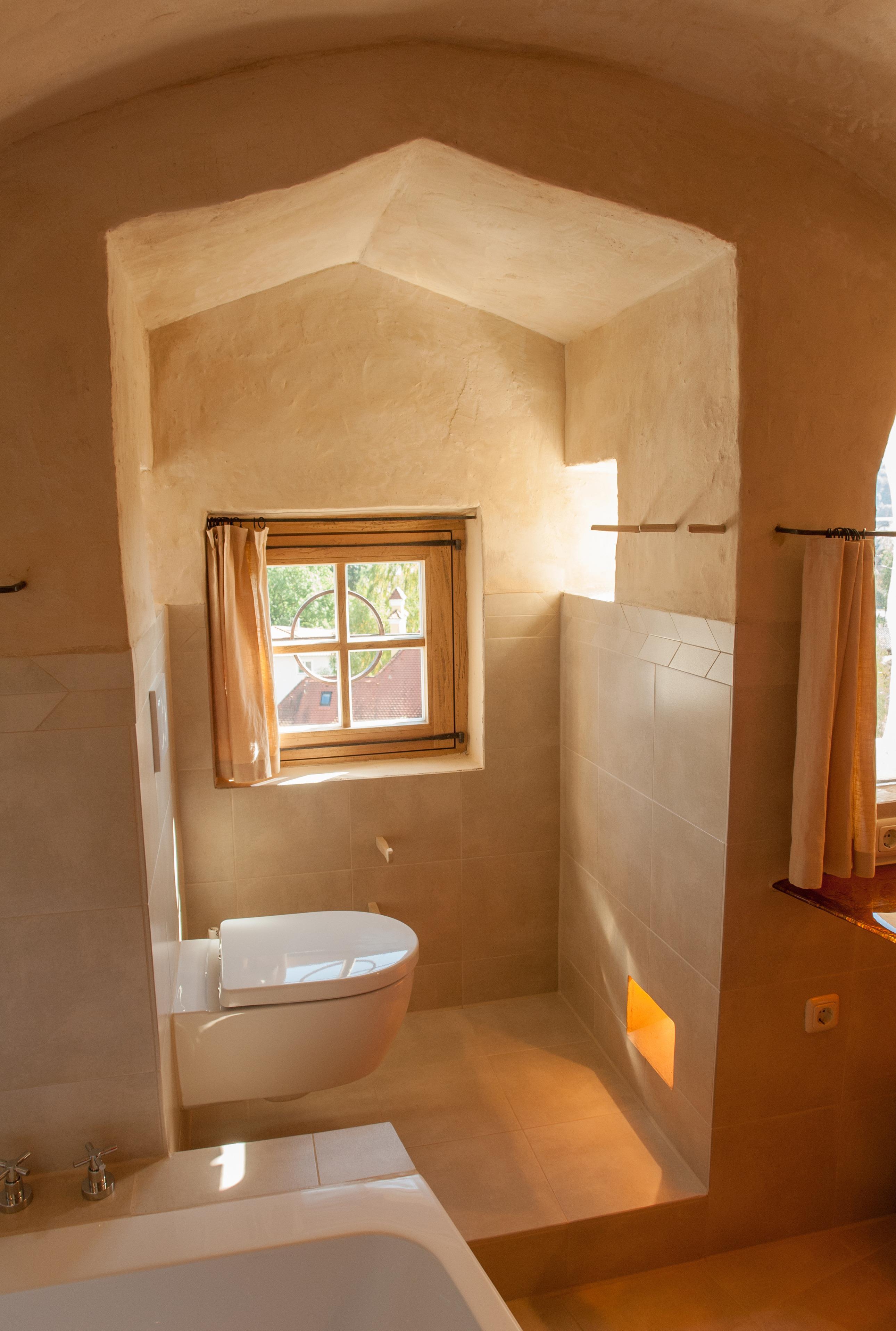 Ein großzügiger Wohnbereich mit großer Dachverglasung, offener Feuerstelle, Kachelofen und traumhafter Wohngalerie sind zweifelsohne Blickfang dieser Ferienwohnung. Von hier erschließt sich der wunderbare Freisitz im malerischen Laubengang mit offener Feuerstelle, das Turmzimmer mit Massivholzbett und Blick auf den Schloss Innenhof und das Badezimmer in der archaischen Gewölbekuppel. Das Bad ist mit exklusiver Whirlwanne, entspannender Regendusche und weitem Blick auf den Horizont eine Wellnessoase für Körper und Seele.