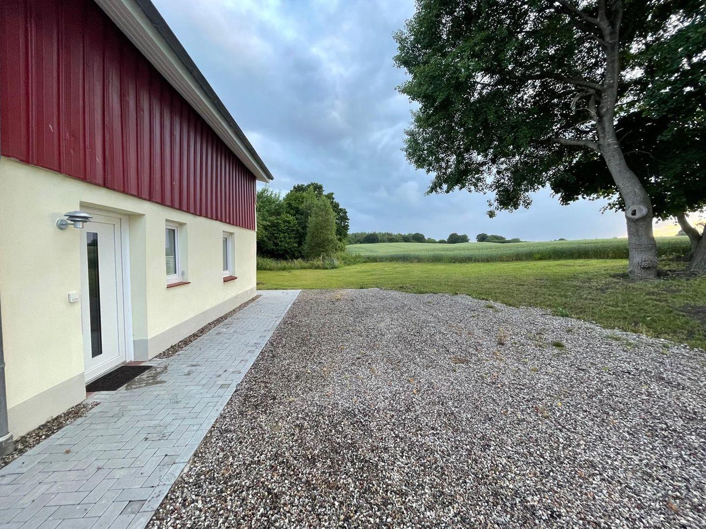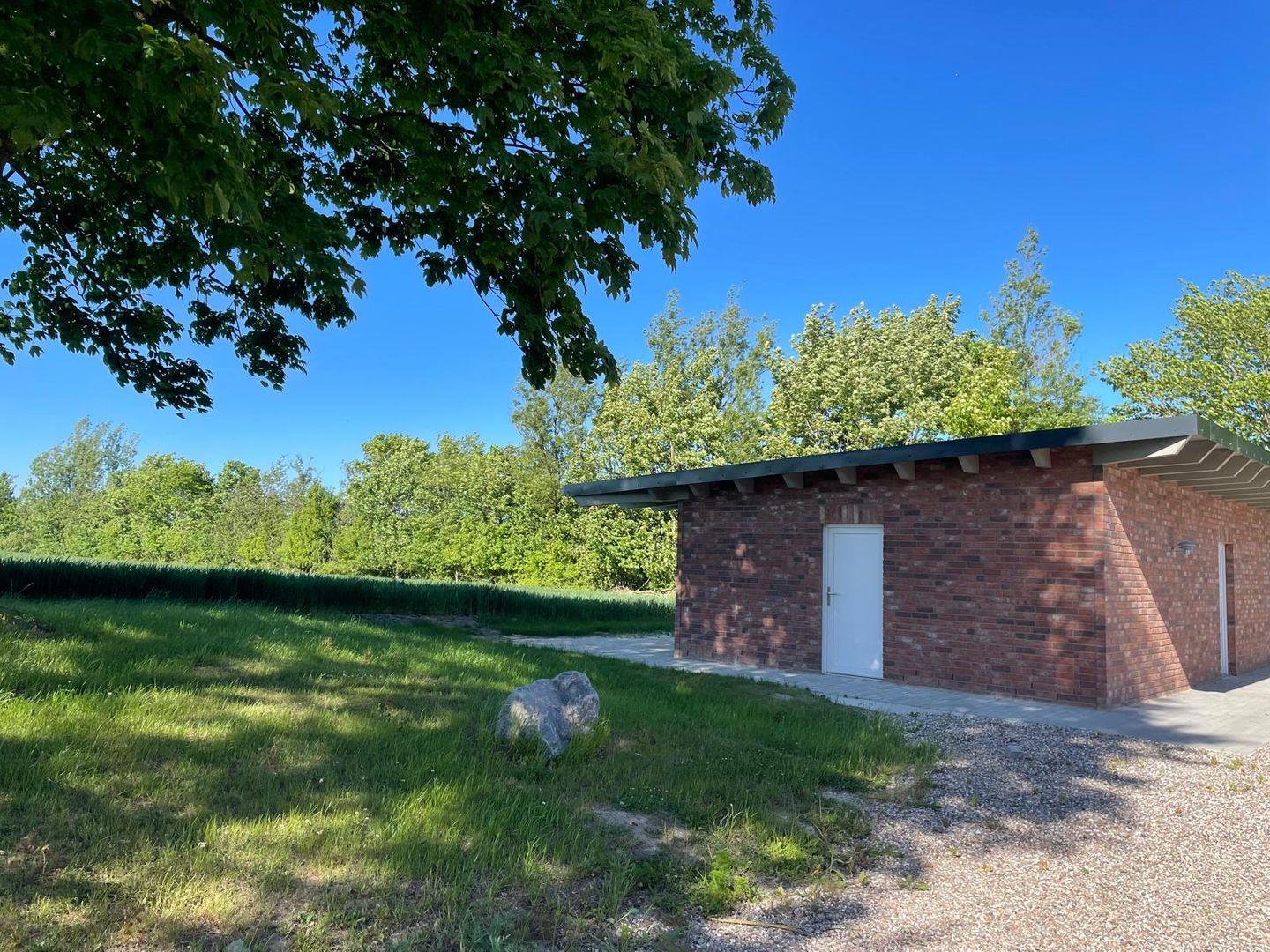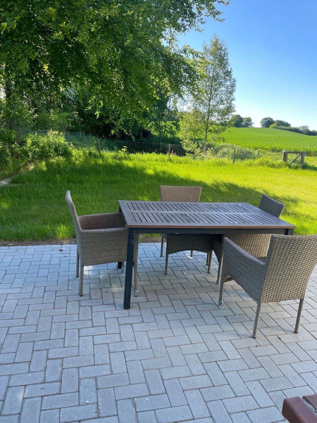 Der Außenbereich lädt zum Entspannen ein: Genießen Sie die Sonne auf der Terrasse mit Gartenmöbeln oder schlendern Sie durch den gepflegten Garten. Parkplätze sind direkt vor Ort vorhanden.