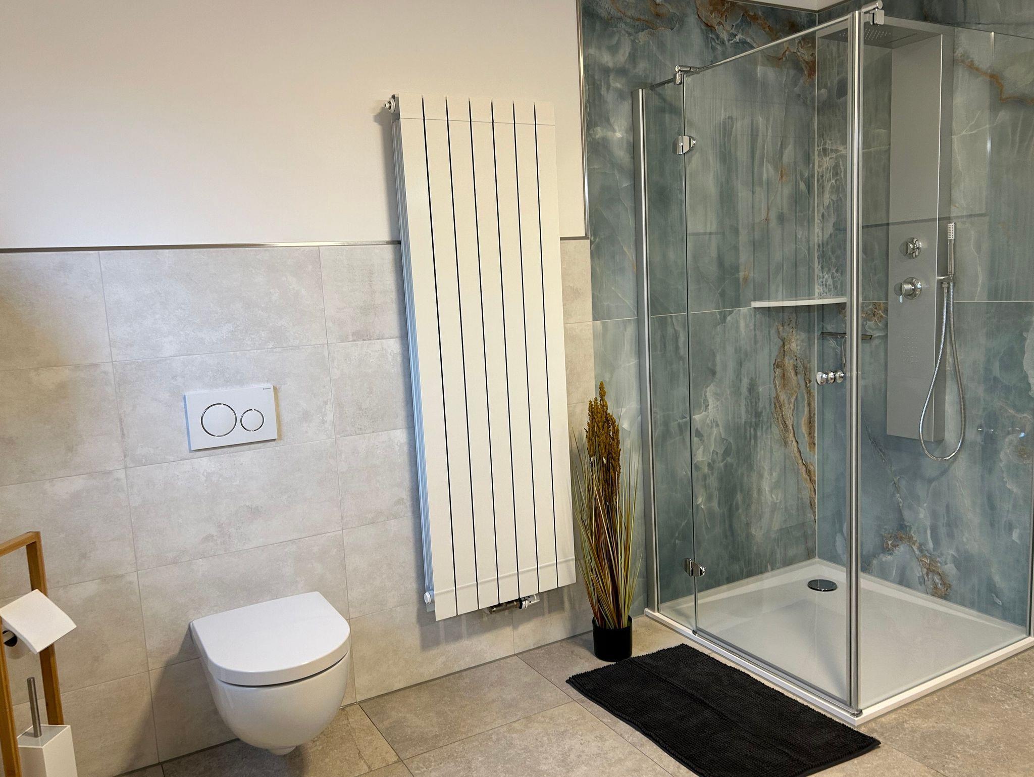 • 1 Badezimmer mit ebenerdiger Dusche, Badewanne, Toilette, Waschmaschine, Haartrockner, Handtücher