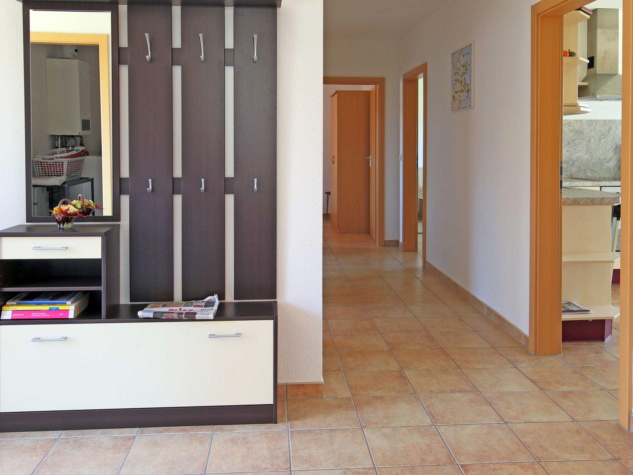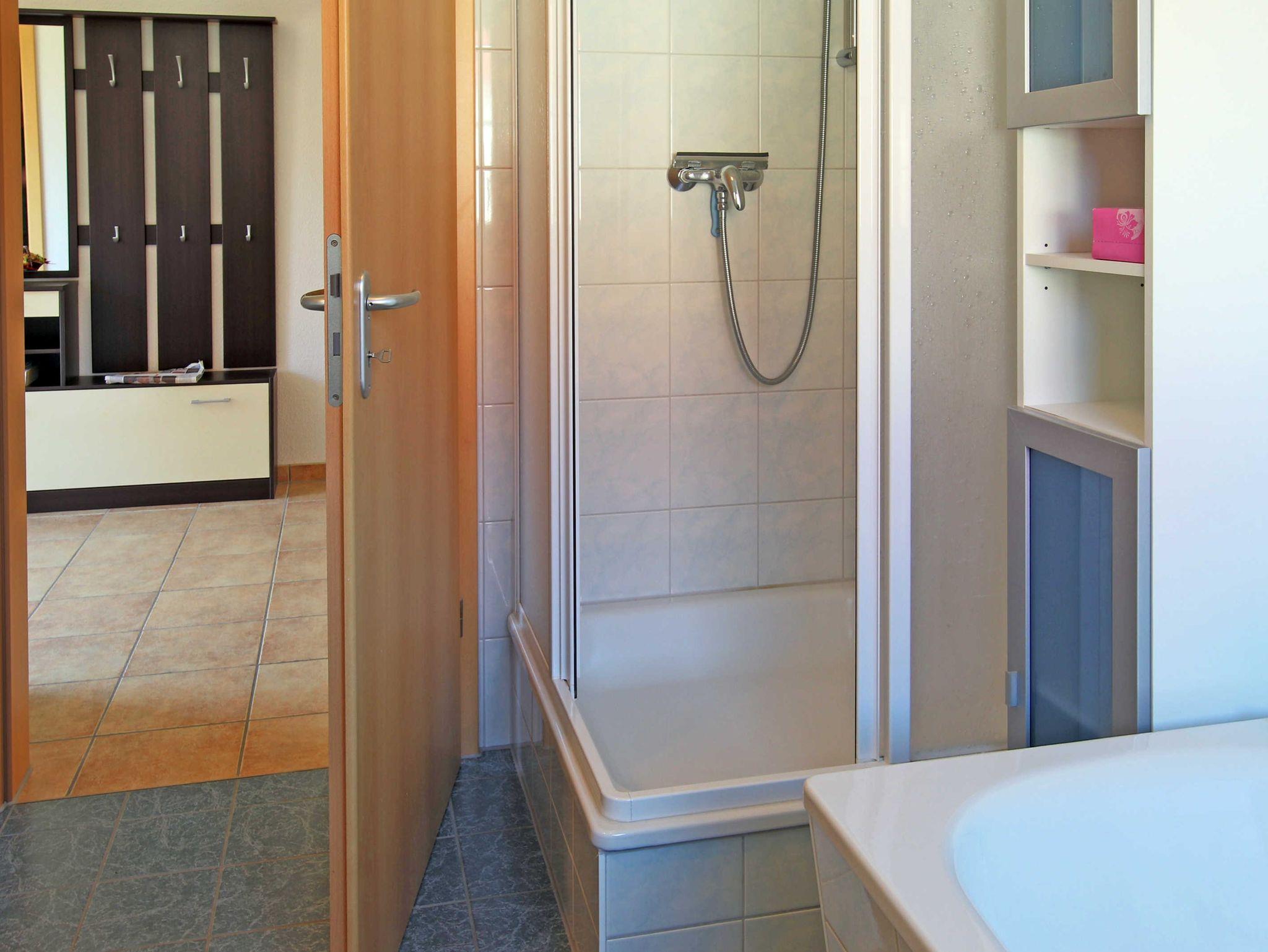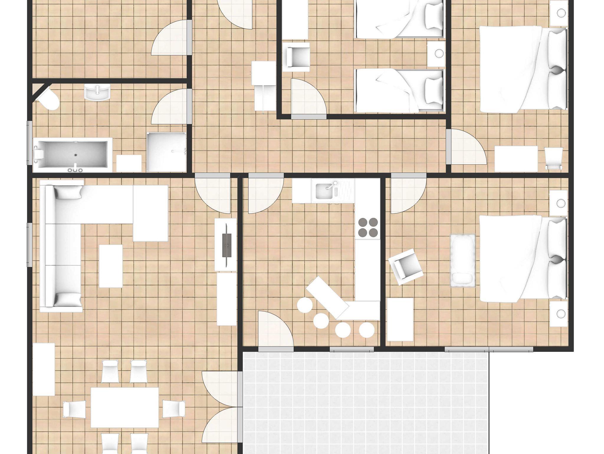 Das Ferienhaus teil sich in Wohnzimmer, drei Schlafzimmer, eine separate Küche und ein Badezimmer ein. Das Wohnzimmer verfügt über Couch, TV und einen Esstisch. Zwei Schlafzimmer sind mit jeweils einem Doppelbett (200x200, getrennte Matratzen) ausgestattet, während das dritte Schlafzimmer über 2 Einzelbetten (100x200 höhere Seniorenbetten) verfügt (Hinweis: die Bettdecken haben Komfortgröße mit 1,55m x 2,20m). In einem Schlafzimmer mit Doppelbett befindet sich zusätzlich ein feststehendes Kinderbett (70x140). In der vollausgestatteten Küche befinden sich neben dem Elektro-Herd mit Backofen, Kühlschrank, Geschirrspüler, Kaffeemaschine, Wasserkocher, Toaster, Mikrowelle und auch Sitzgelegenheiten. Das Bad ist mit einer Badewanne, Dusche, einem WC und Föhn ausgestattet.