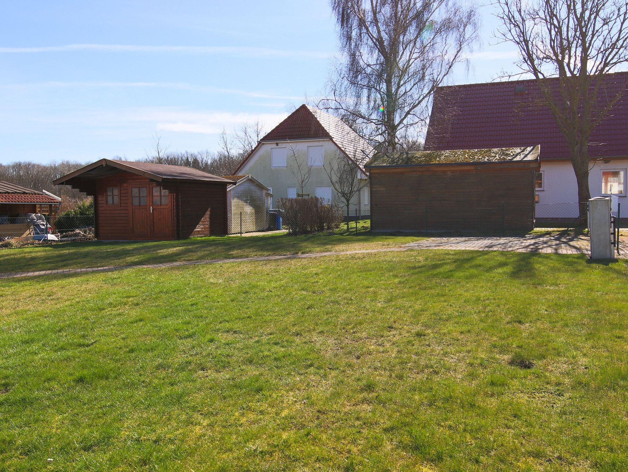 Auf dem ca. 630m² großen Grundstück befinden sich eine teilweise überdachte Terrasse mit Sitzgelegenheiten und Grillmöglichkeit sowie ein Gartenhäuschen, in dem Sie Ihre Fährrader unterstellen können und zwei Parkplätze.