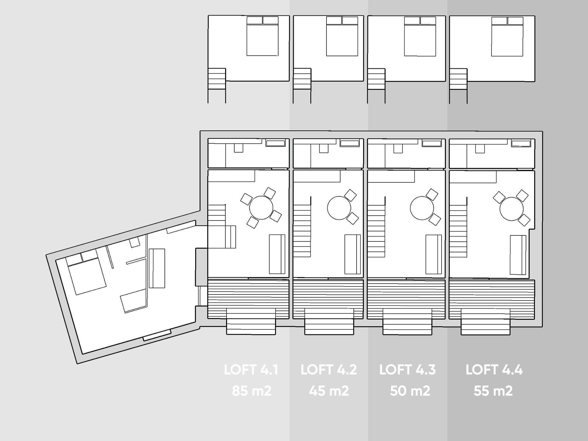 Loft 4.1 (85 m²) bis max. 6 Personen mit 2 Schlafzimmern, 2 Bäder, 1 Küche, einer Terrasse sowie die Nutzung eines 1000m² großen Gästegartens.