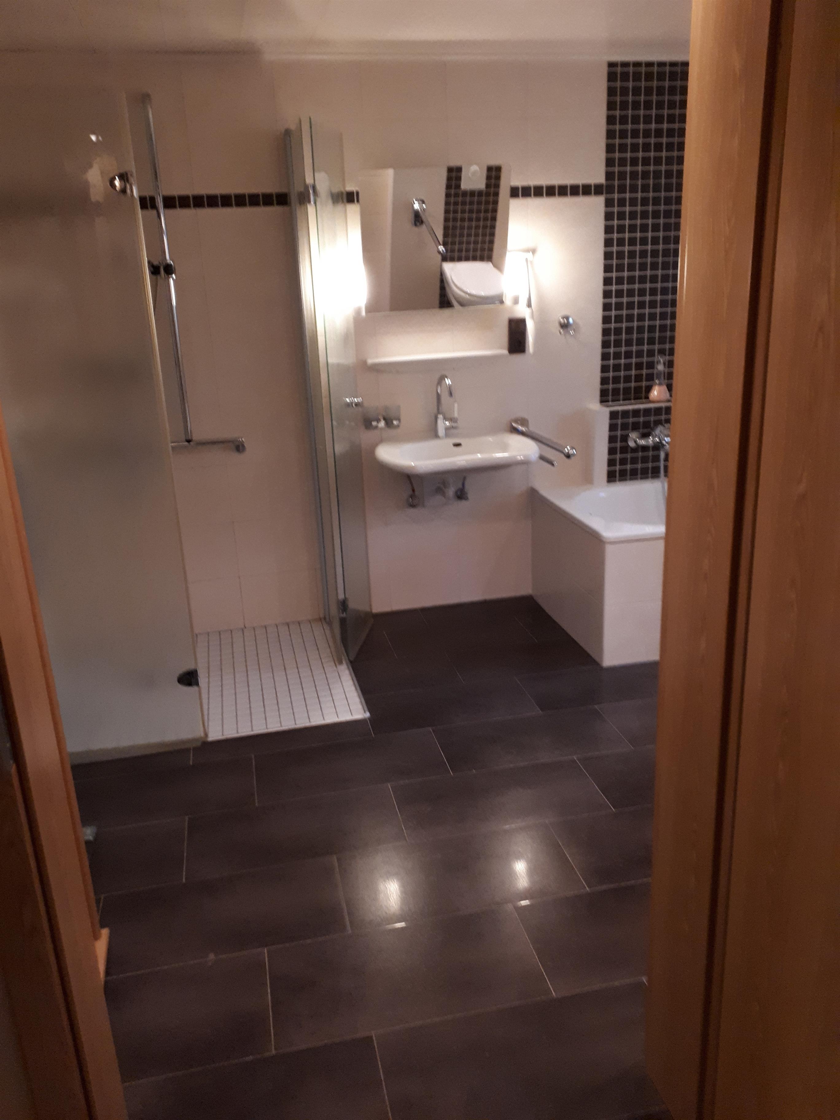 Unser Highlight aber ist das Badezimmer mit Badewanne und befahrbarer Dusche. Alle Gegenstände sind behindertenfreundlich.