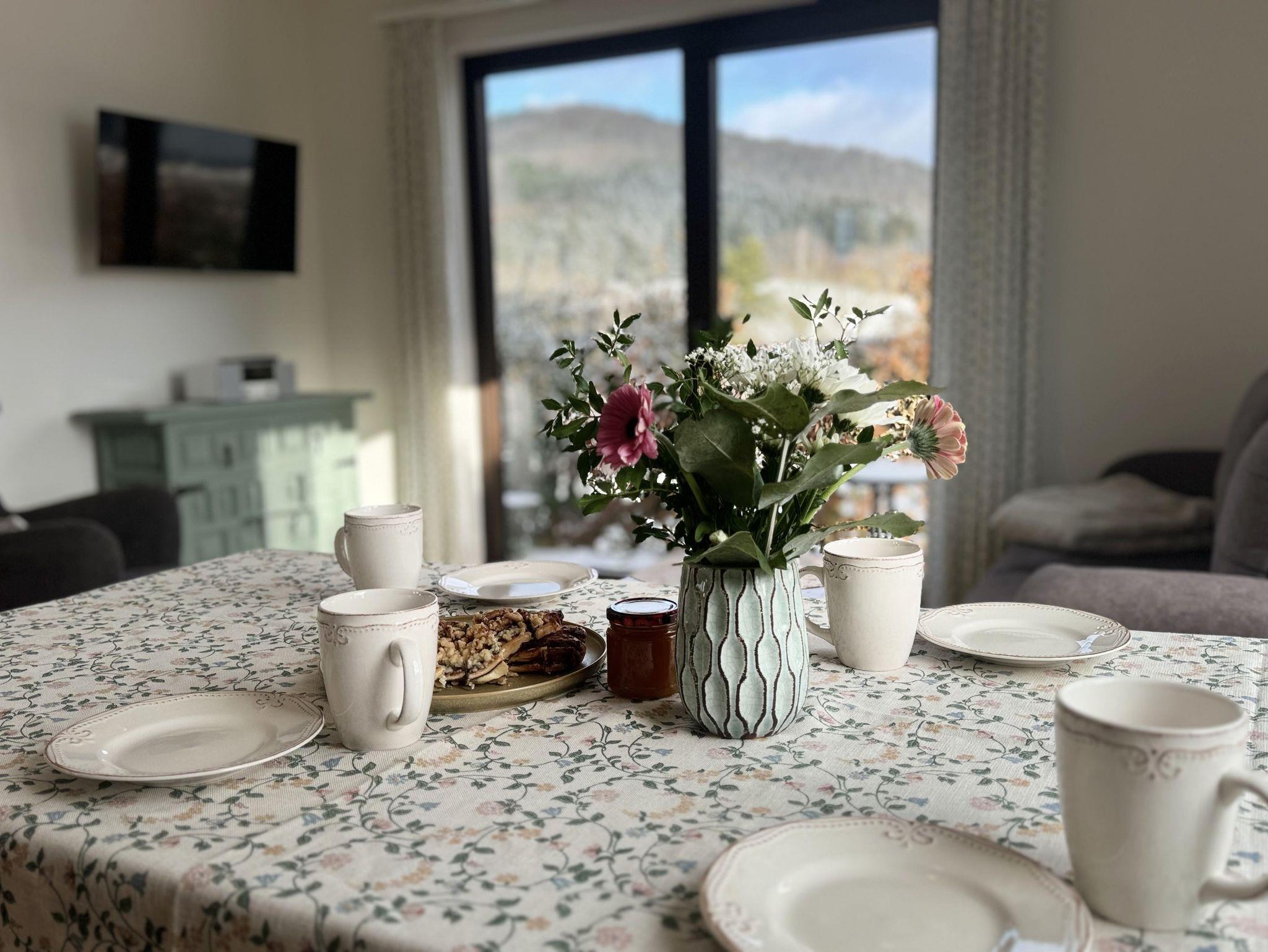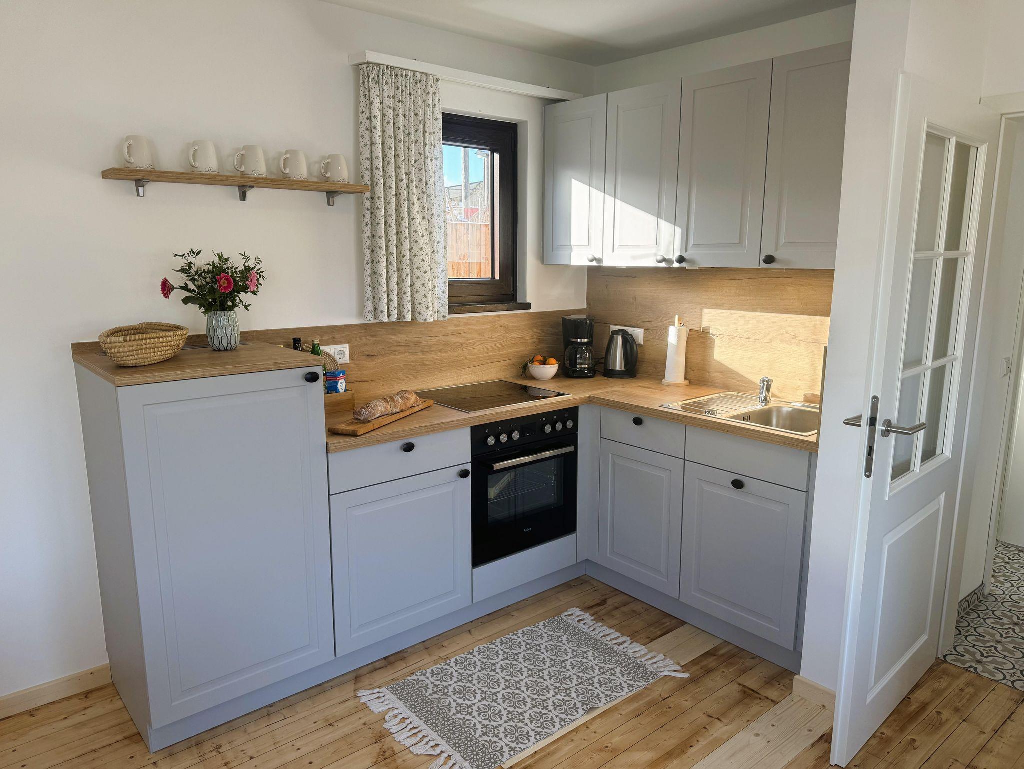 Wunderschöne Ferienwohnung im Landhausstiel für bis zu vier Personen, Wohnzimmer mit Echtholzboden und gemütlicher Couch, ca. 50qm, voll ausgestattete Küche mit Geschirrspüler, Backofen, Kühlschrank mit Gefrierfach, uvm, ein Schlafzimmer mit einem Doppelbett (1,6m) und Kleiderschrank, Wohnraum mit Schlafcouch ( Schlafbreite 1,4m ), Badezimmer mit Dusche und WC, Diele, Terrasse, Gartenmöbel, Smart-TV, Kompakt-Audio System. Der Blick geht auf das Gutsgeschehen und in das Wiesental.