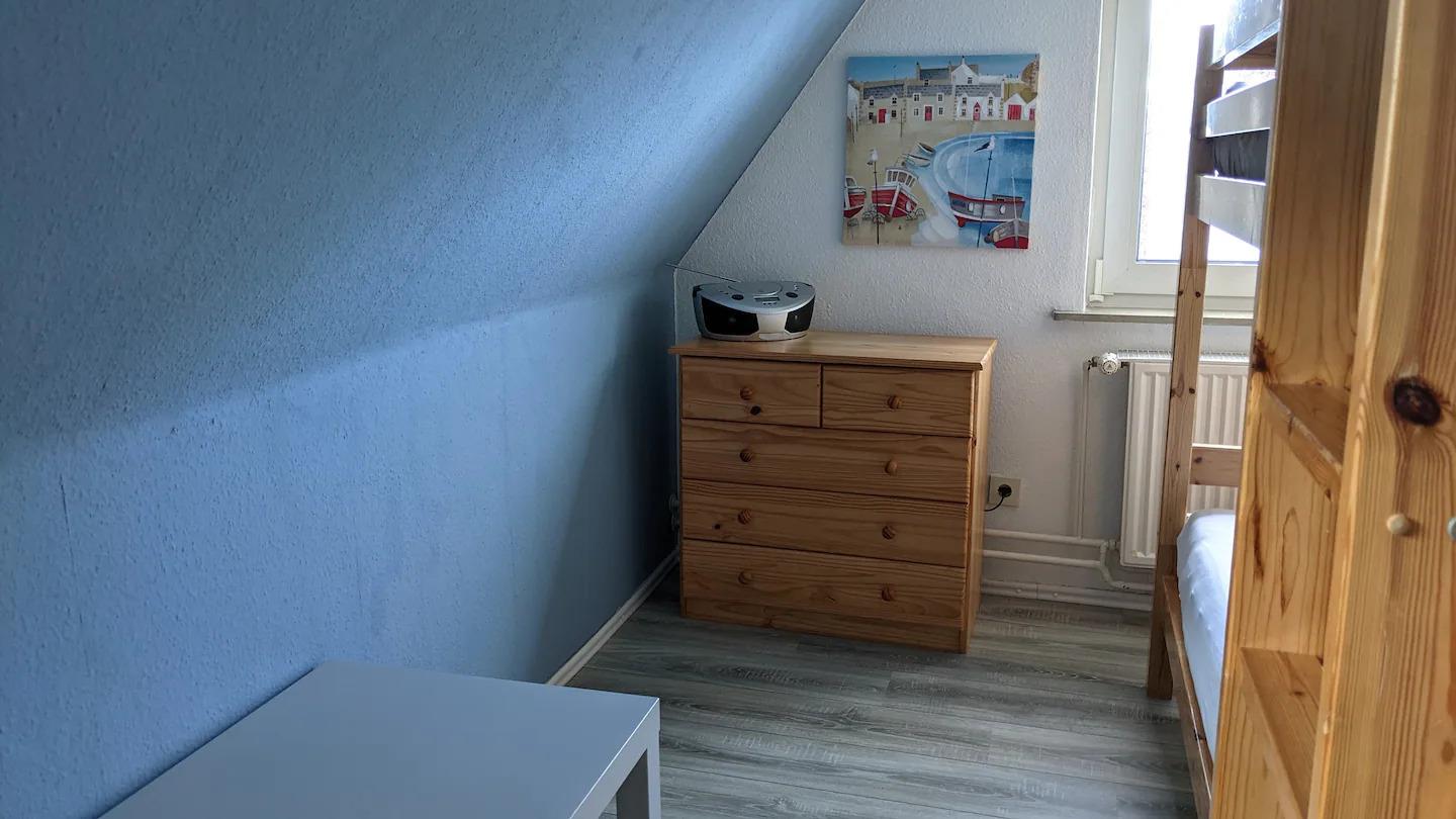 In Ober .-und Untergeschoss jeweils ein Elternschlafzimmer mit Kinderbett. Wickelkommode ,Hochstuhl (2 auf Wunsch),Heizstrahler für Babys ,wenn erforderlich .Für Kinder kann ein Rausfallschutz am Bett angebracht werden .Es befindet sich in allen oberen Schlafzimmern ein Fernseher. In der Küche steht für Gefriergut ein Gefrierschrank mit 3 großen Fächern. Im großen komplett eingezäunten Garten lädt ein Strandkorb oder Liegestuhl zum verweilen ein. Ein möbliertes Gartenhaus kann beim Grillen genutzt werden. Die Terrasse ist windgeschützt und ausgestattet mit einem großen Tisch und gemütlichen Stühlen. Eine Tischtennisplatte und Kinderfahrzeuge sind in der Garage. Ein Sandkasten mit darin befindlichen Spielsachen darf nicht fehlen.3 Fahrräder ohne Motor dürfen gerne genutzt werden. Am Ende der Straße,ca.300m ist ein schöner Kinderspielplatz. Wir sind ihre direkten Nachbarn, immer erreichbar und versuchen mit allem auszuhelfen.