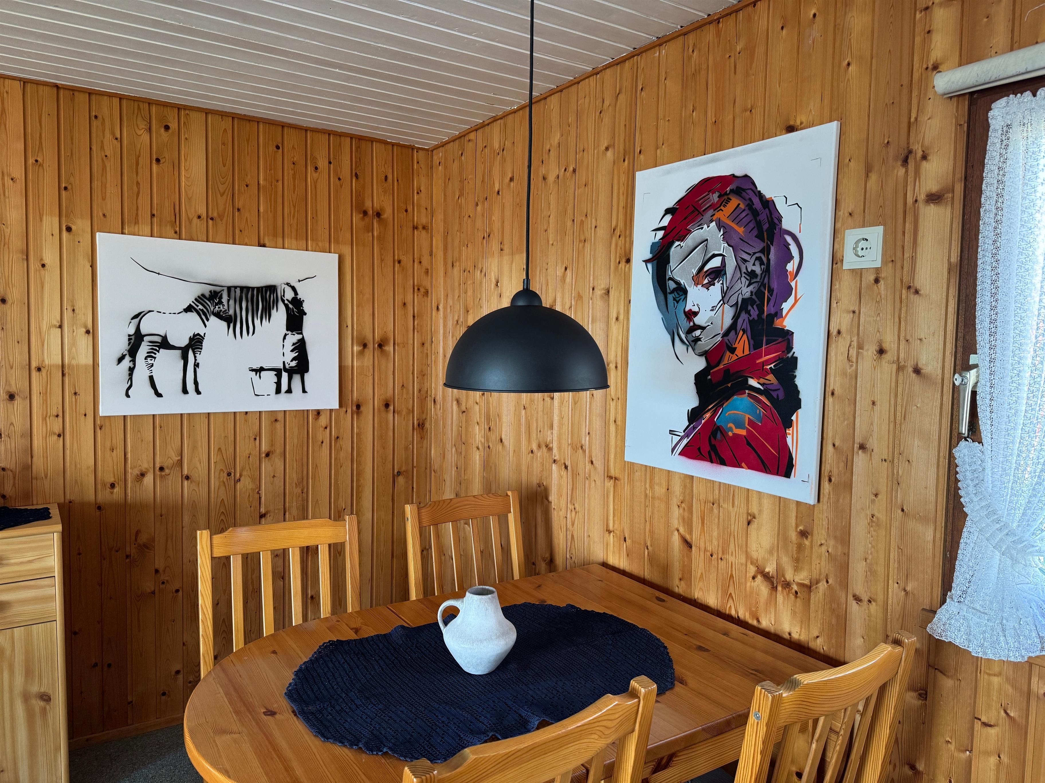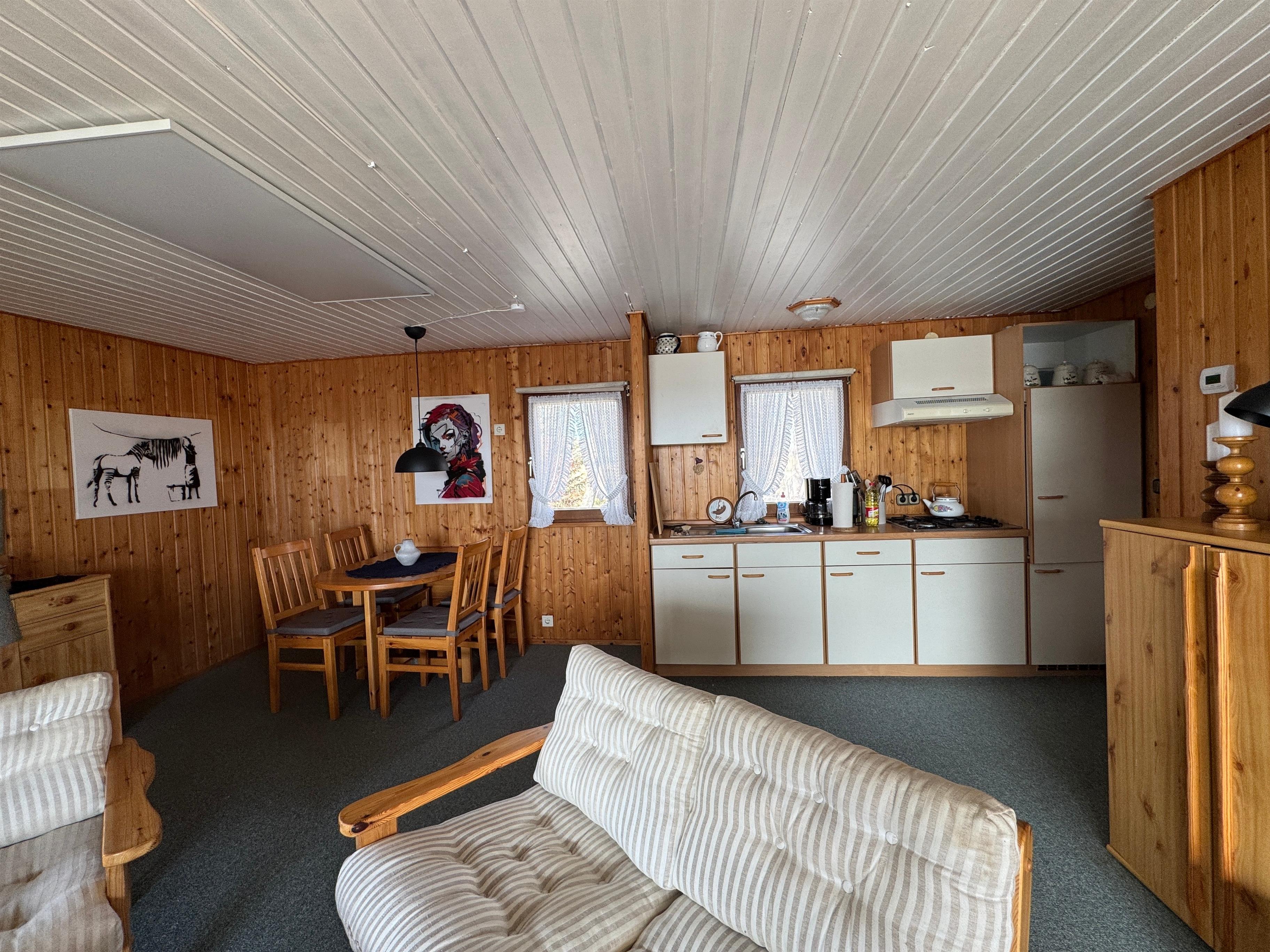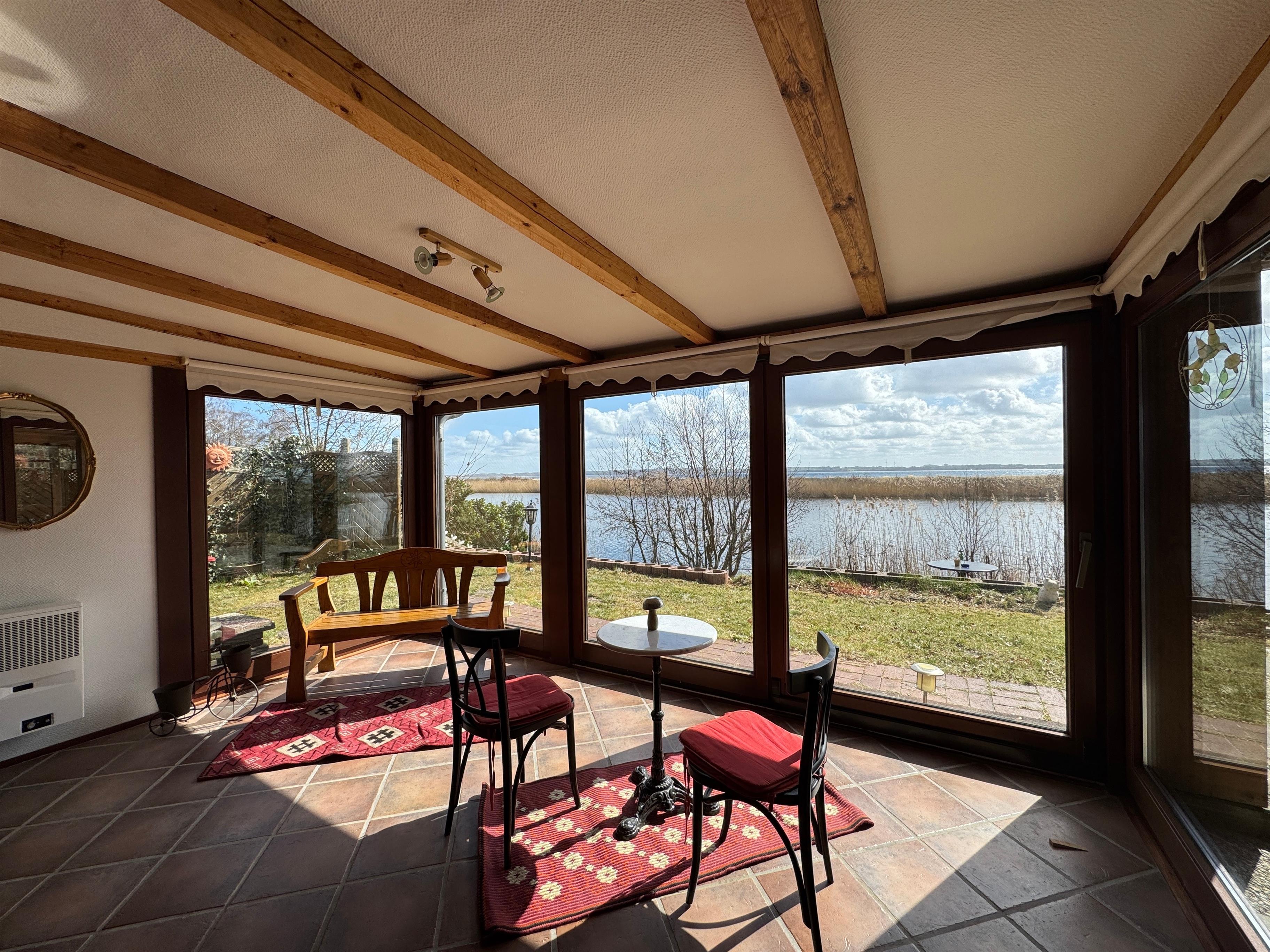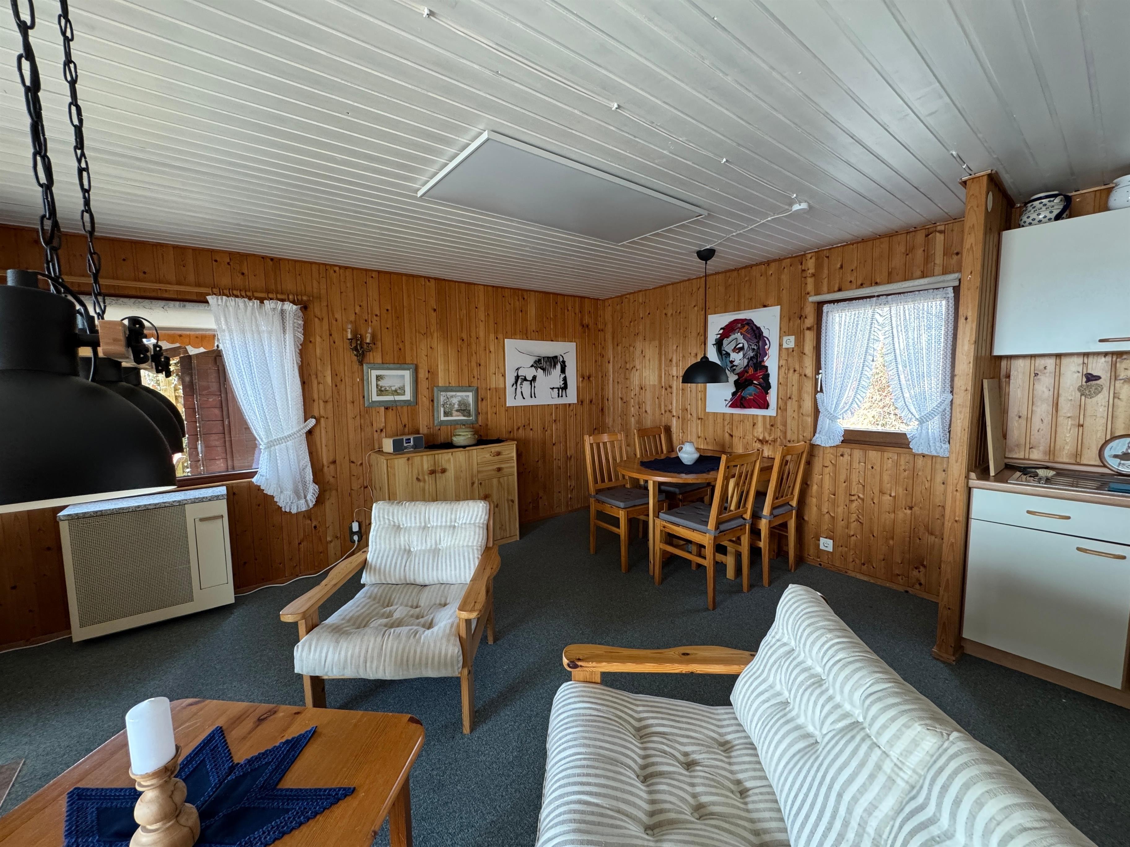 Wohnzimmerbereich: Sofa und 2 Sessel mit Panoramafenster, Fernseher, Ofen. Essbereich Tisch und 4 Stühle. Wintergarten, eine große überdachte Terrasse, sowie zwei Naturterrassen.
