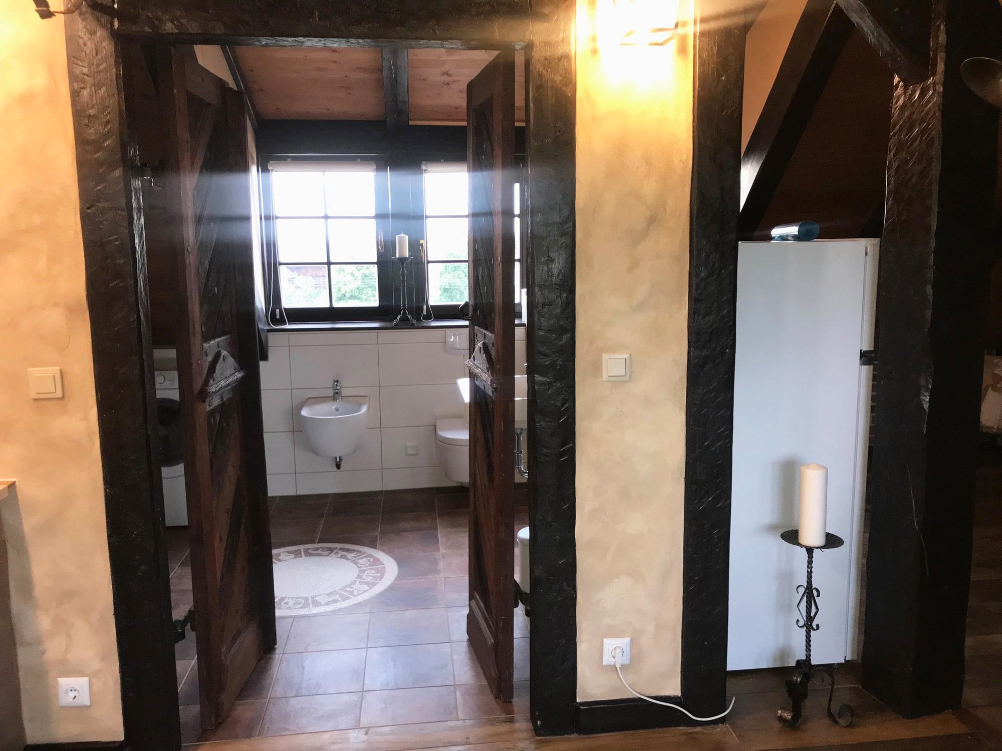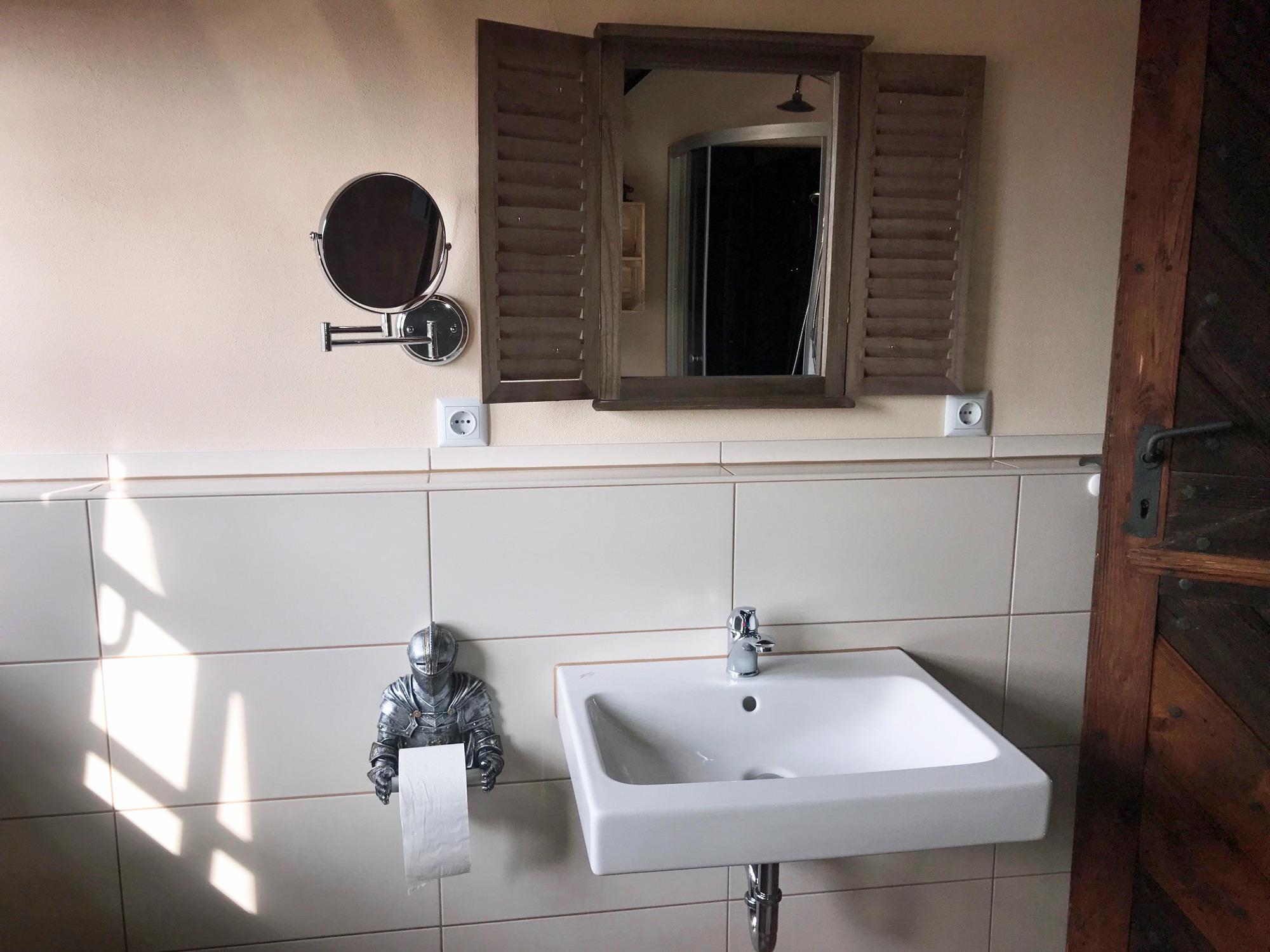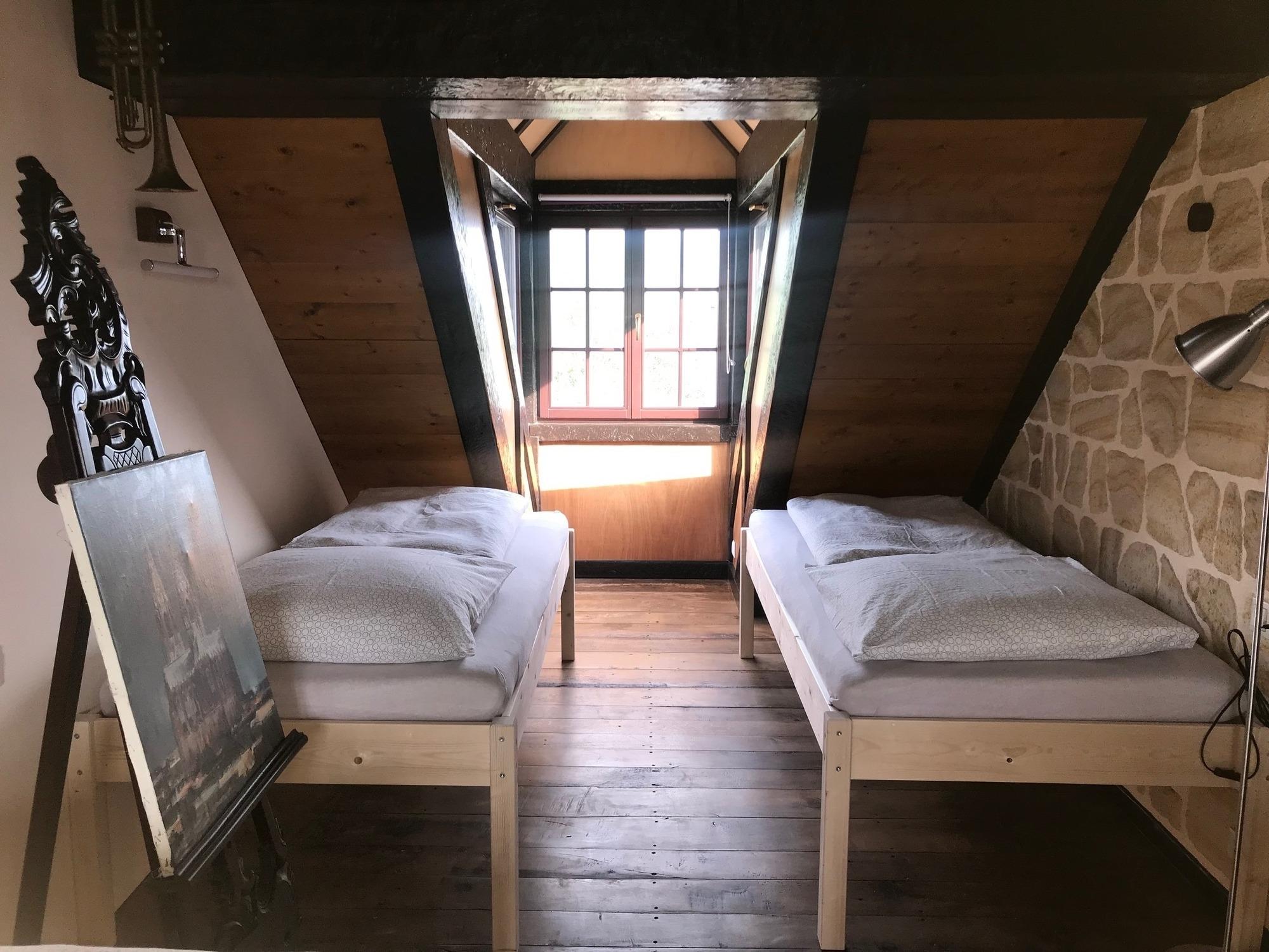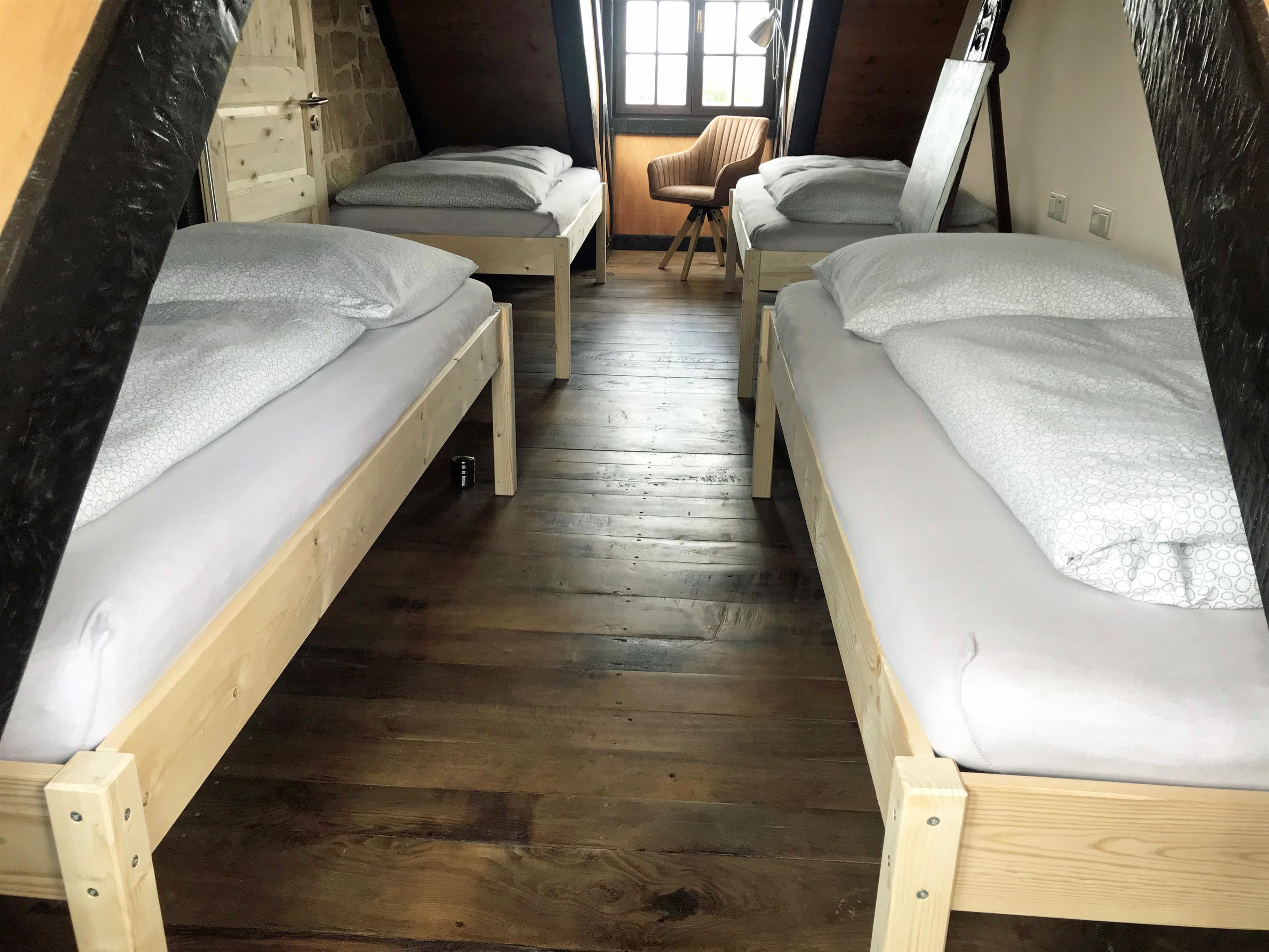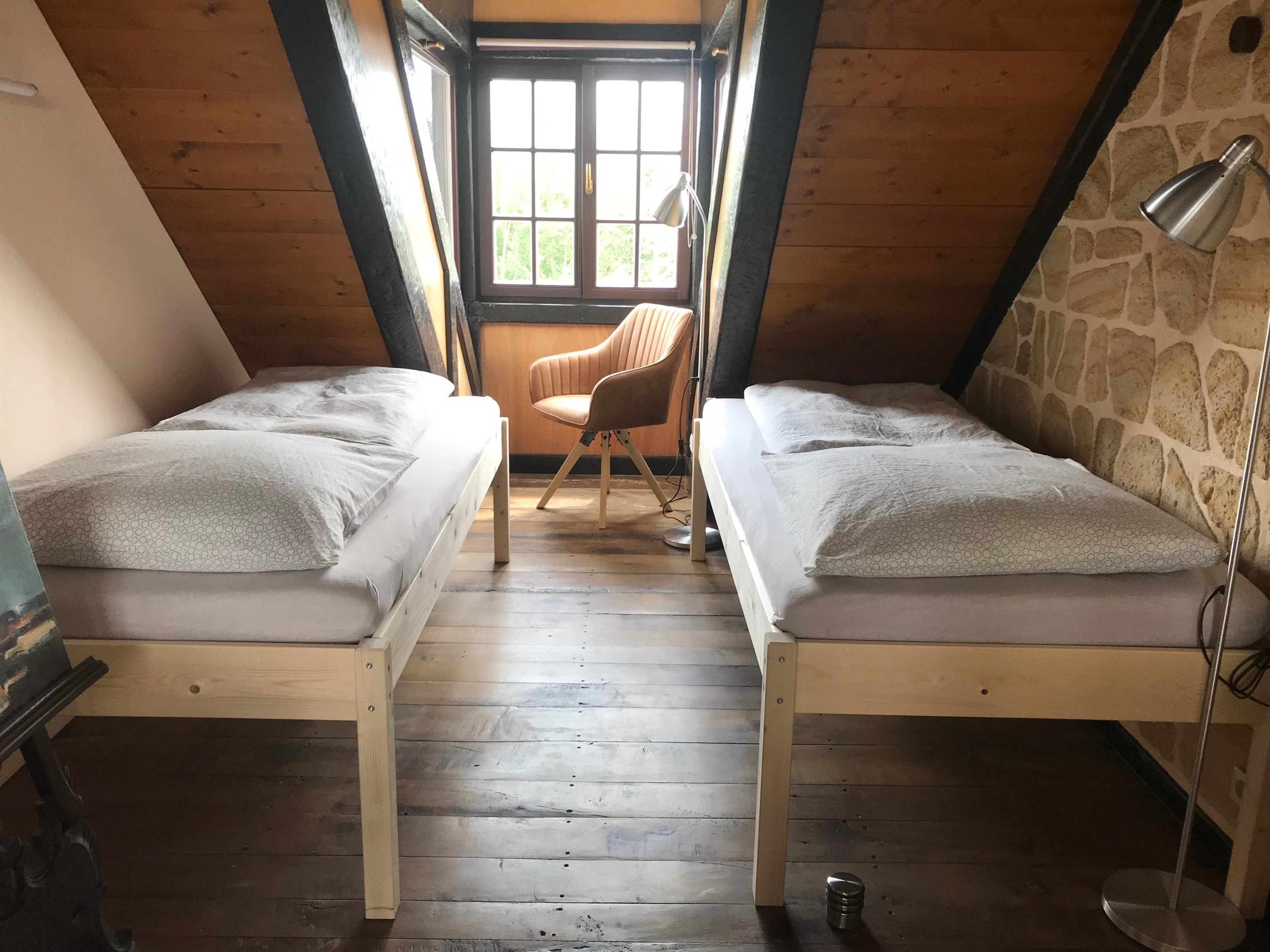 Unsere hundefreundliche Ferienwohnung Turmzimmer lädt Familien mit Kindern, Urlauber und Reisende zu entspannten Tagen ein. Auf 50 m² erwarten Sie Bad, Flur, Küche, Wohnzimmer und ein Schlafraum mit vier Einzelbetten, plus Babybett. Im Park warten Großschach und Tischtennis für Spiel und Spaß.