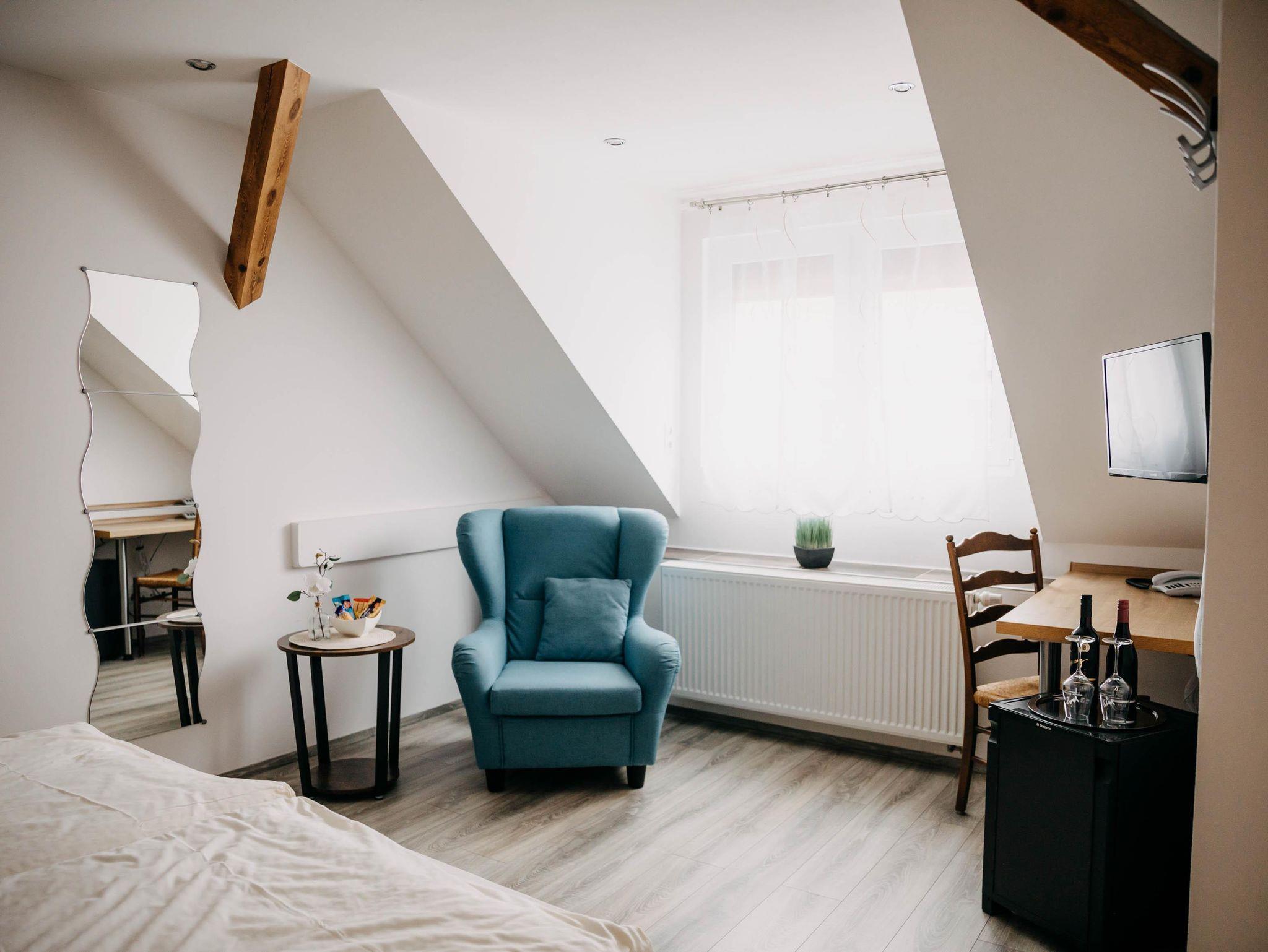Die Zimmer sind mit allem ausgestattet, was zu einem wohlfühlen in der Pfalz gehört, natürlich ist in jedem Zimmer eine mini-Bar mit einem guten, leckeren Manz-Wein.
