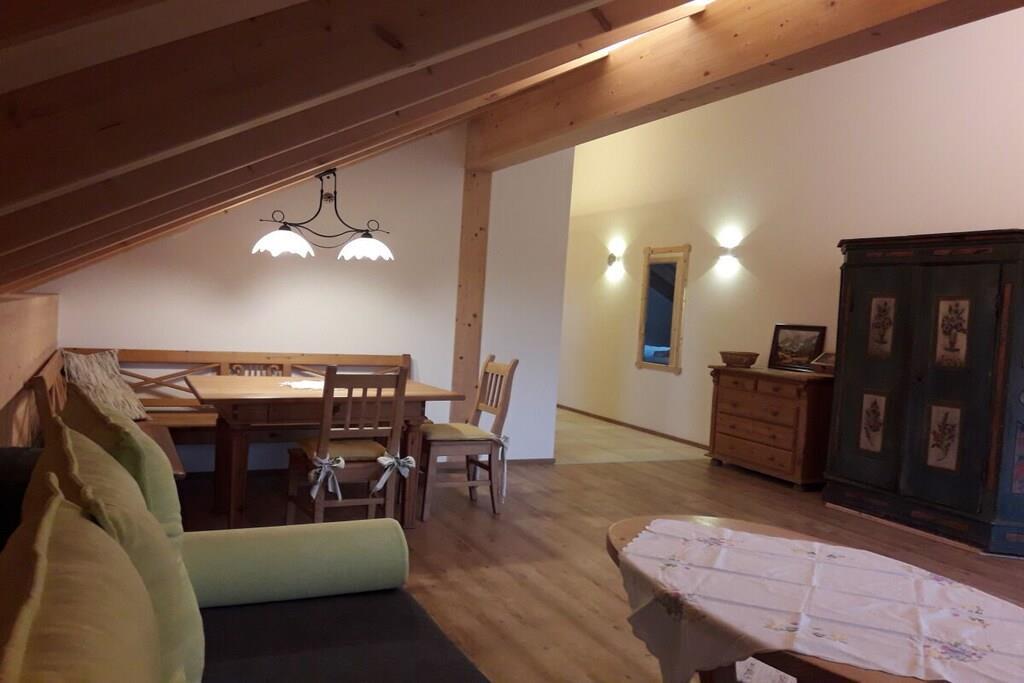 Unser Weiglhof-Wohnhaus ist 2019 neu gebaut, das Dach sehr gut gedämmt, bis 4.10m hoch, auch für große Menschen sehr gut geeignet, sehr viel Raum, steht der WHG im EG vom Raumgefühl nichts nach. Das DG hat ca. 54 qm, gehobene Ausstattung mit gesunden Materialien wie z. B. Zirbenholzbetten. Die Doppelbett-Couch ist stabil und bequem. Stil: Moderner Landhausstil. In mehreren Teilen finden sich die alten Weiglhof-Hölzer unseres Ursprungshauses wieder. Mit der Innenausstattung - und auch verbunden mit unserer Lage - möchten wir Ihre Sinne ansprechen, eine Atmosphäre für Ruhe, Erholung, Ausgeglichenheit schaffen; Sie dabei unterstützen, den Alltag für eine Zeit hinter sich zu lassen und neue Energie aufzutanken. Es gibt die Möglichkeit, alles für’s Frühstück in unserem Hofladen zu erwerben. In unserer Landwirtschaft halten wir Mutterkühe mit Nachzucht, d. h. der Beobachter kann das ursprüngliche Tierleben innerhalb der Rindergemeinschaft miterleben. Ich nehme mir gerne Zeit für Hofführung etc. Am Abend haben Sie die Gelegenheit, herrliche Sonnenuntergänge zu beobachten. Ein Grill steht bereit. Im Hofladen gibt es Grillfleisch und –Würste zu kaufen. Es ist genug Parkfläche da, auch für Motorräder etc. Alles Liebe und vielleicht bis bald Weiglhof 109, 83646 Wackersberg/Oberfischbach Ihre Helga Richter