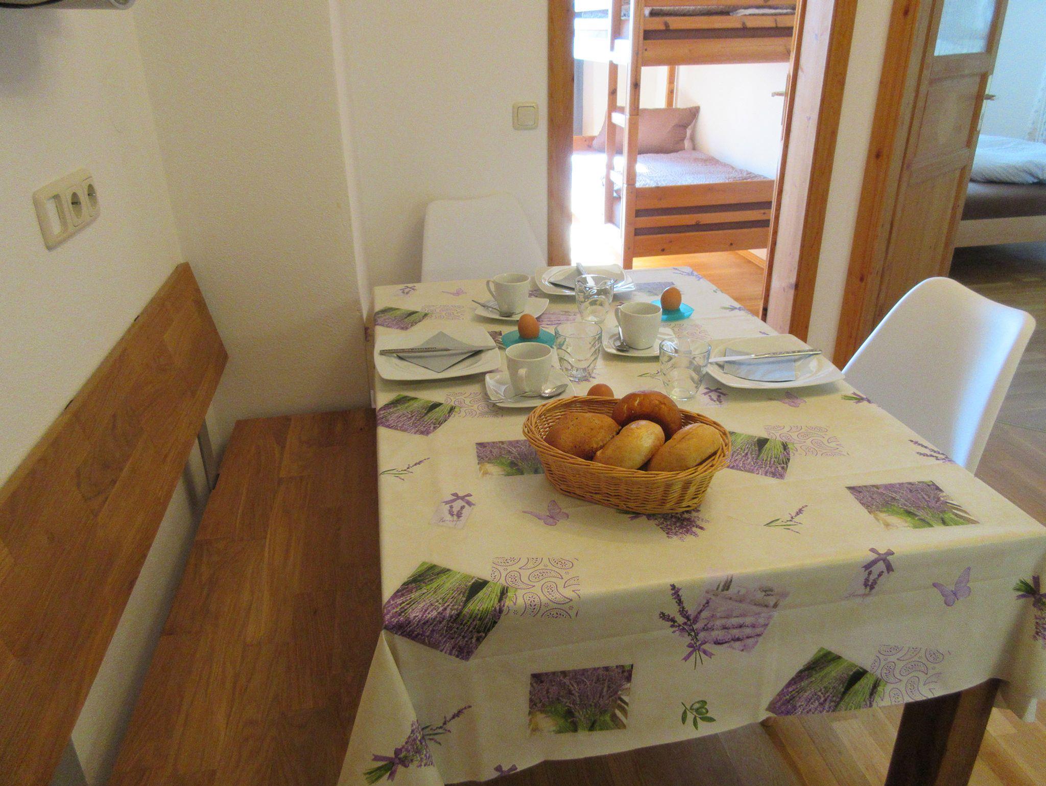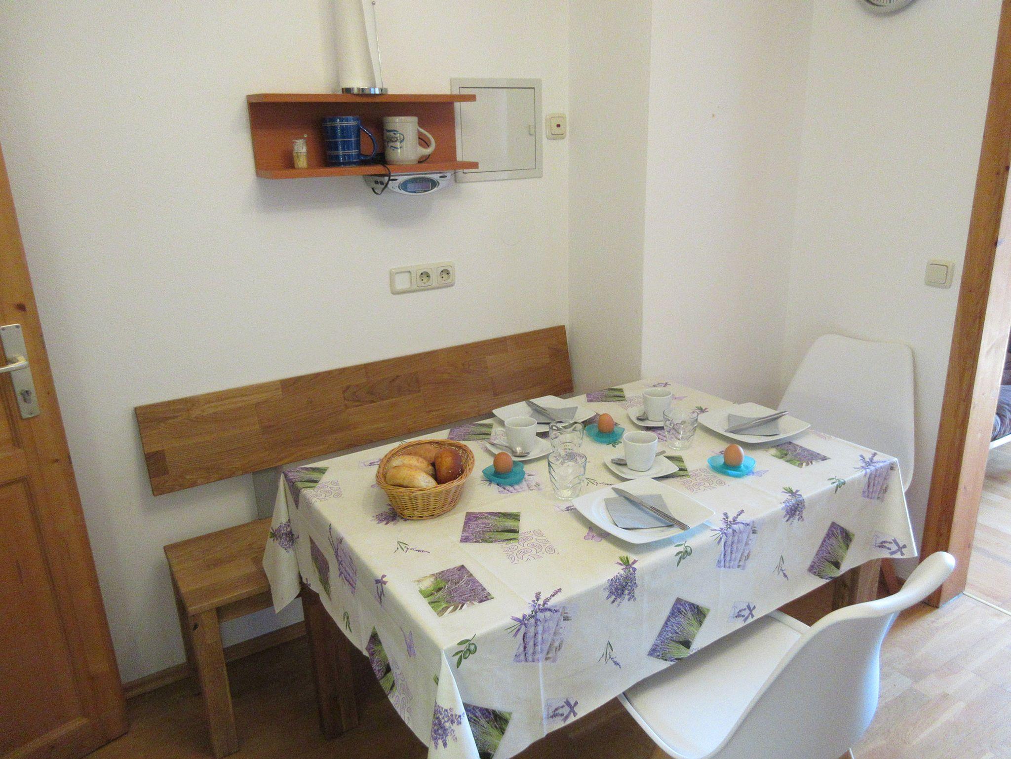 In der voll ausgestatteten Küche mit Kochnische, Kühlschrank und Tiefkühlfach können Sie Ihre Lieblingsgerichte zubereiten. Die Essecke lädt zum gemeinsamen Essen ein.