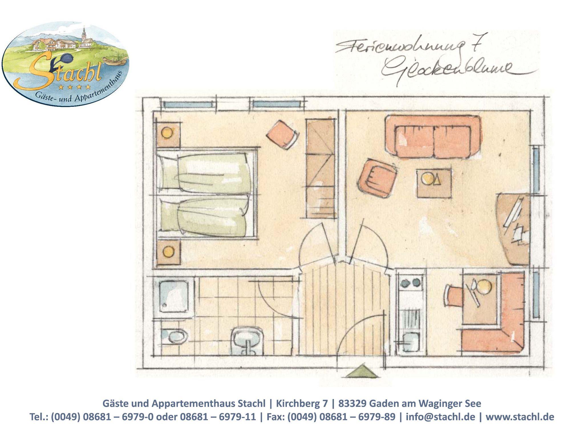 Die 4-Sterne-Ferienwohnung Glockenblume für 2 Personen befindet sich im 1. Stock und ist 45 m² groß ohne Balkon. Die Wohnung verfügt über ein Schlafzimmer mit Doppelbett, Schrank und Tresor, ein Wohnzimmer mit gemütlicher Sitzgruppe, eine voll ausgestattete Küche mit Geschirrspüler und Essecke mit Ausblick Richtung See und ein Badezimmer mit Dusche, WC, Handtuchtrockner und Fön.