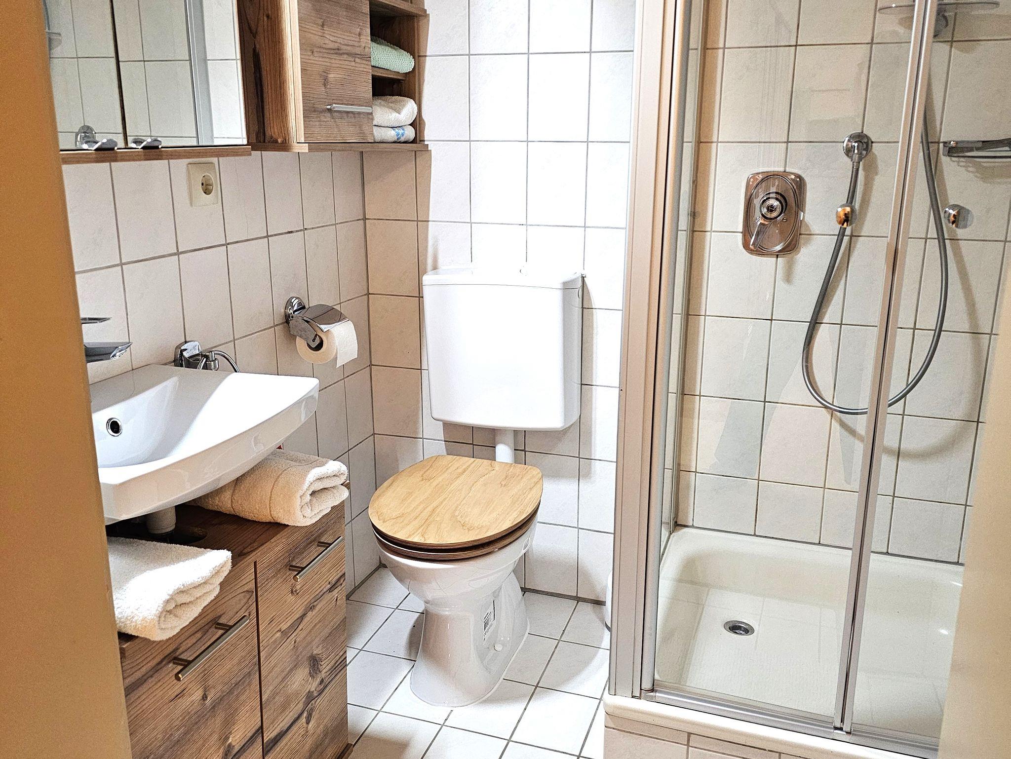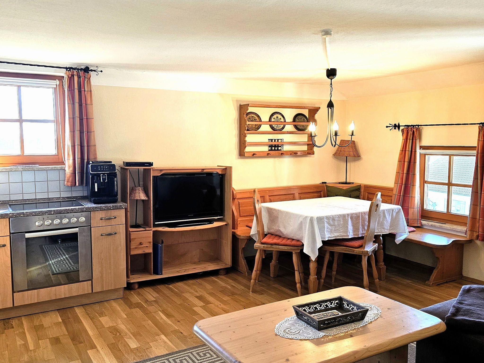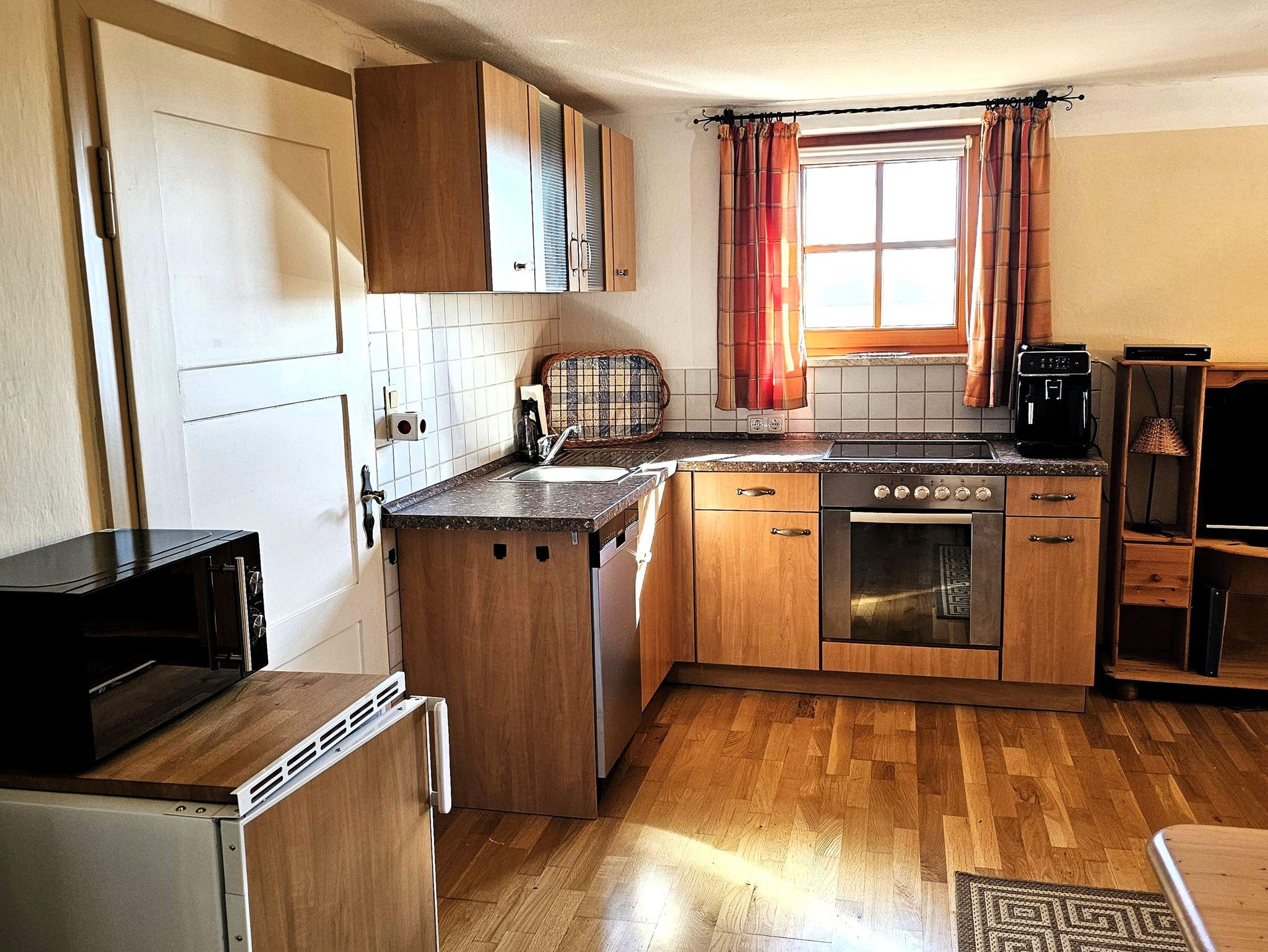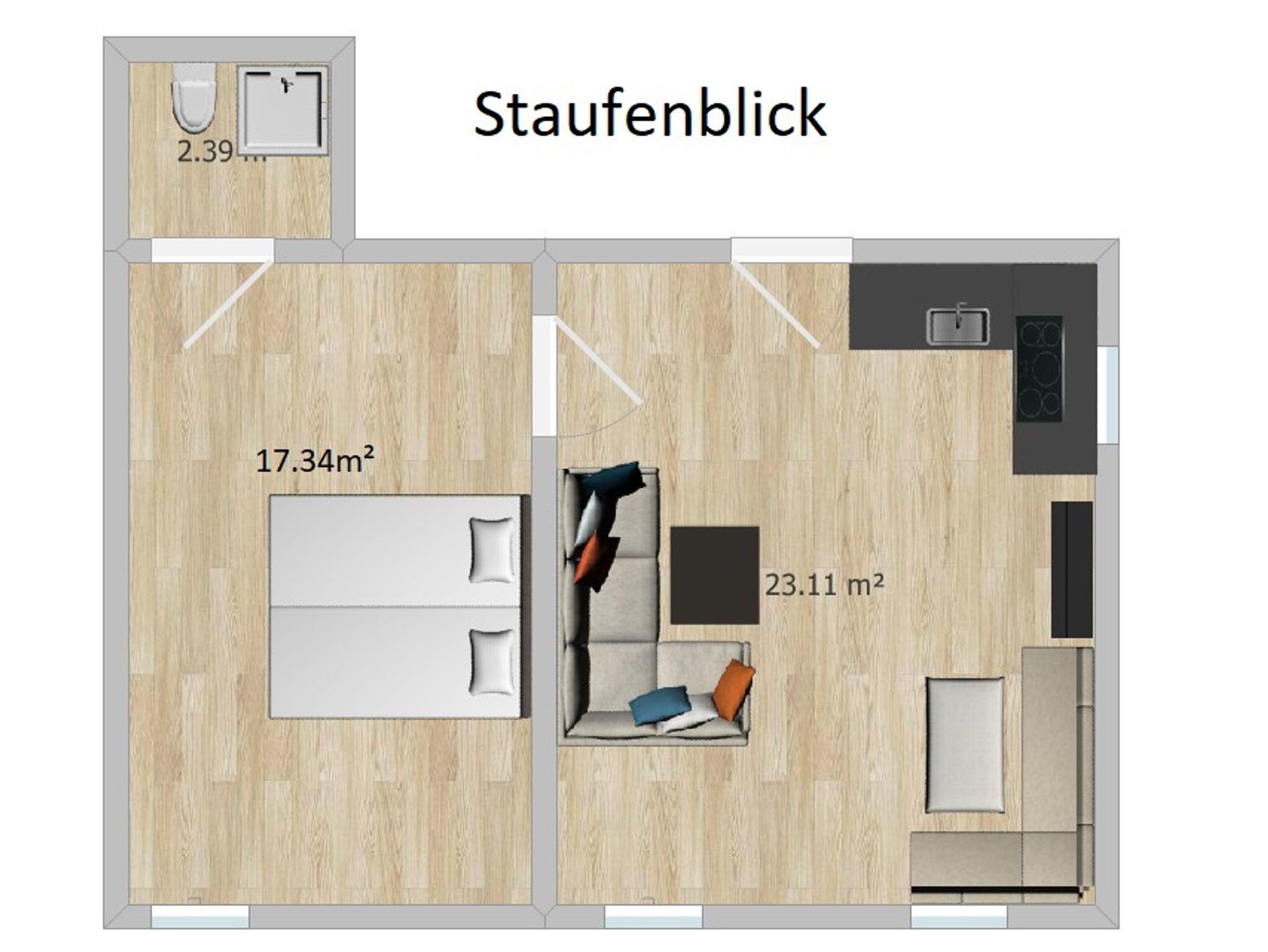 Die Ferienwohnung Staufenblick befindet sich im 2. Stock und ist 50 m² groß. Die Ferienwohnung verfügt über ein Schlafzimmer für 2 Personen mit Doppelbett und extra Waschbecken, ein Badezimmer mit Dusche und WC, eine Wohnküche mit voll ausgestatteter Küchenzeile, Essecke und Sitzgruppe mit Flachbild-TV.