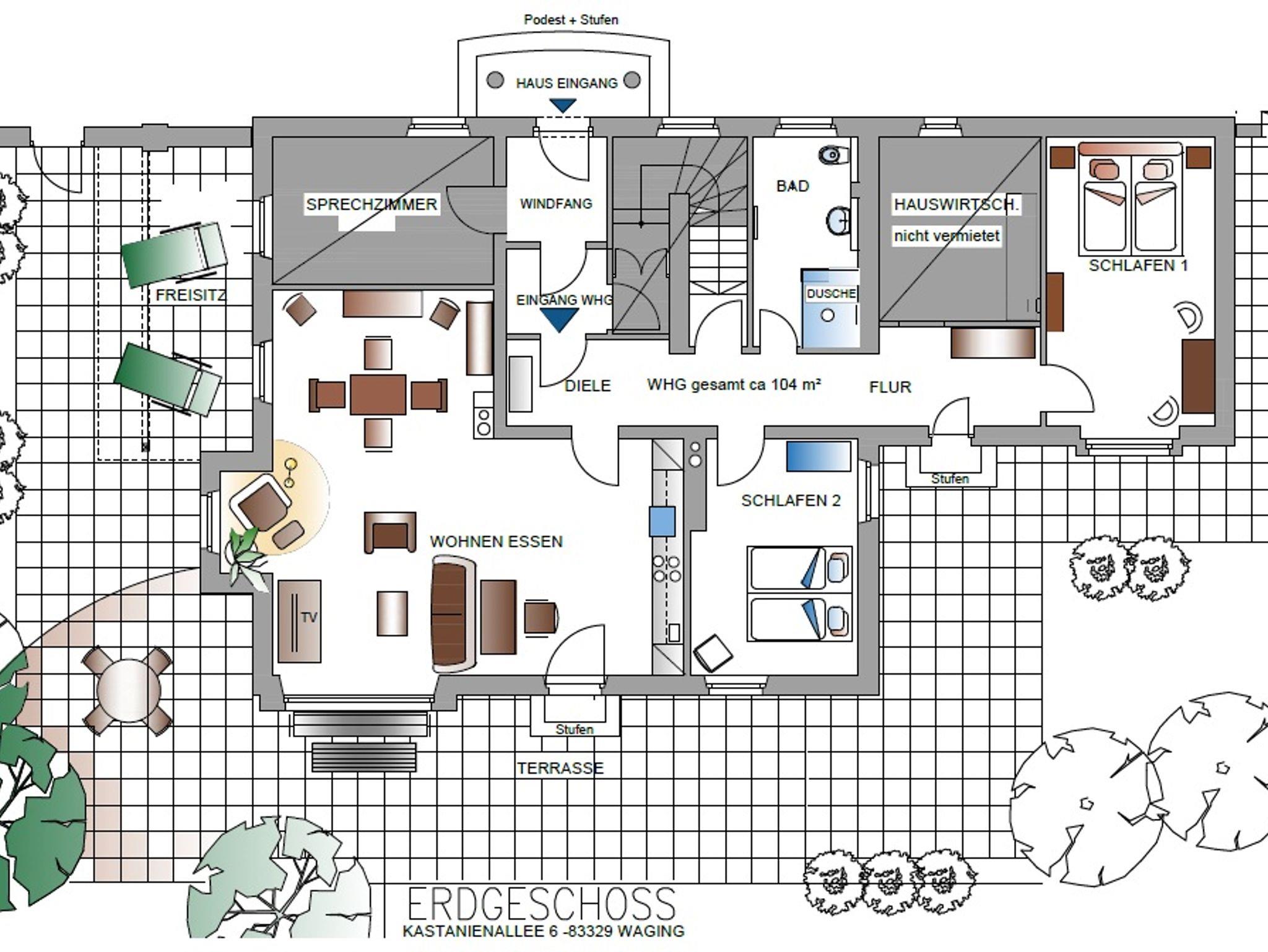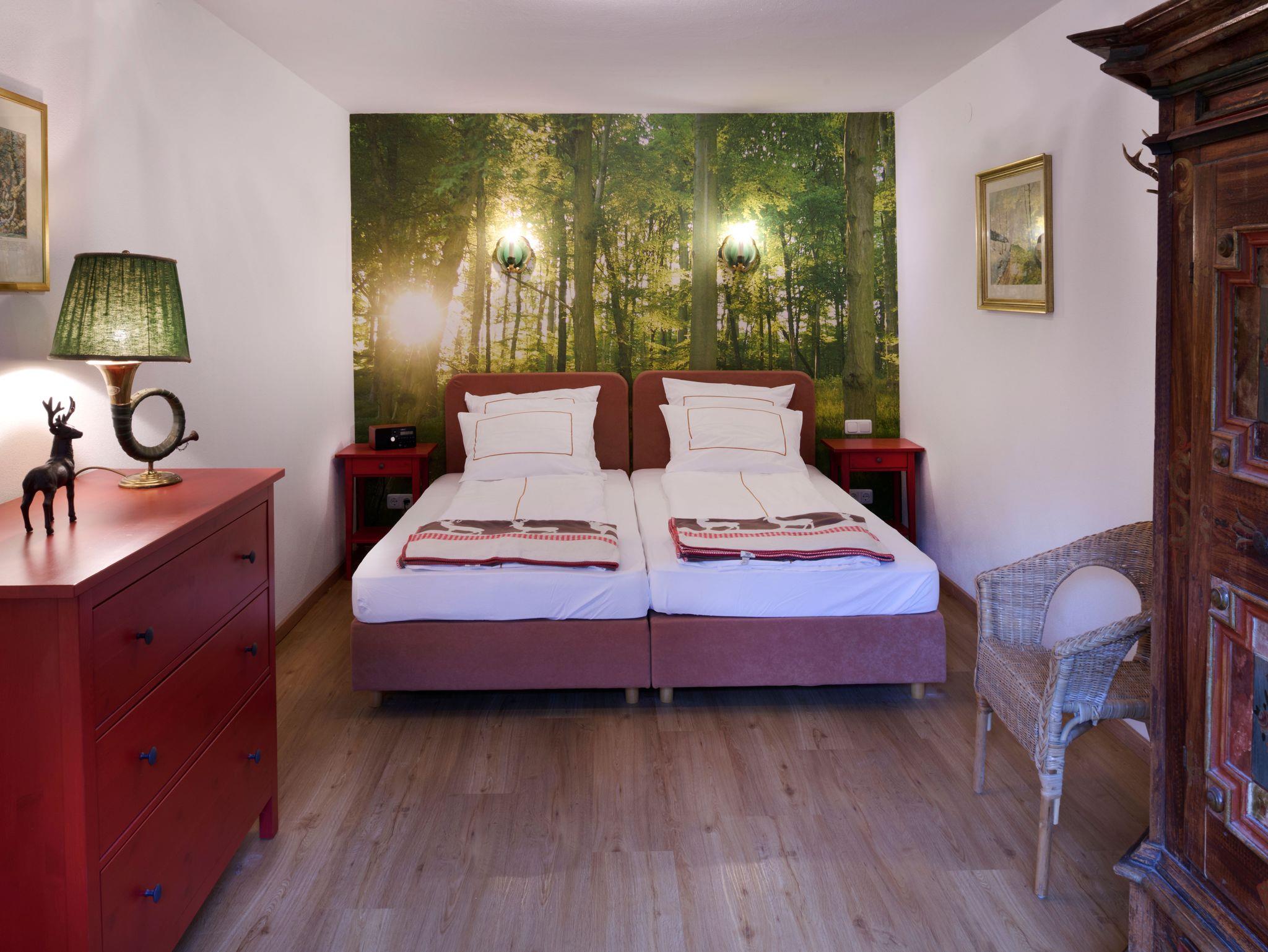 Als Gast im Landhaus Ruperti genießen Sie die privilegierte Lage in einem idyllischen Parkgrundstück im Luftkurort Waging am See. Auf der großzügigen Terrasse können Sie die Stille wahrnehmen, ausspannen und regenerieren beim Blätterrauschen der alten Bäume. Ruhig gelegen und doch ortsnah. Nur 500 Meter vom historischen Ortskern entfernt sind alle Gastronomiebetriebe und Geschäfte fußläufig zu erreichen. Die Ferienwohnung im exklusiven Landhaus-Ambiente ist mit Liebe zum Detail und komfortabel im jagdlichen Flair eingerichtet. Im Wohnbereich bieten eine bequeme Couchgarnitur, ein Relaxsessel aus Leder im Lese-Erker und ein separater Essbereich ein stilvolles und sehr behagliches Wohnambiente. Für moderne Unterhaltung sorgen Flachbild-Smart TV, Stereoanlage mit CD-Player und kostenloser WLAN-Zugang. Lesestoff und eine kleine Spielesammlung runden das „Schlechtwetter“-Angebot ab. Auch die perfekt ausgestattete Küchenzeile lässt keine Wünsche offen. Die beiden Themen Schlafräume, eines im Wald- und das zweite im See-Ambiente sind mit bequemen Boxspringbetten ausgestattet und für Allergiker geeignet.