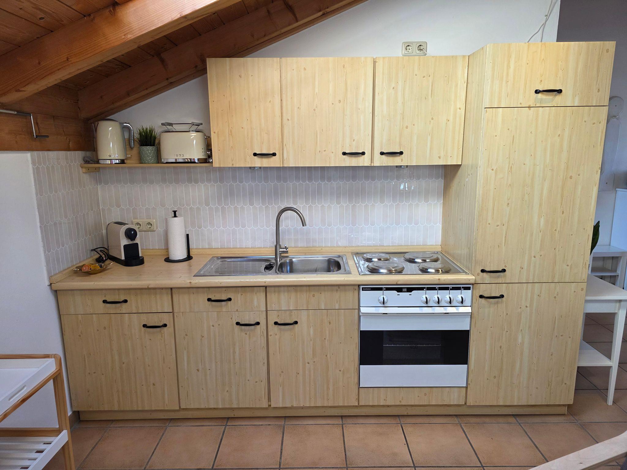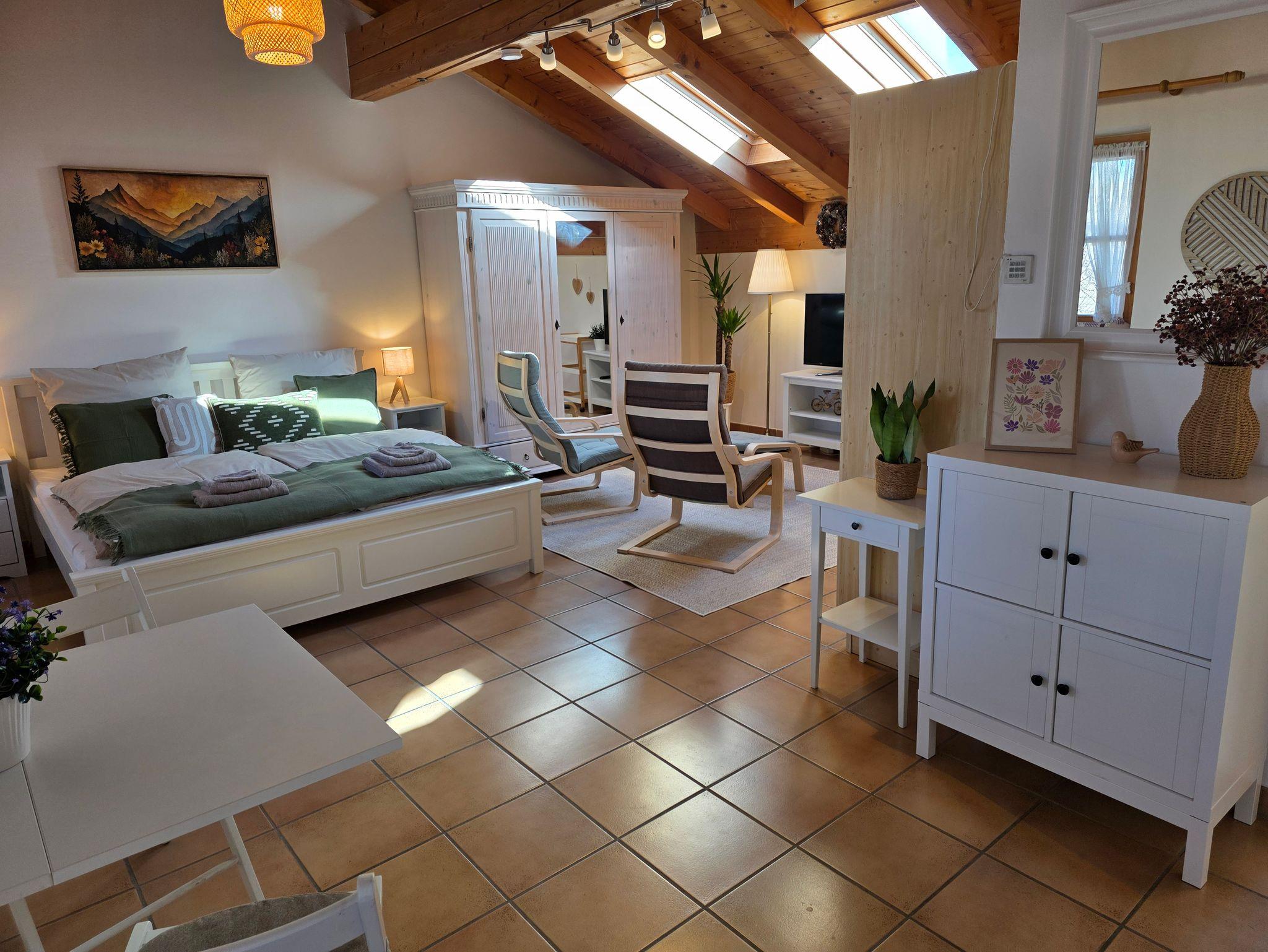 Unsere liebevoll eingerichtete Ferienwohnung bietet auf 30 m² alles, was Sie für einen entspannten Aufenthalt brauchen. Der helle Wohn,- Schlaf,- und Küchenbereich befindet sich in einem großzügigen Raum mit hohen Decken, was der Wohnung ein besonders luftiges und gemütliches Ambiente verleiht. Durch die Lage im Dachgeschoss ist die Wohnung sehr lichtdurchflutet und strahlt eine warme, einladende Atmosphäre aus.