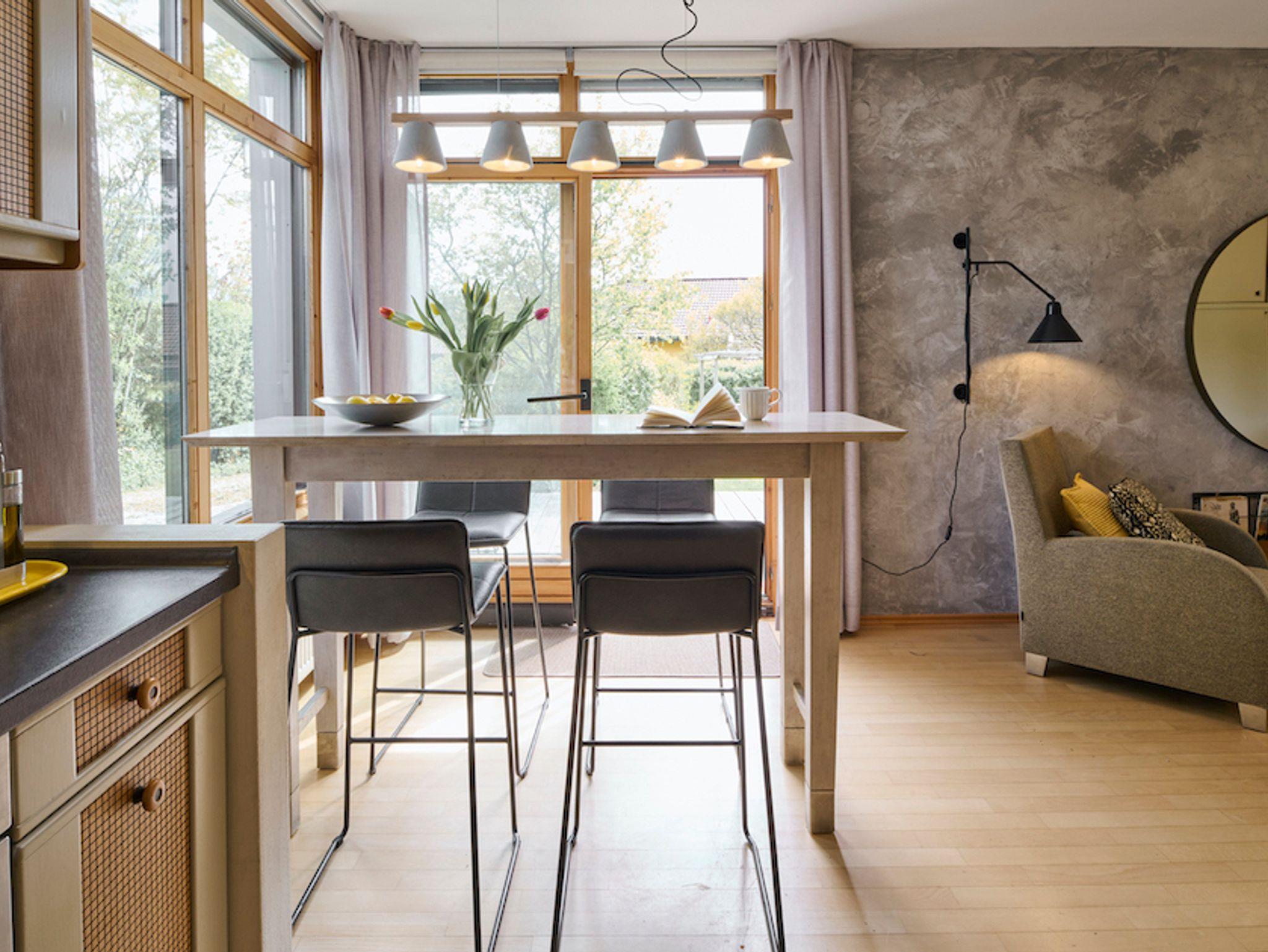 Heller Essbereich mit ausziehbarem Esstisch für bis zu 10 Personen und gemütlichen Sesseln vorm Kamin. Arbeitsplatz im Erdgeschoss.