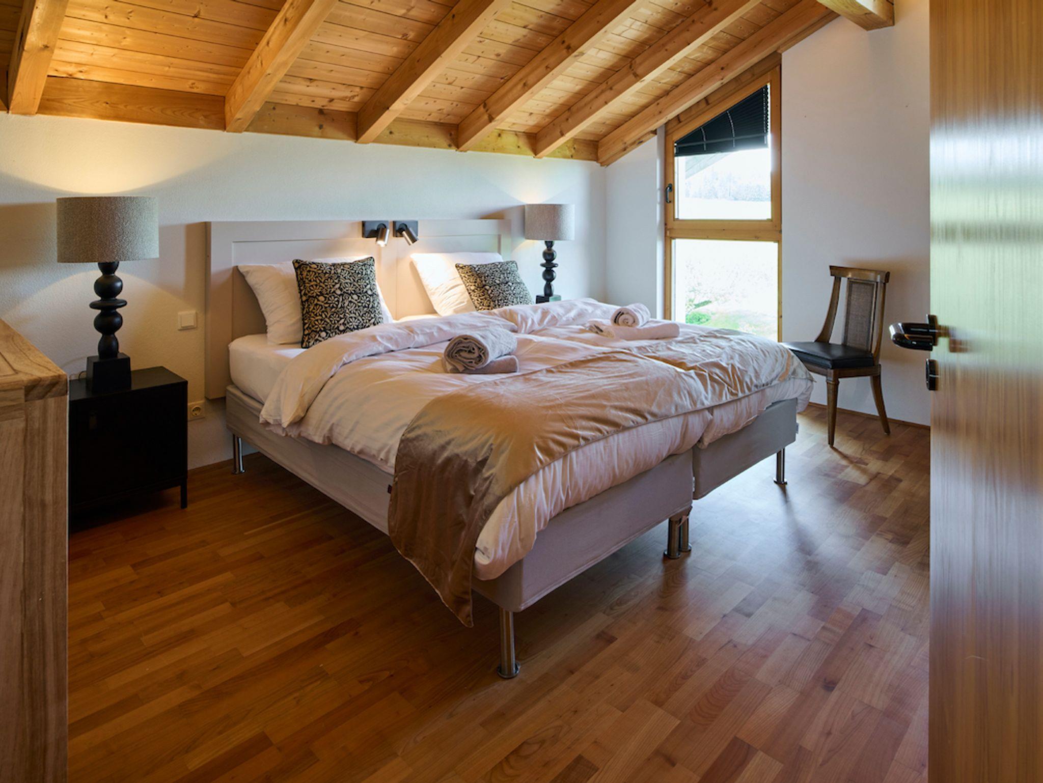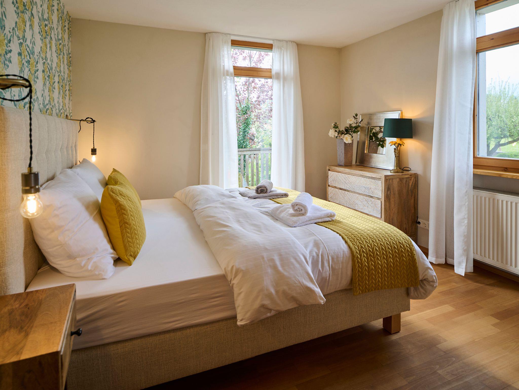 Alle 4 Schlafzimmer sind sehr ruhig gelegen, mit Blick ins Grüne und mit hochwertigen, sehr bequemen Betten ausgestattet. Leselampen und freie Steckdosen am Bett sind selbstverständlich vorhanden. Die beiden Doppelzimmer im Erdgeschoss teilen sich ein großzügiges Badezimmer, die beiden anderen Zimmer verfügen über jeweils ein eigenen Badezimmer. Drei der Schlafzimmer haben direkten Zugang zum Balkon bzw. zur Terrasse.