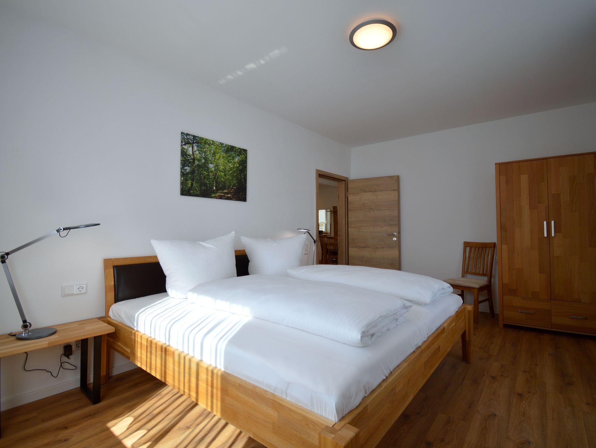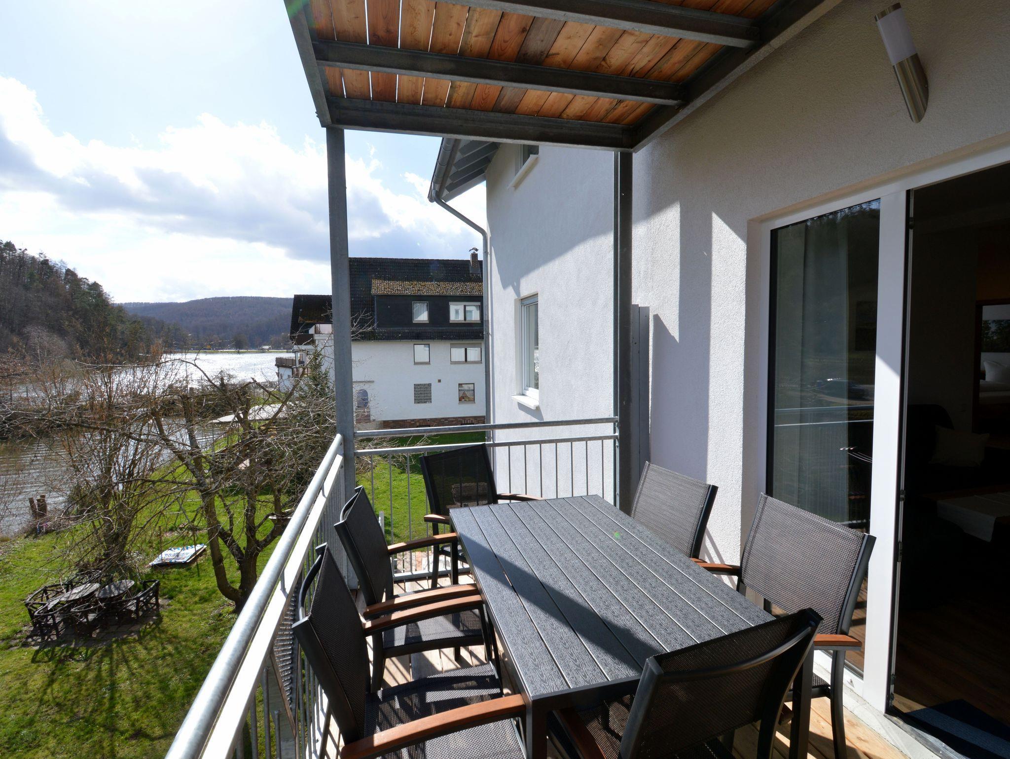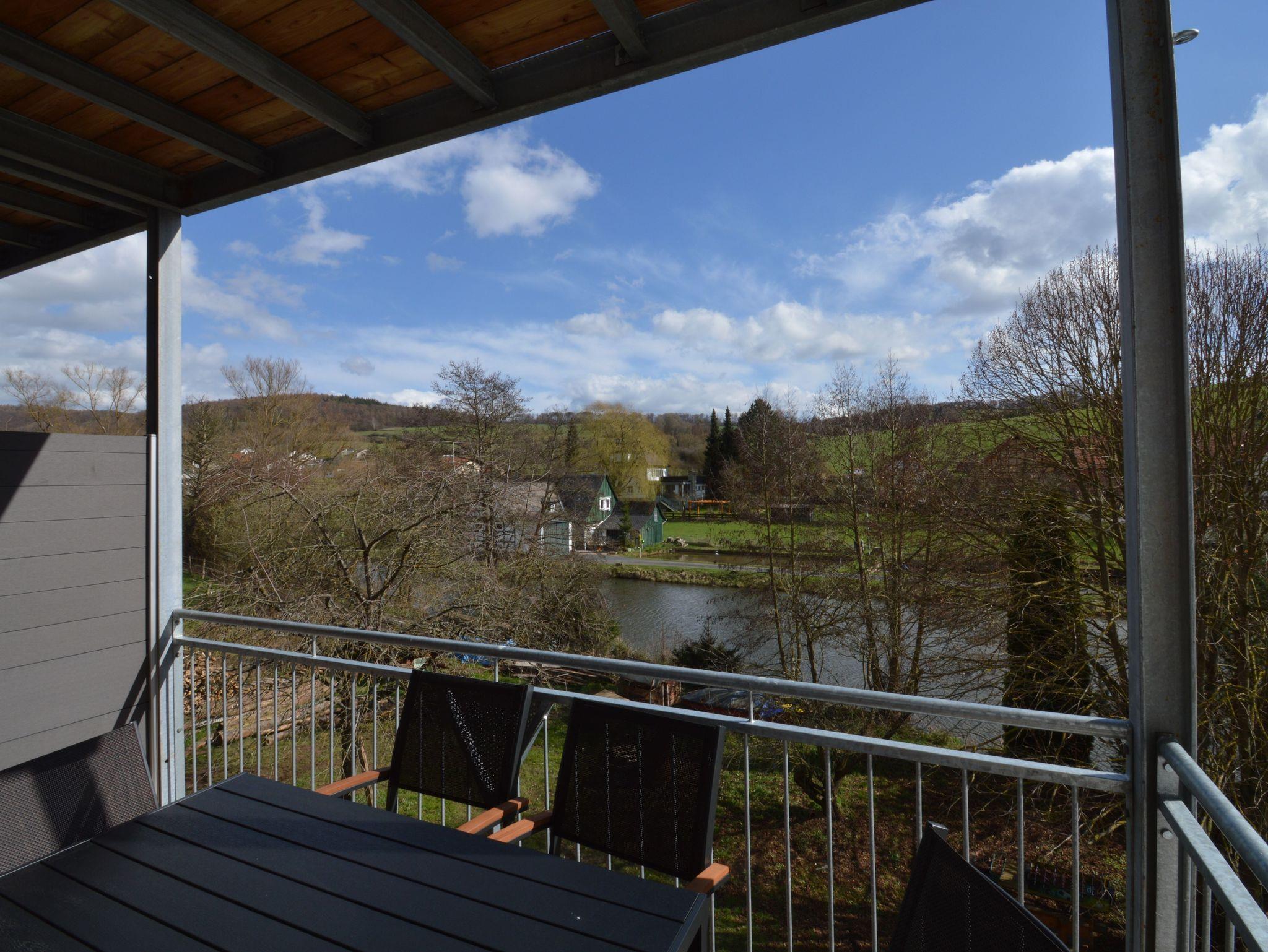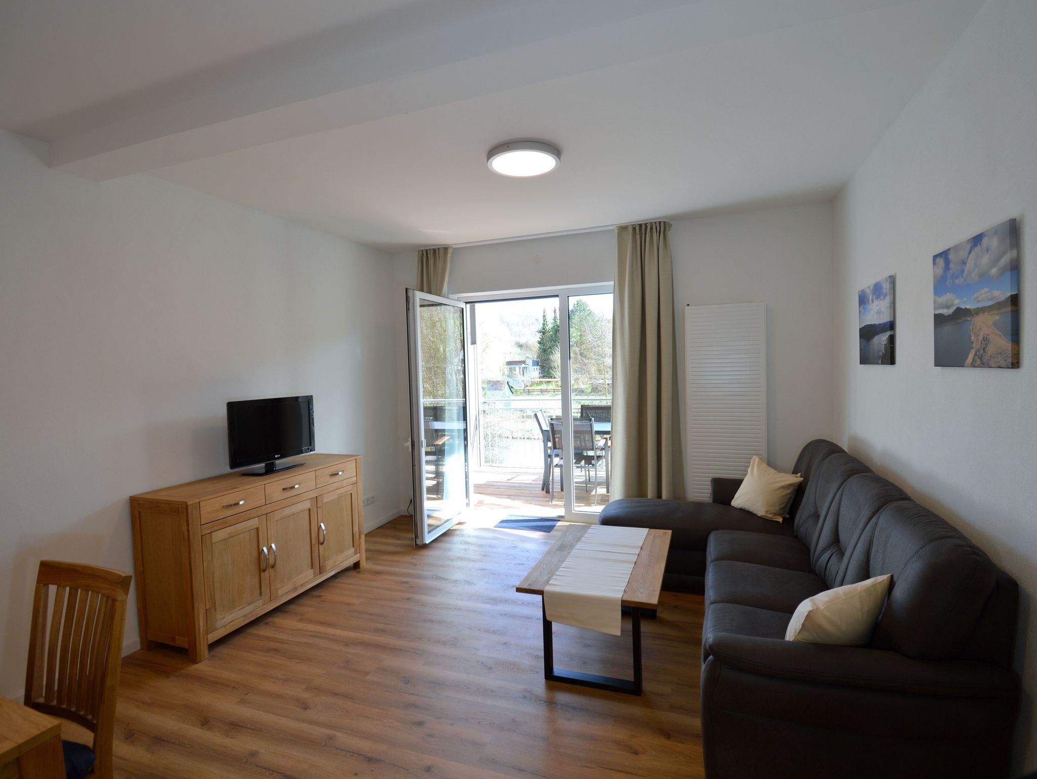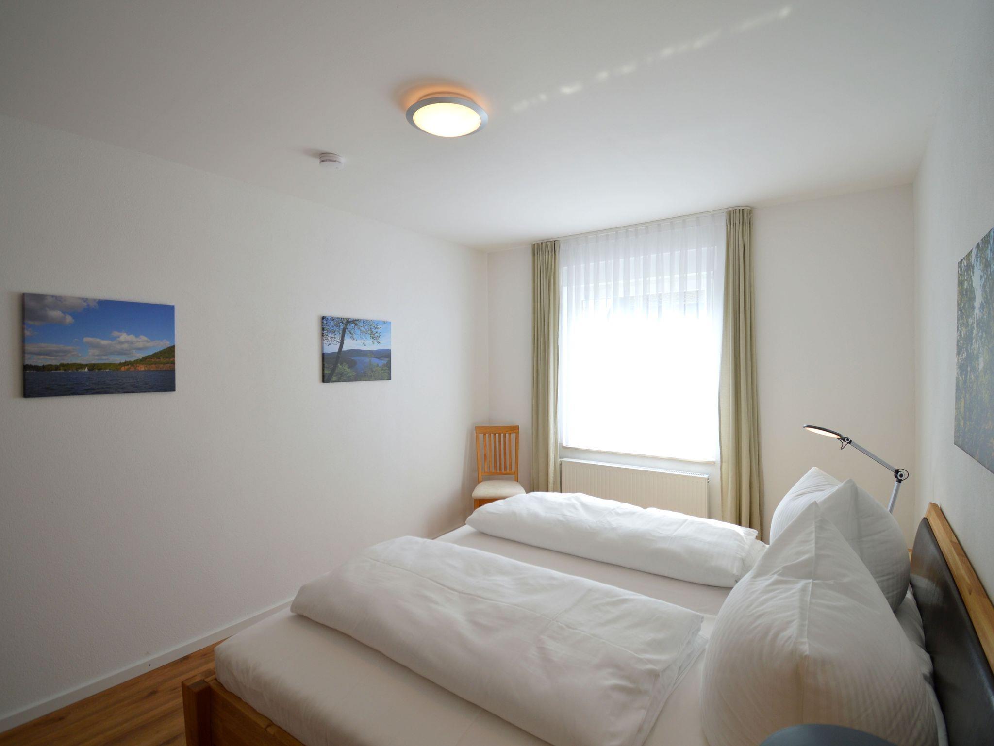 Die moderne Drei-Zimmer Wohnung liegt im ersten Stock unseres Hauses. Die Wohnung ist mit 82 qm perfekt für einen Urlaub zu viert. Es sind zwei Schlafzimmer mit jeweils einen großen Doppelbett (200 cmx 200 cm) vorhanden. Besonderes Highlight im Schlafzimmer sind die Nachttischlampen mit verschiedenen Lichtstimmungen, je nachdem, ob Sie helles Licht zum Lesen benötigen oder ein warmes Licht zum Relaxen. Die Schlafzimmer lassen sich für besonders erholsame Nächte komplett verdunkeln. Die große Küche ist ausgestattet mit Kühl- und Gefrierschrank, Spülmaschine, Kaffeefiltermaschine, Wasserkocher, Toaster und Eierkocher und vieles andere, was Sie zum Kochen brauchen. Der Wohnbereich bietet sehr viel Platz um sich in Ruhe gemütlich zu entspannen. Das Badezimmer verfügt neben dem WC über ein Urinal und eine ebenerdige Dusche mit mobilen Duschsitz. Auf dem Balkon lässt es sich in der Morgensonne mit einem Blick auf den Nationalpark und das Vorstaubecken des Edersees gut frühstücken.