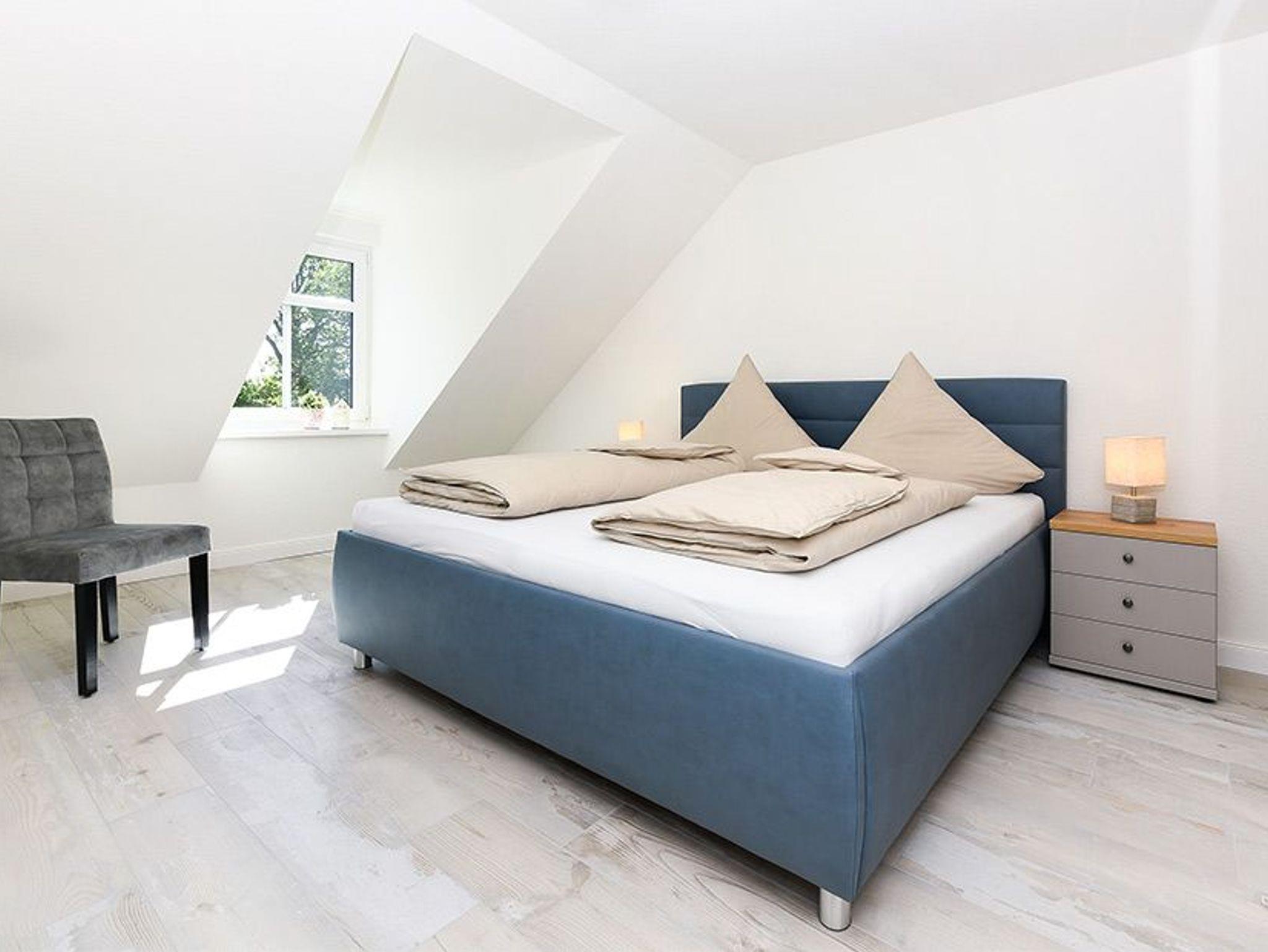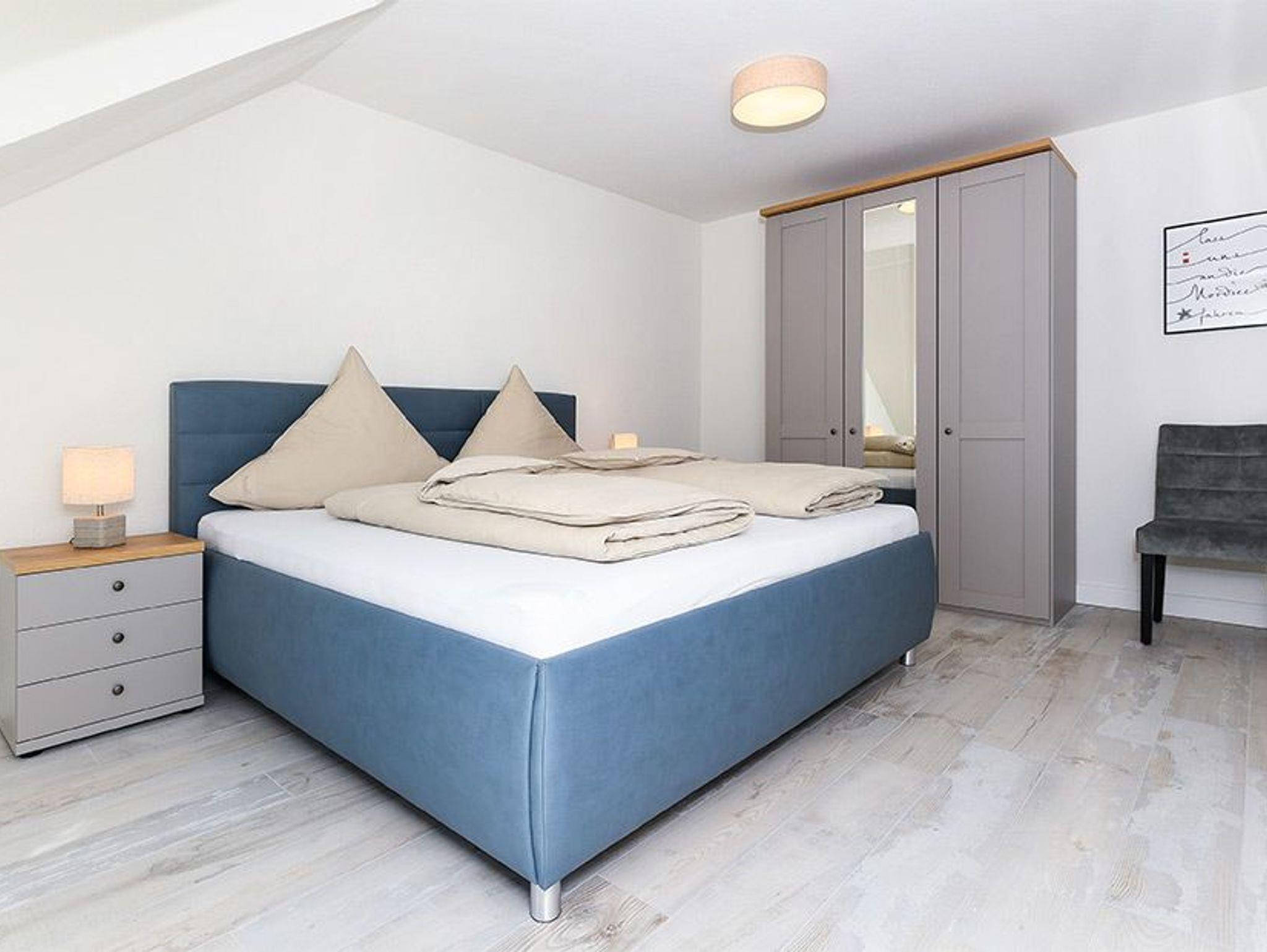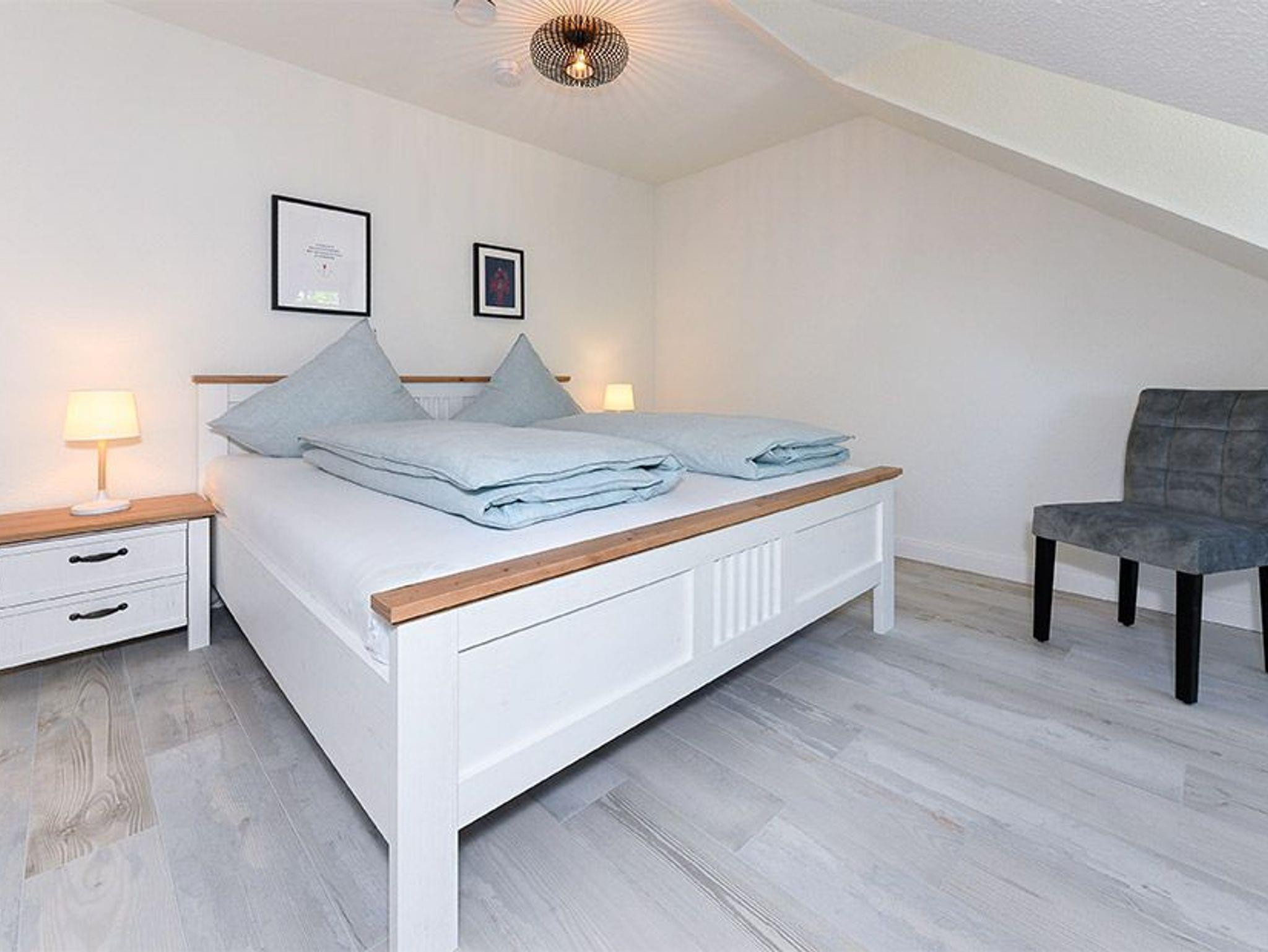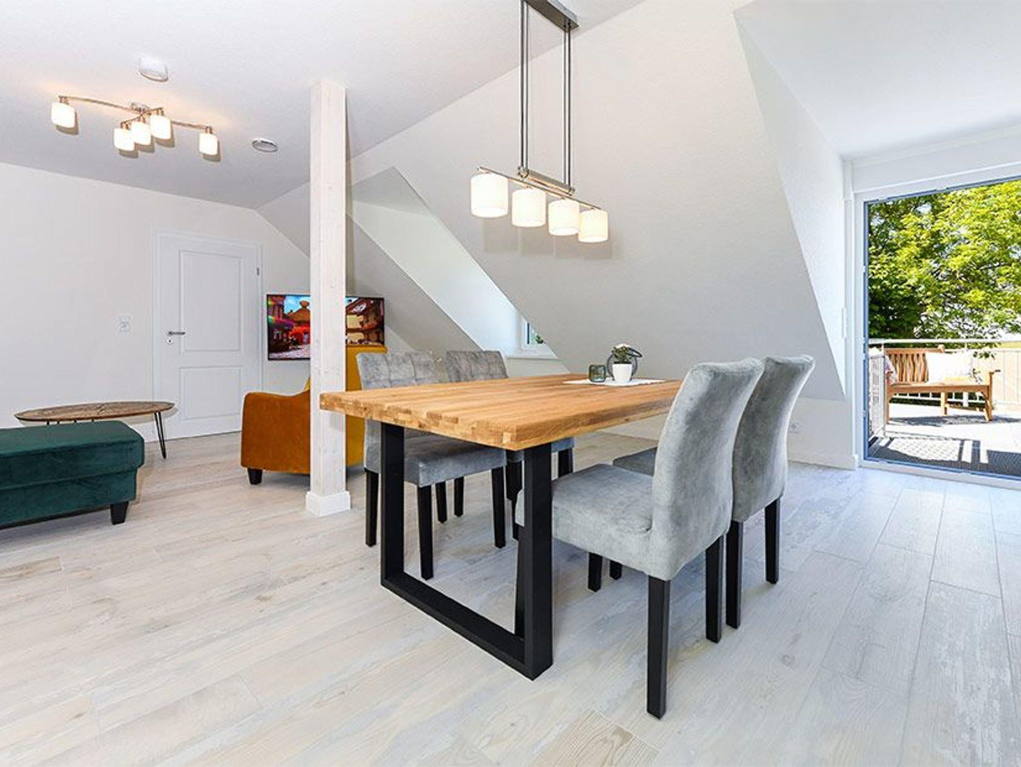 Größe ca. 80 Quadratmeter, Wohnraum mit integrierter Küche, Schlafzimmer, zweites separates Schlafzimmer/Kinderzimmer, Badezimmer mit Dusche, Waschtisch und WC, Obergeschoss, Balkon, optimal für 2 bis 4 Personen.