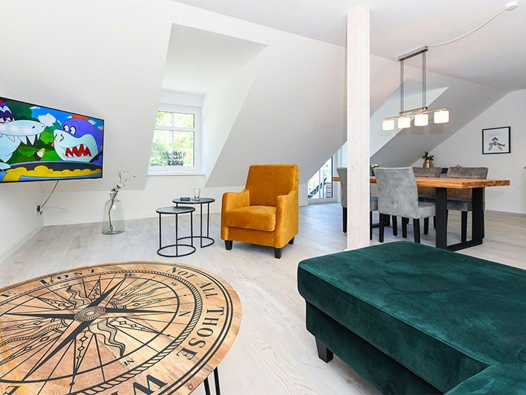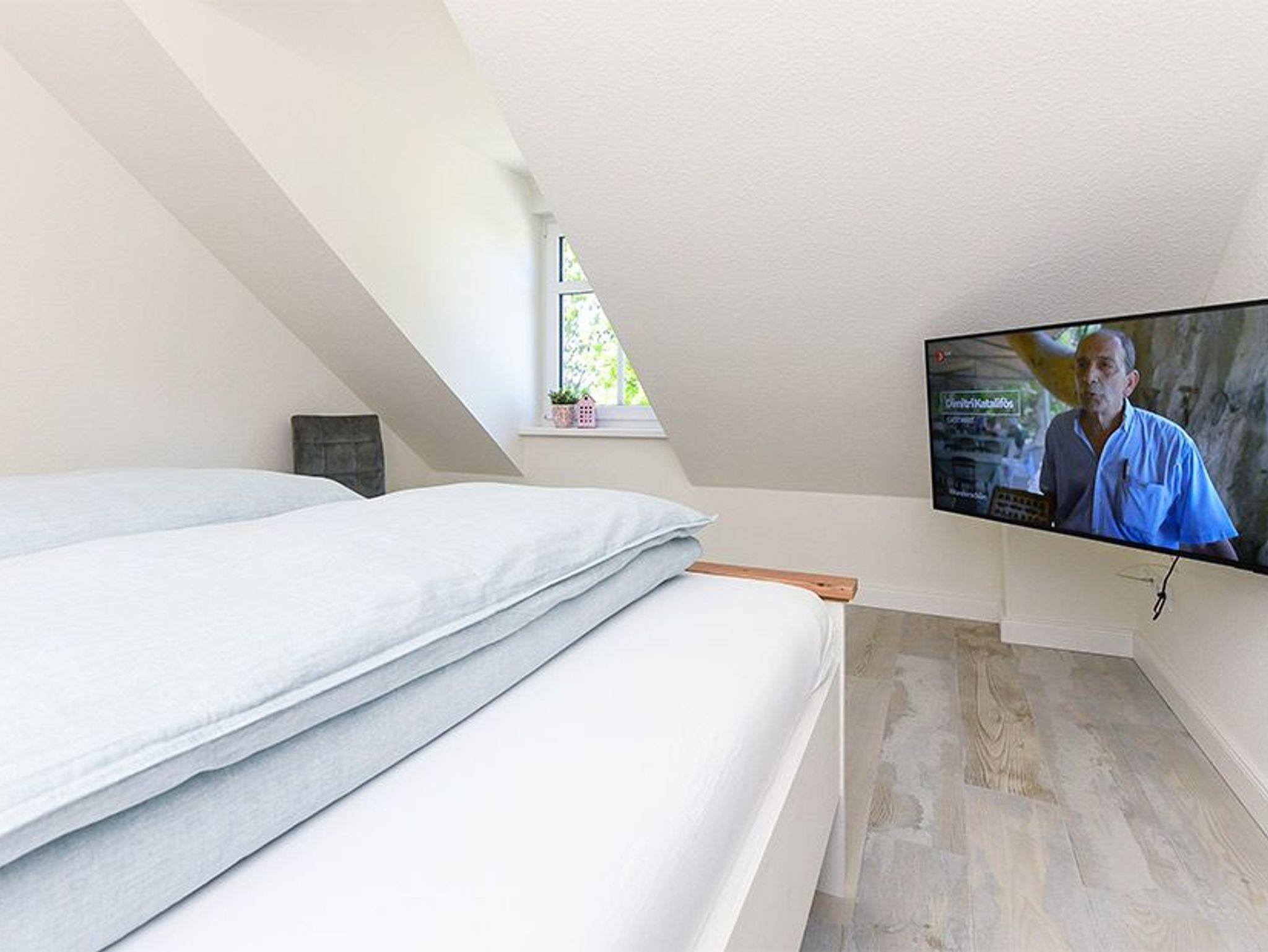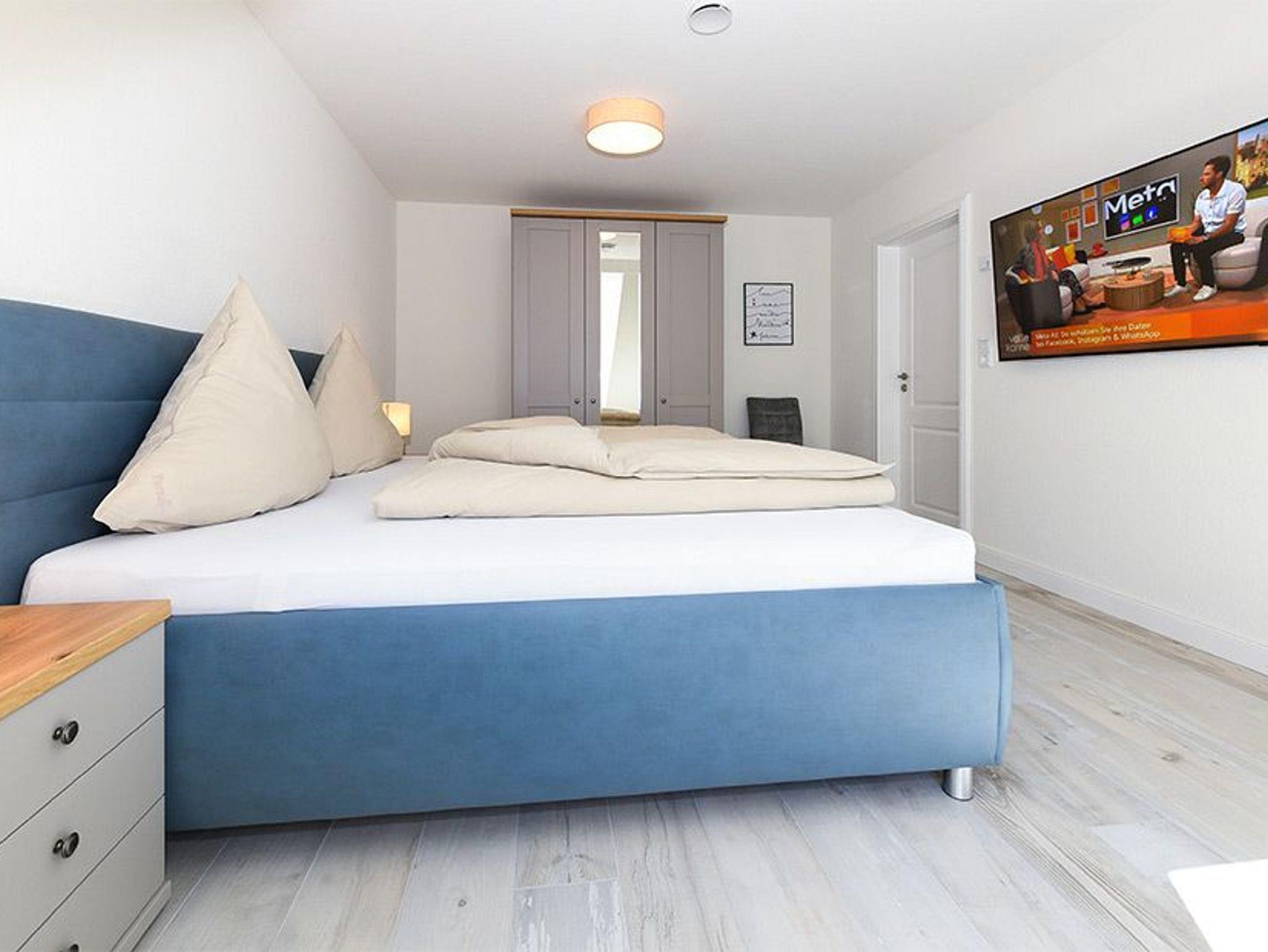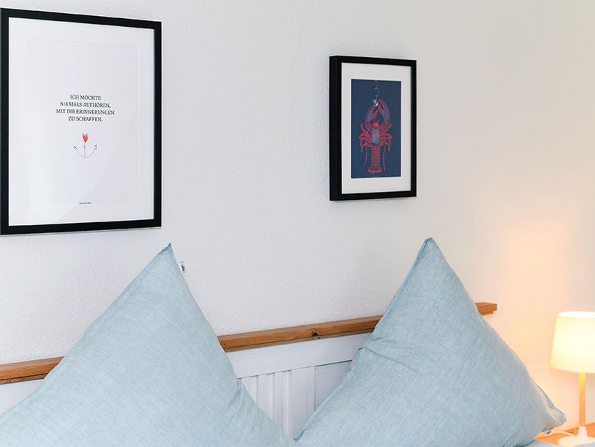 Größe ca. 80 Quadratmeter, Wohnraum mit integrierter Küche, Schlafzimmer, zweites separates Schlafzimmer/Kinderzimmer, Badezimmer mit Dusche, Waschtisch und WC, Obergeschoss, Balkon, optimal für 2 bis 4 Personen.