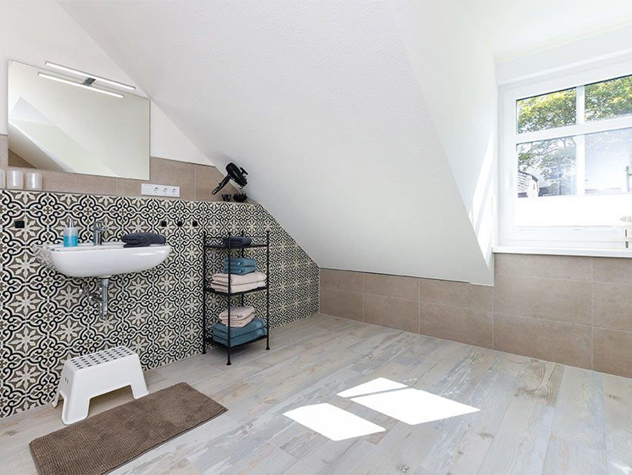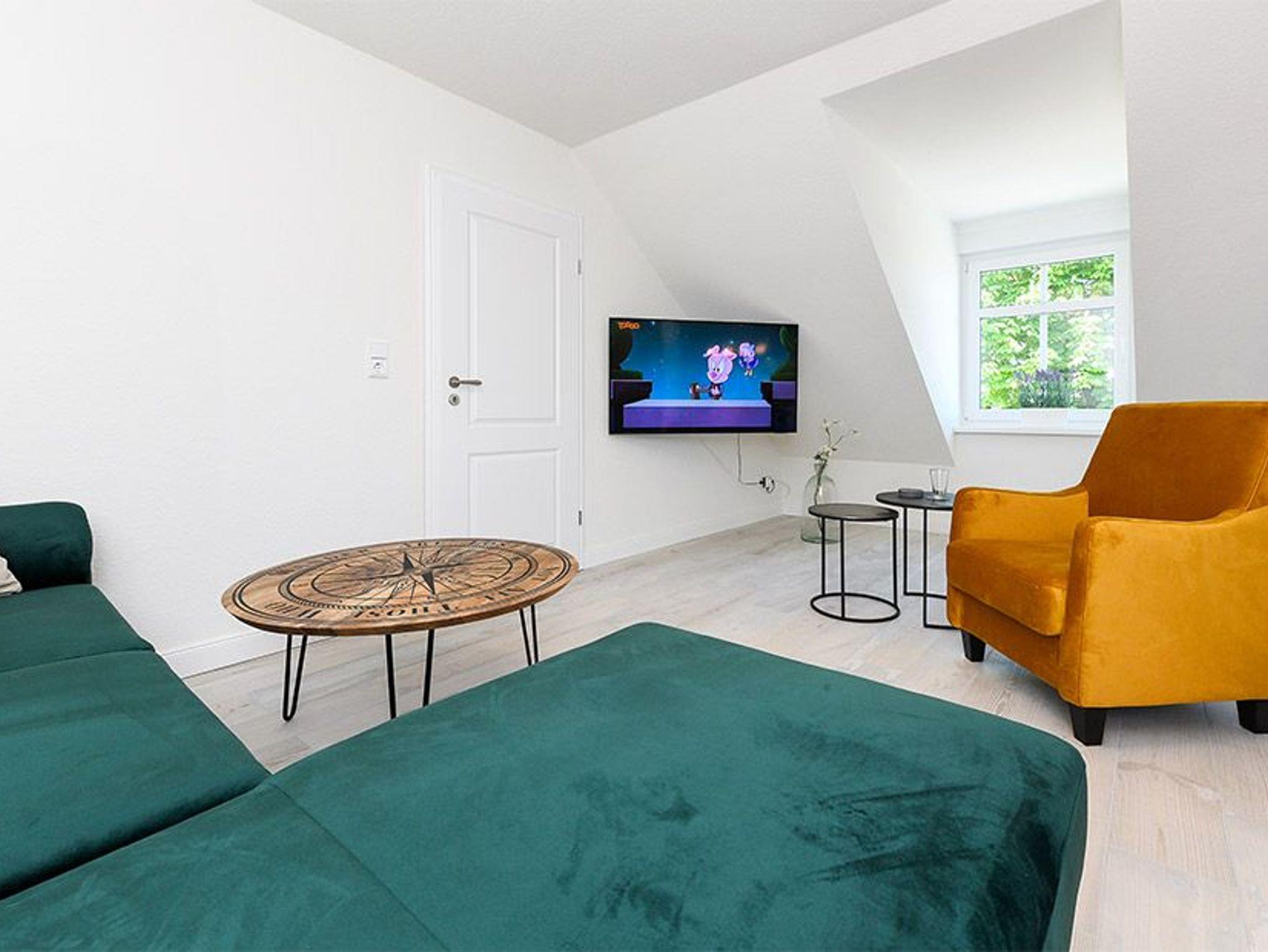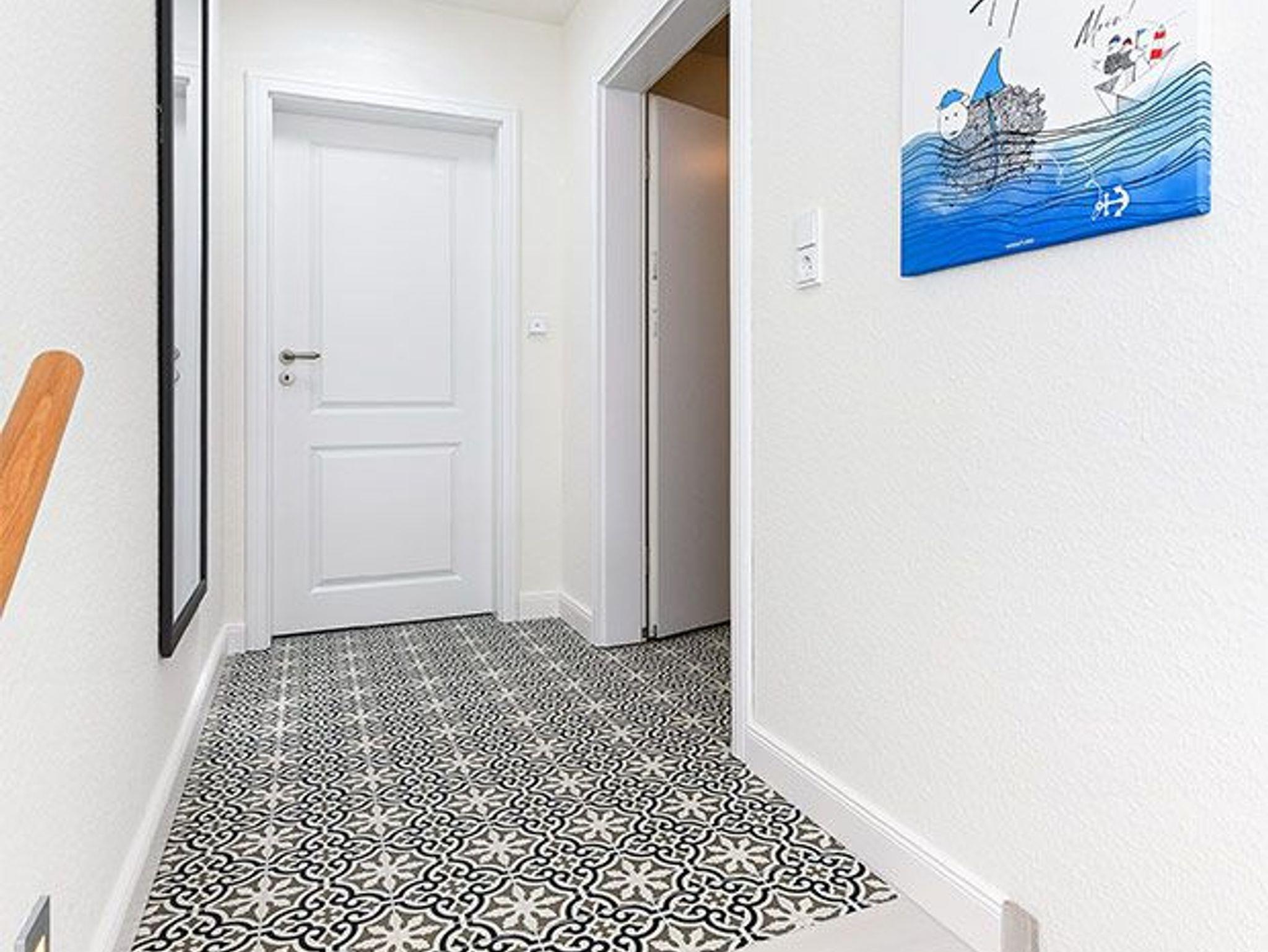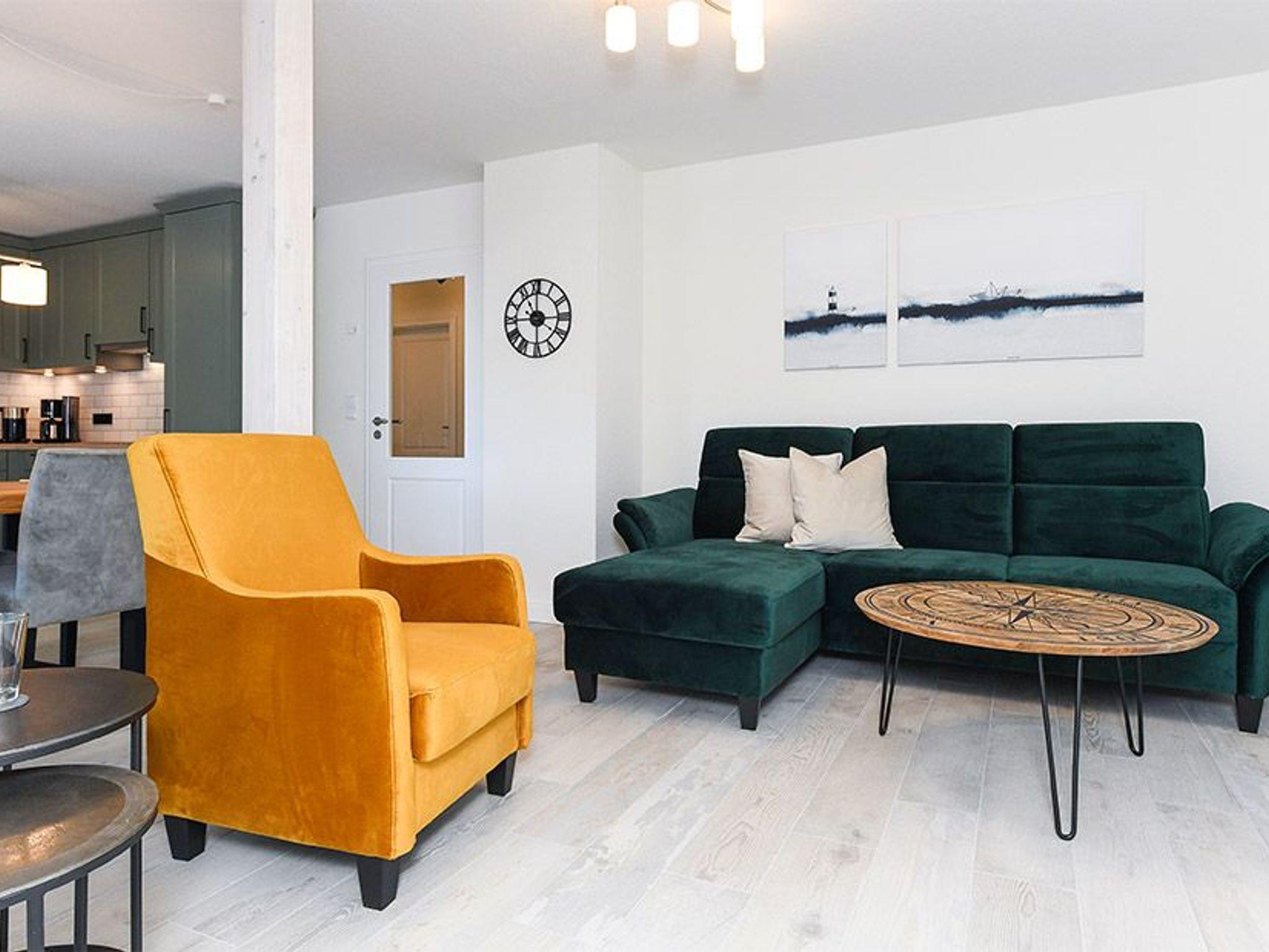 Größe ca. 80 Quadratmeter, Wohnraum mit integrierter Küche, Schlafzimmer, zweites separates Schlafzimmer/Kinderzimmer, Badezimmer mit Dusche, Waschtisch und WC, Obergeschoss, Balkon, optimal für 2 bis 4 Personen.