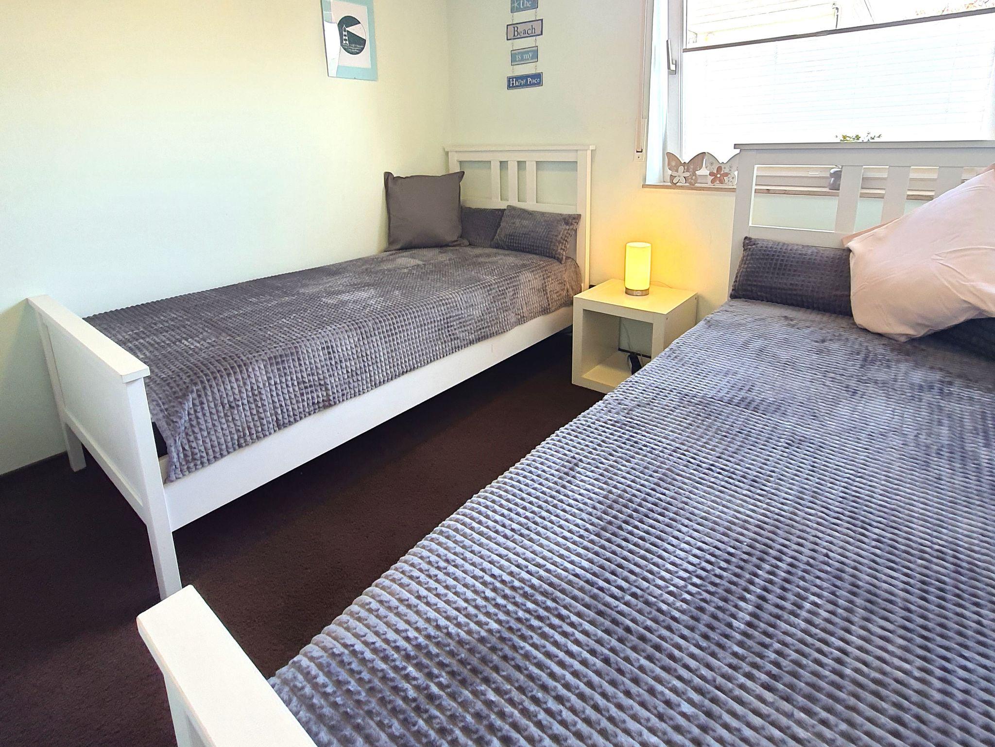 Übernachten im Bungalow mit Terrasse und Garten für 4 Personen. Das Ferienhaus verfügt über 2 separate Schlafzimmer, Wohnzimmer und Küche, sowie Badezimmer. Das Wohnzimmer ist ist mit einer Couch, Smart-TV und Internetradio ausgestattet. Die Küche mit Essecke verfügt über alle Küchengeräte für Ihren erholsamen Urlaub. Vom Wohnbereich geht aus auf die Terrasse mit angrenzender Liegewiese. Hunde sind erlaubt, bitte bei Buchung mit angeben.