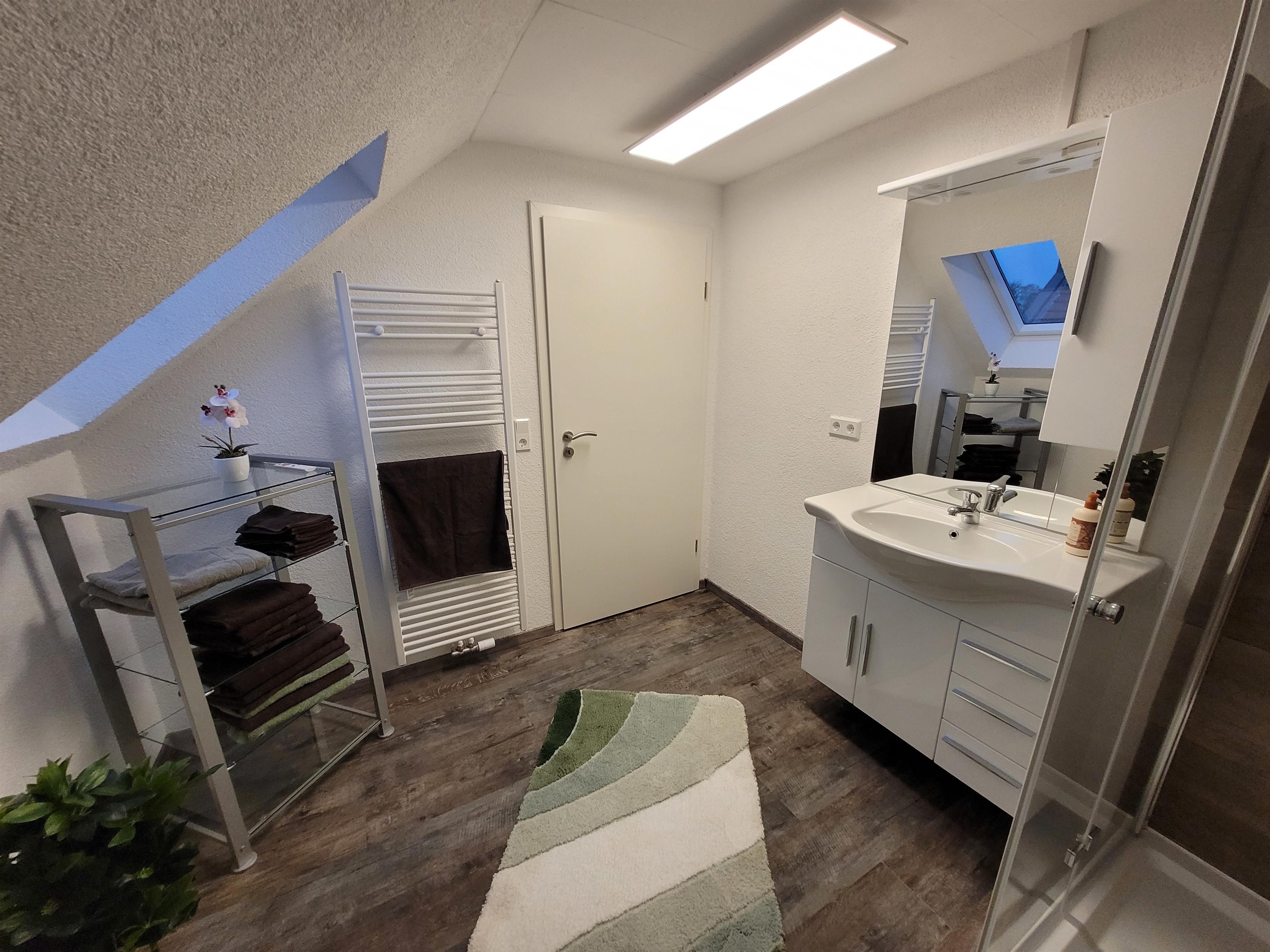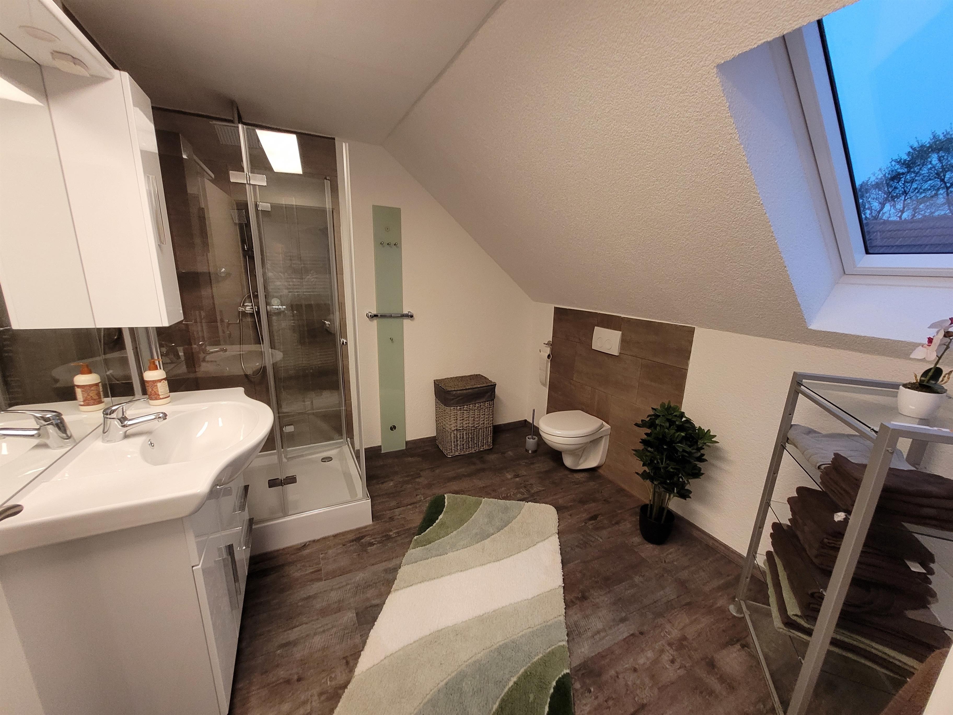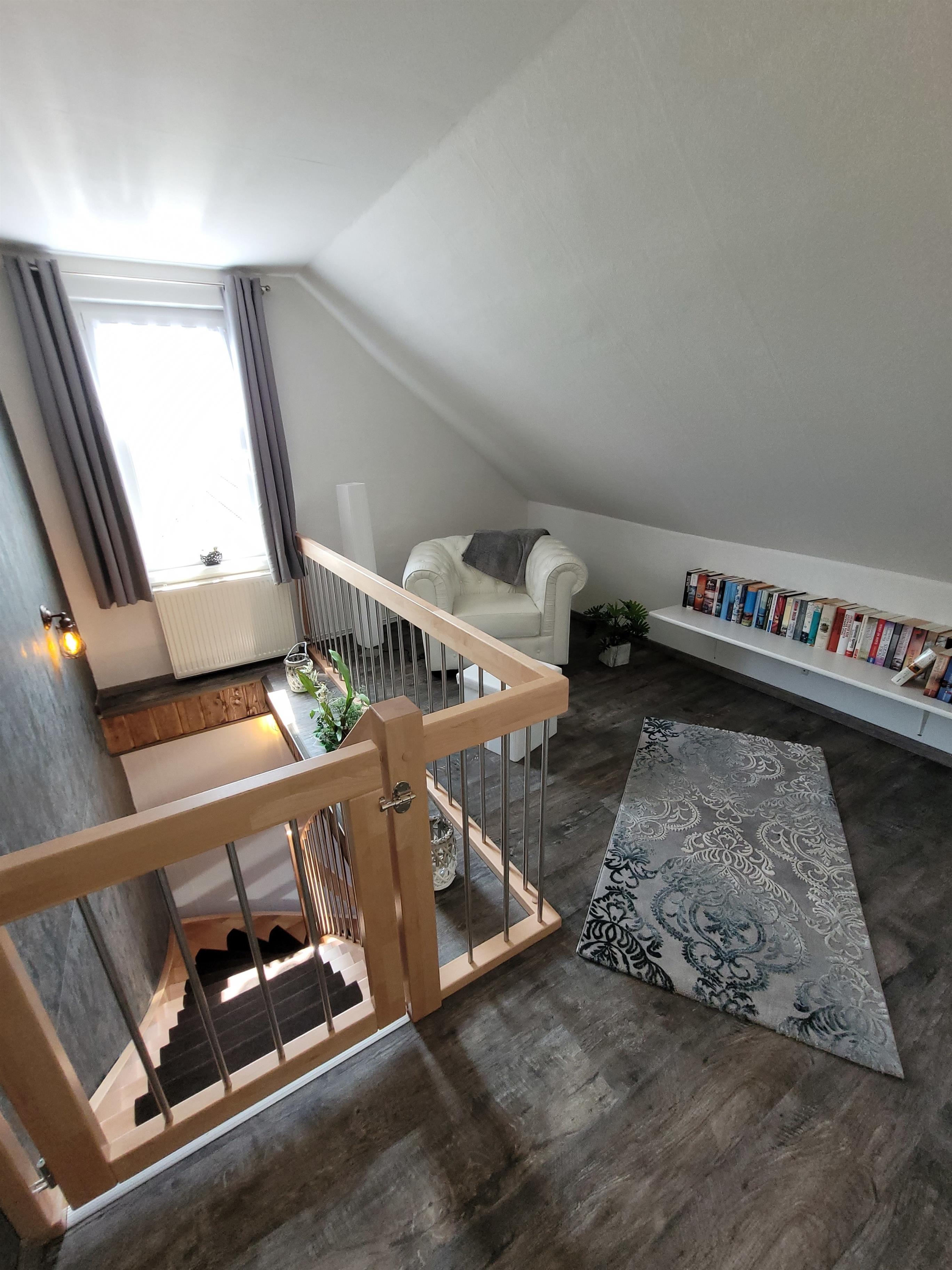 Die obere Ferienwohnung 2, mit separater Einfahrt und Parkplatz direkt vor der Eingangstür hat rund 100 m² und ist für 4 (max. 5) Personen geeignet. Eine Leselounge mit Bücherregal und einem bequemen Ledersessel befindet sich am oberen Ende der Treppe. Das angrenzende Gäste-WC , ein großes Bad mit WC und Dusche, die 2 Schlafzimmer mit je einem Doppelbett und die große Wohnküche mit ausziehbarem Schlafsofa lässt auch eine größeren Familie / Gruppe angenehme Zeit verbringen. Die Einbauküche ist ausgestattet mit einem Kühlschrank (inkl. Tiefkühlfach), Herd mit Cerankochfeld, Geschirrspüler, Mikrowelle ,Toaster und Kaffeemaschine, Eierkocher ,etc..