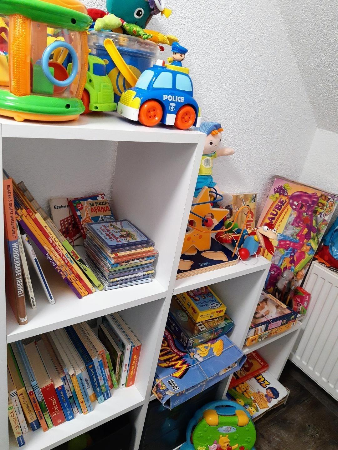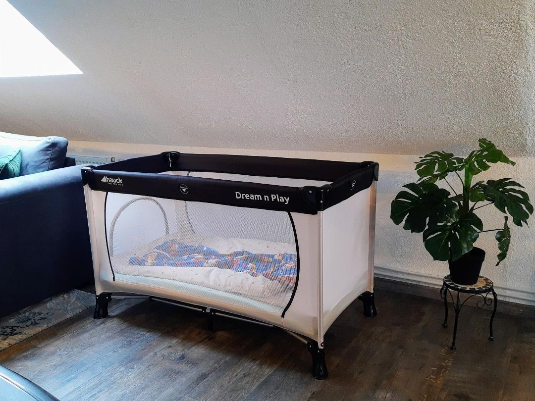 Ein Spielbereich, Wickelkommode und Kinderbett sind vorhanden.