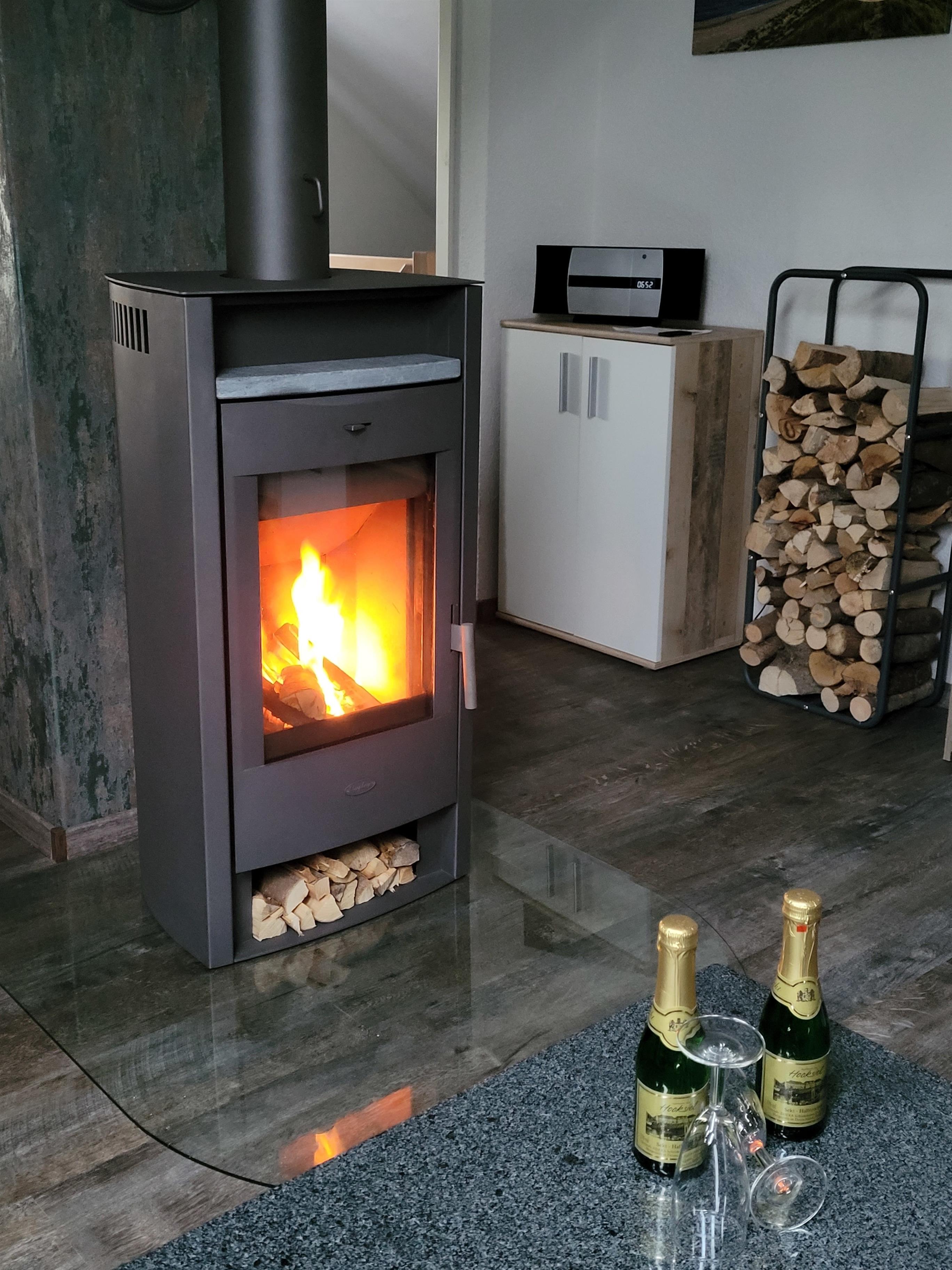 Das offene Wohnzimmer mit Kamin machen die Wohnung auch bei schlechtem Wetter gemütlich. Ein Flachbildfernseher mit Netflix- und Prime-Funktion befindet sich sowohl im Wohnzimmer als auch in einem der beiden Schlafzimmer.