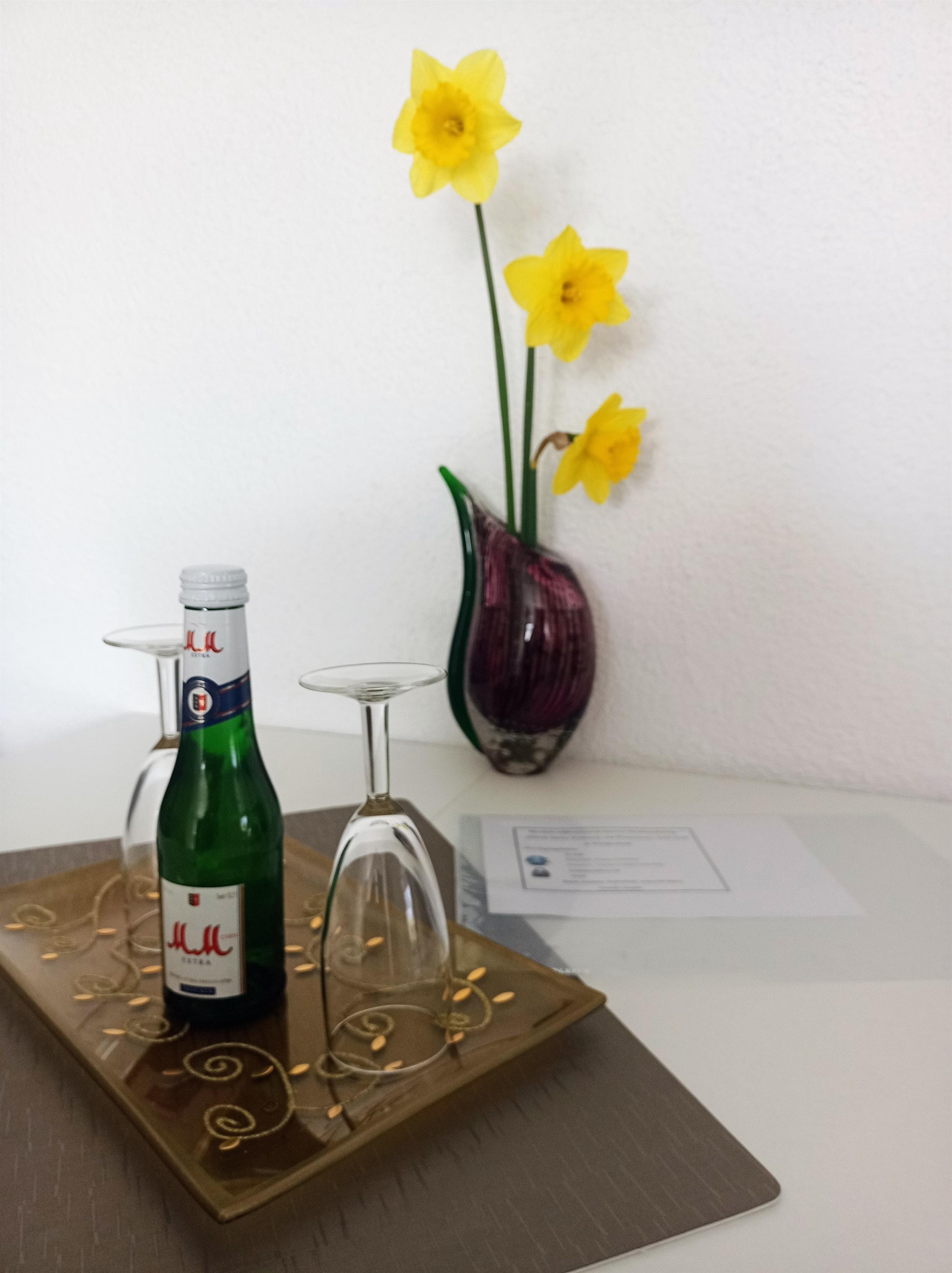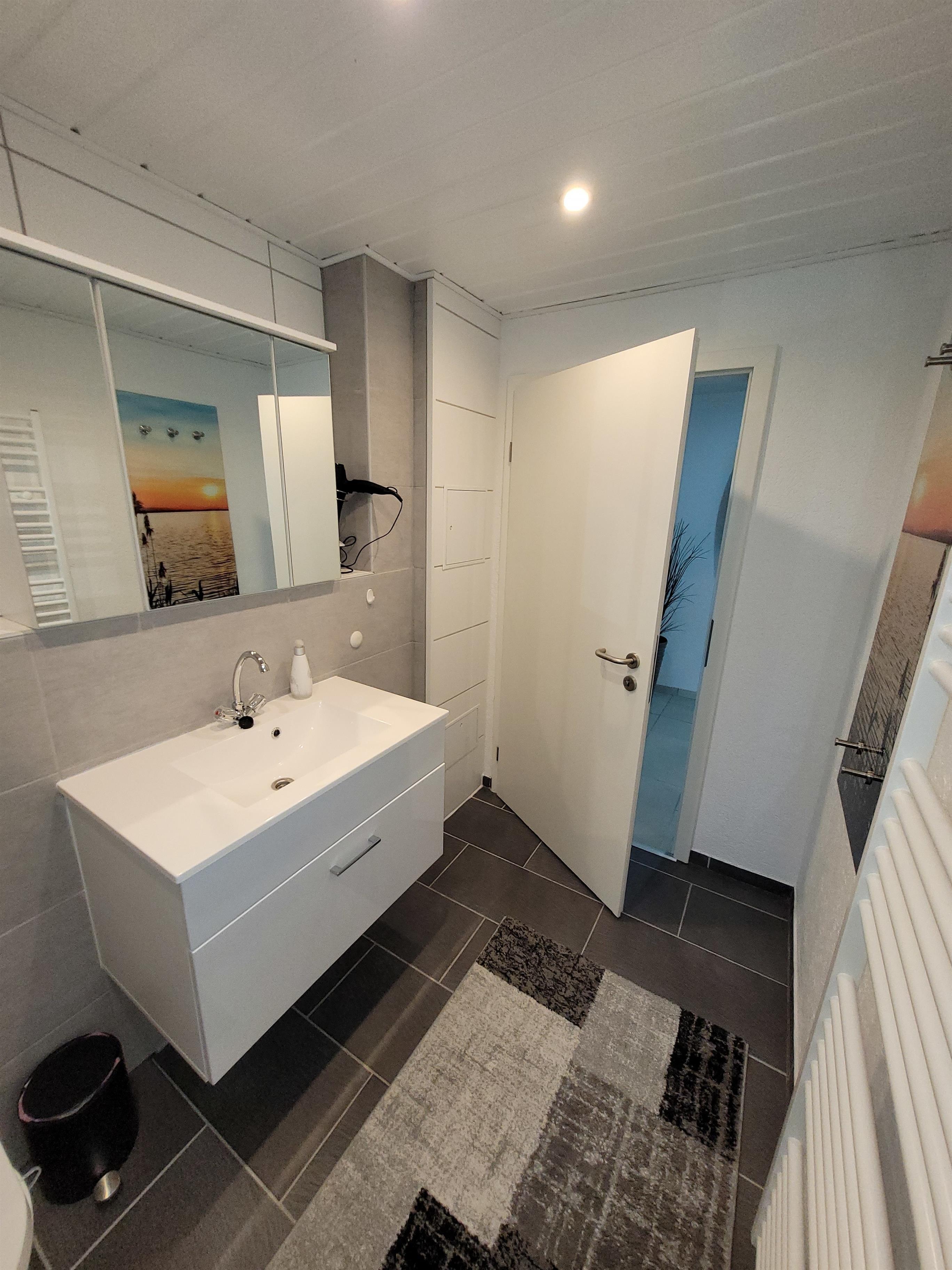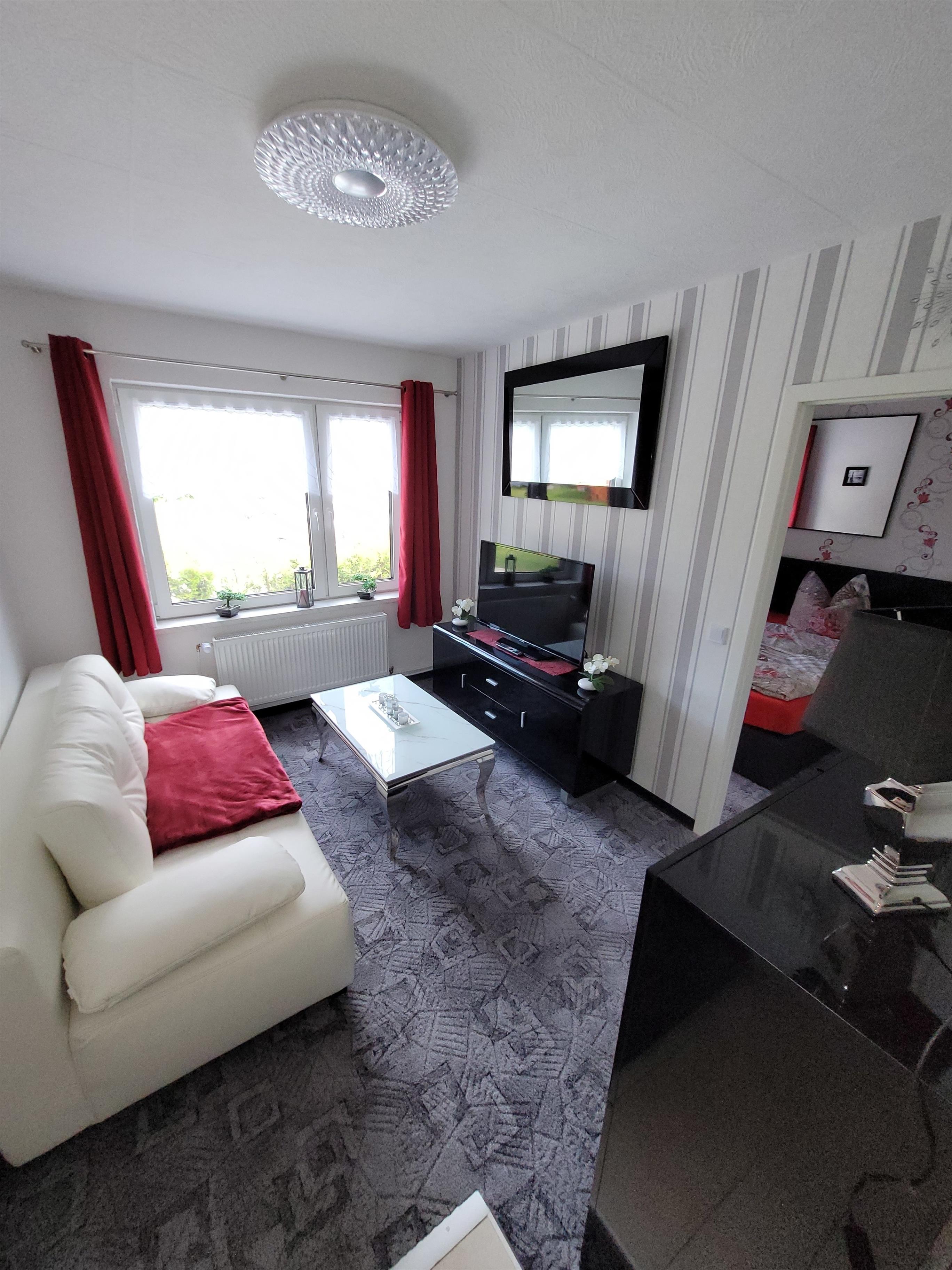 Direkt von der Südterrasse gelangt man in die Küche, welche mit Cerankochfeld, erhöhtem Backofen, Geschirrspüler, Mikrowelle, Kühl- und Gefrierkombination, Toaster, Kaffeemaschine, Eierkocher etc. ausgestattet ist. Eine kleine Sitzecke rundet die gemütliche Küche ab. Das moderne Badezimmer hat eine große, ebenerdige Dusche, einen Waschtisch sowie den Handtuchheizkörper. Das ausziehbare Sofa im Wohnbereich lädt zum Kuscheln ein und kann auch als Bett verwendet werden. Der Flachbildschirm bietet Netflix- und Prime-Funktion mit selbstverständlich kostenfreien WLAN-Zugang. Zur Ausstattung dieser Wohnung gehört auch eine Radio-Stereoanlage mit CD-Player und USB-Eingang. Im angrenzenden Schlafzimmer bietet ein Boxspringbett hohen Schlafkomfort. Das Schlafempfinden ist weich und bequem und nicht hart. Das Rauchen in der Wohnung ist nicht gestattet.
