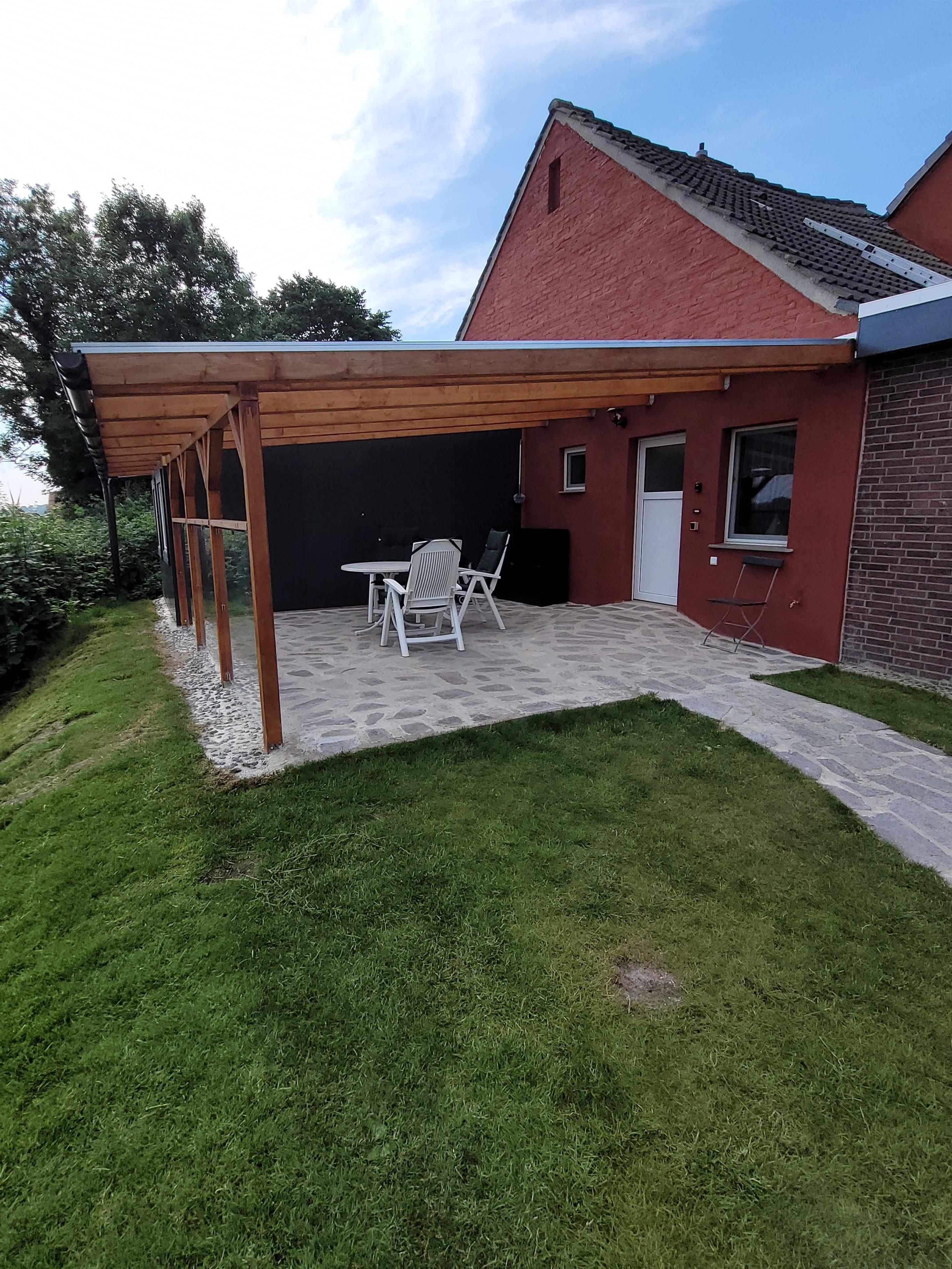 Eine überdachte Terrasse mit Windschutz und Terrassenmöbel sowie einem Grill laden auch bei Regen zum Verweilen ein.