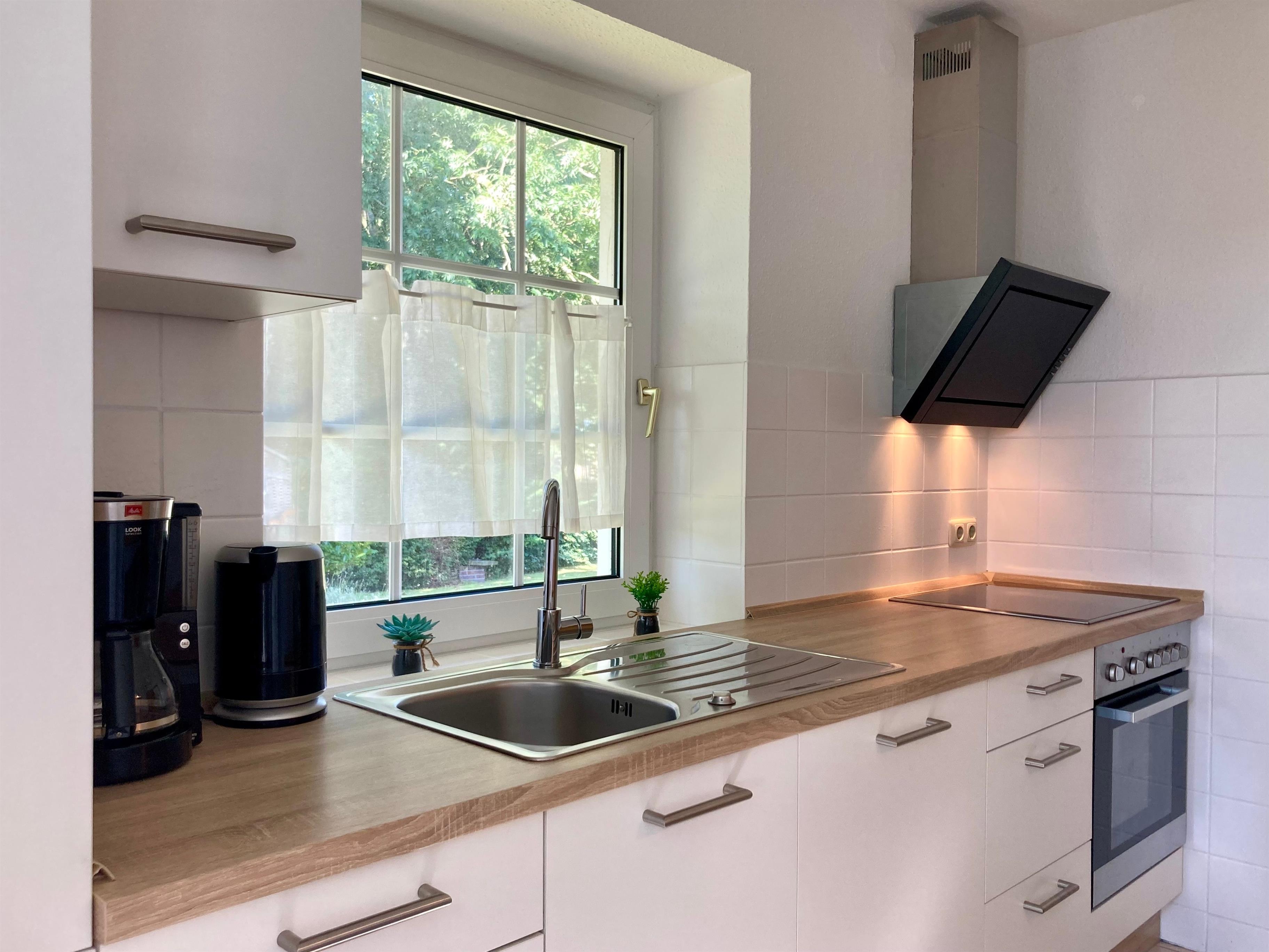 Separater Eingang, Flur. Wohn-/Schlafraum mit Sitzgruppe/Doppelbettcouch (1,40m x 2m), Smart/Sat-TV, Mini-Stereoanlage, Internetzugang (wlan, gratis), Zugang zu Wintergarten (unbeheizt) mit Essplatz sowie kleiner Sitzecke, von hier Ausgang ins Freie. Separate Küche (4 Kochfelder, Backofen, Geschirrspüler, Kühlschrank, Ka?eemaschine, Toaster, Wasserkocher) mit Essplatz, Zugang zu Wintergarten. Doppelzimmer. Dusche/WC, Waschmaschine.