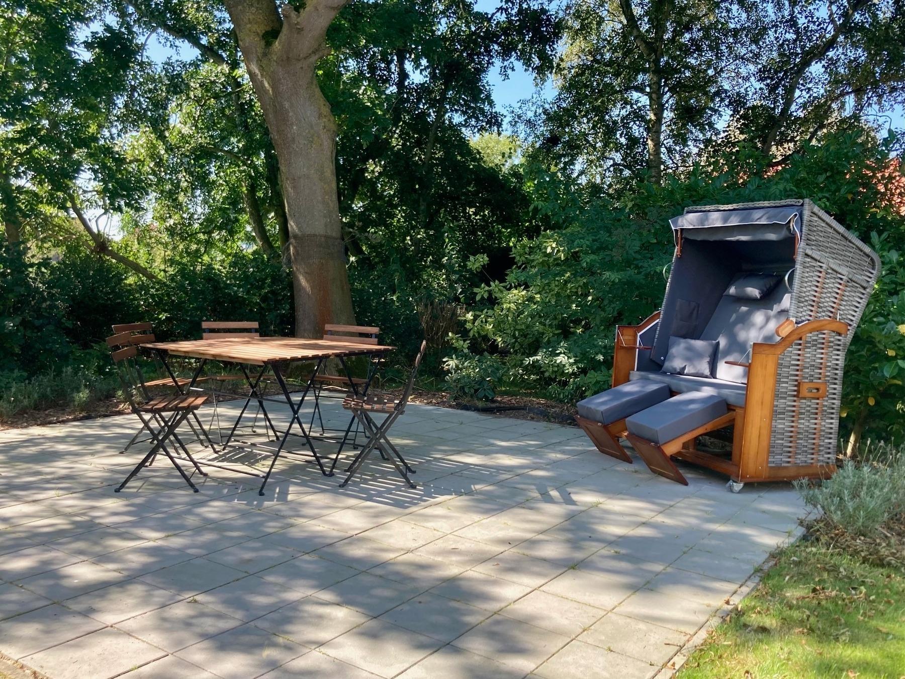 Die Woheinheit befindet sich in einem separaten Anbau und ist als einzige zur Hausrückseite ausgerichtet, Zugang zu kleinem Garten- und Rasenanteil mit altem Baumbestand sowie großer Terrasse mit Strandkorb, Tisch und 6 Stühlen zur gemeinsamen Nutzung. Über Hecken und Büsche unverbauter Blick über die angrenzenden Felder.