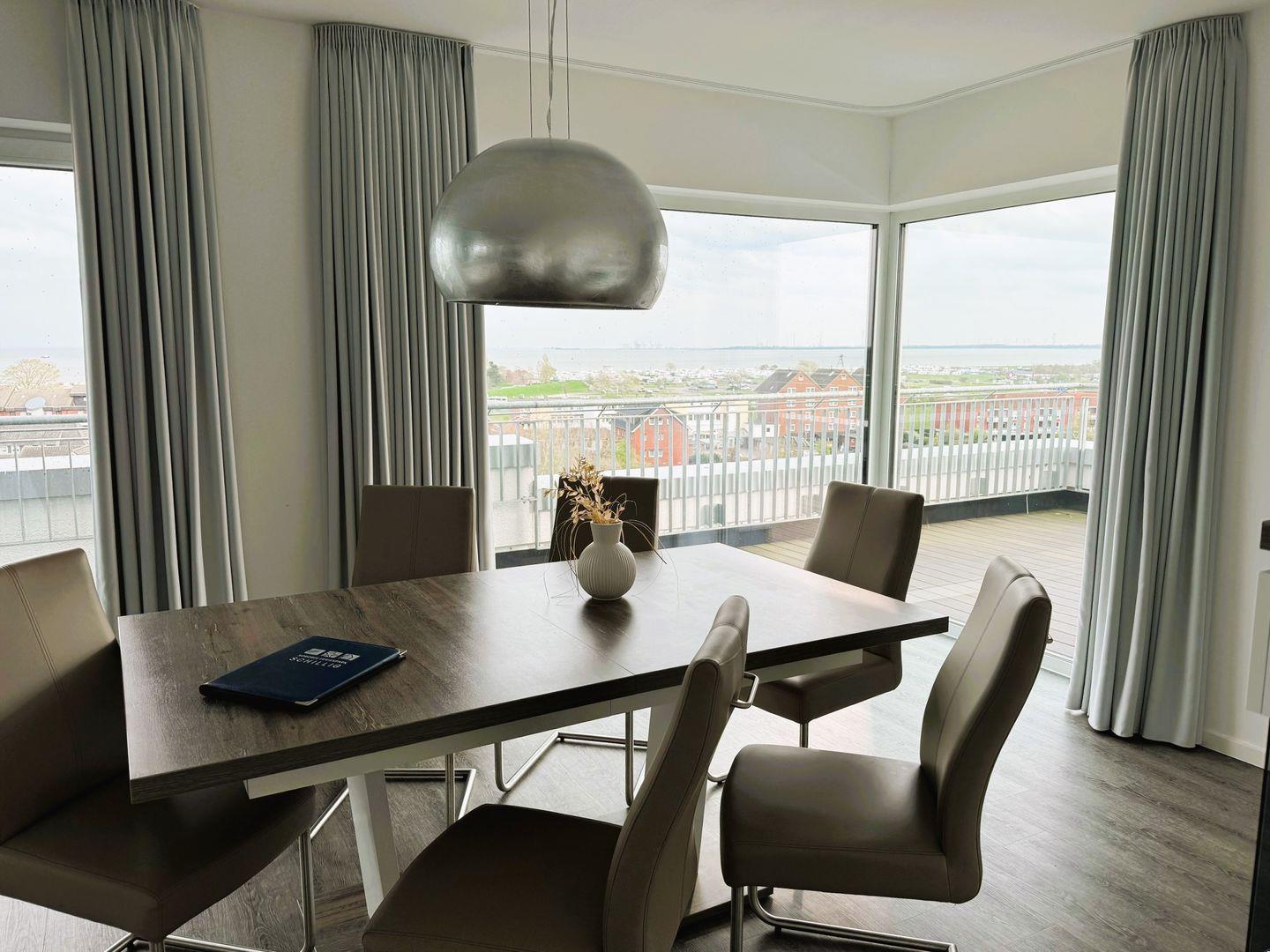 Der großzügige Wohn- Essbereich ist in warmen Farben möbliert und wird durch einen Kaminofen vollendet. Bei dem bekannten "friesischen Schietwetter" unterstreicht besonders dieser das gemütliche Ambiente.