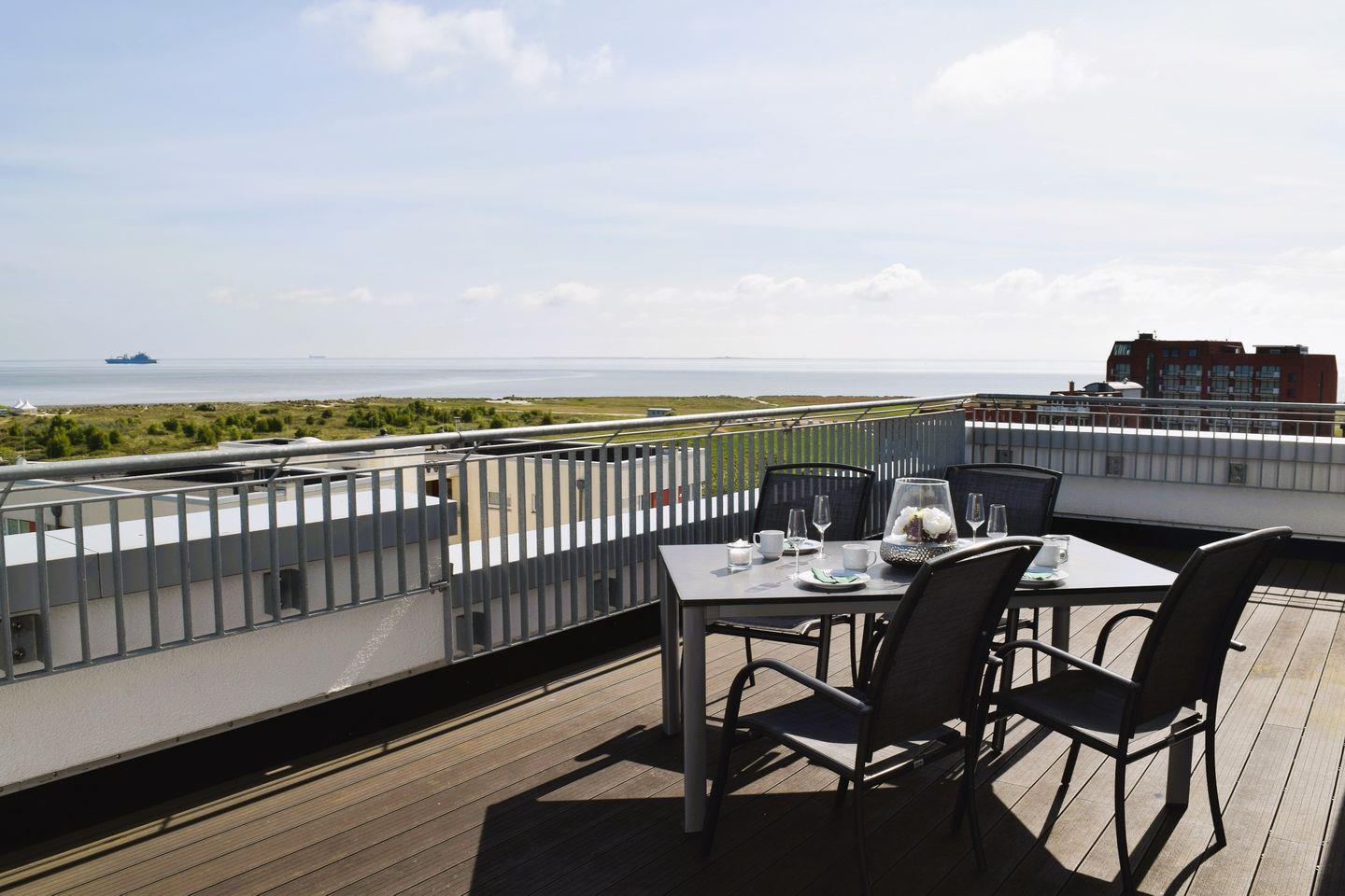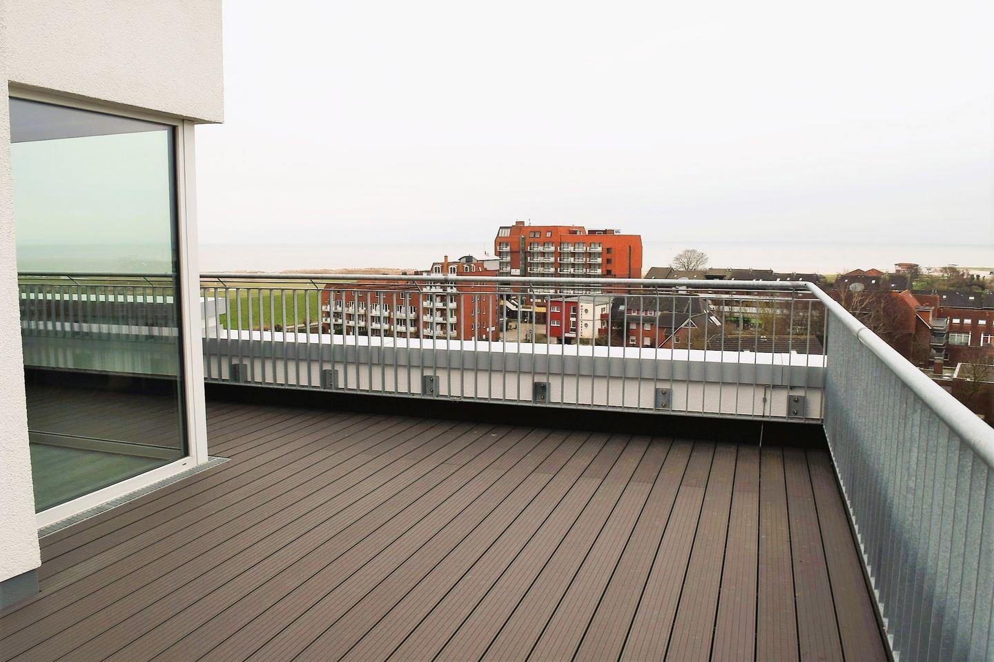 Die große, umlaufende und möblierte Dachterrasse erweitert das Platzangebot unter freiem Himmel um ca. 85 m². Hier erwartet Sie ein traumhafter Ausblick in beachtlicher Höhe.