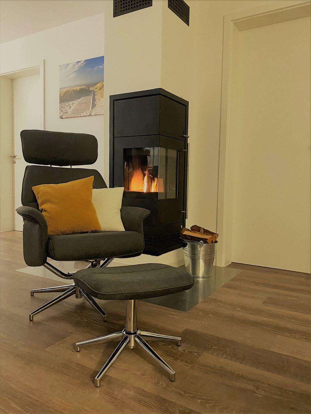 Der offene Wohnbereich mit Kamin rundet das Gesamtbild ab.