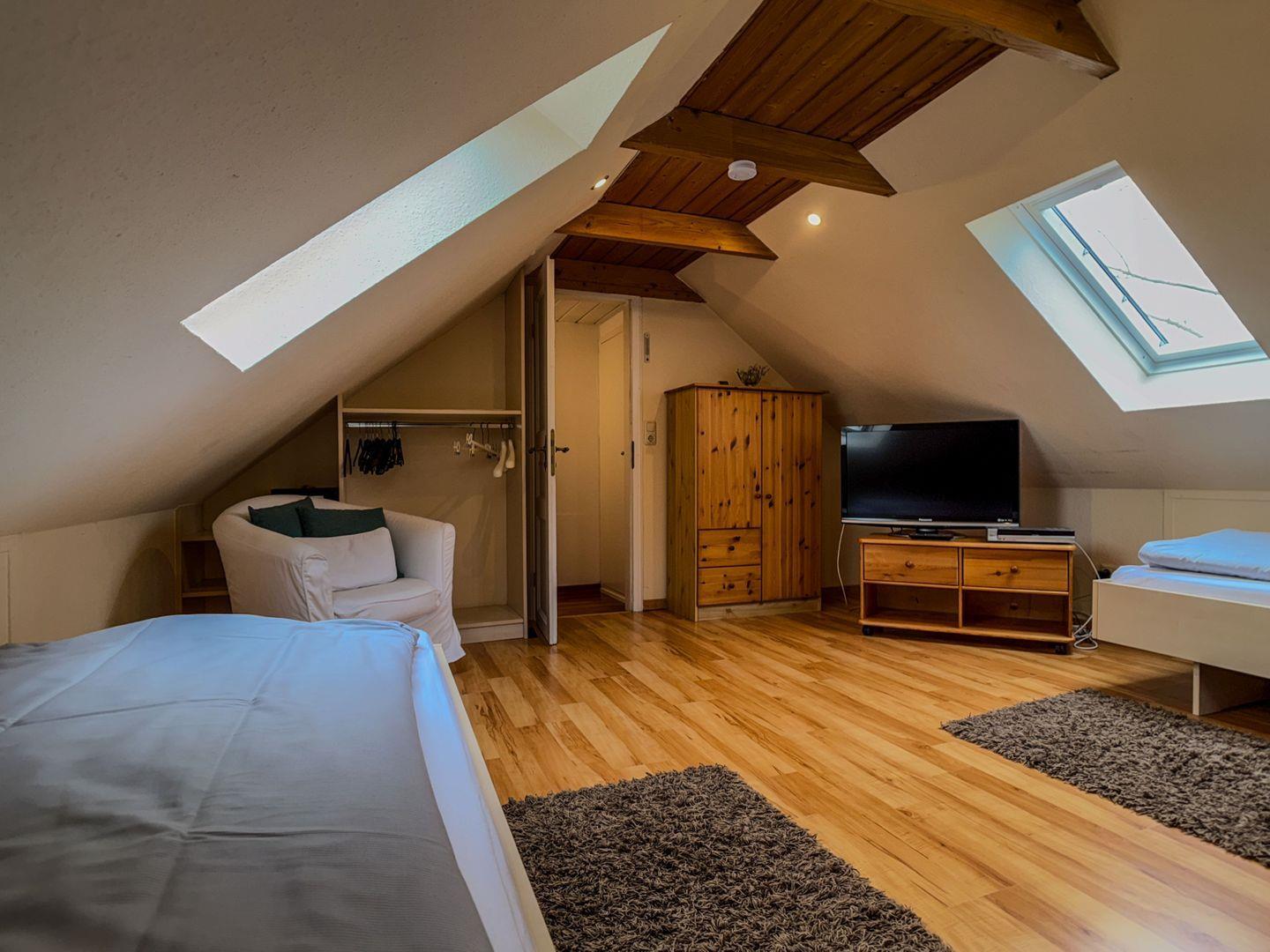 Im großen Bad mit Dusche und separater Badewanne finden Sie zudem eine Münz-Waschmaschine, ein Münz-Trockner ist ebenfalls vorhanden. Außerdem verfügt das Dachgeschoss über ein weiteres, kleines WC.